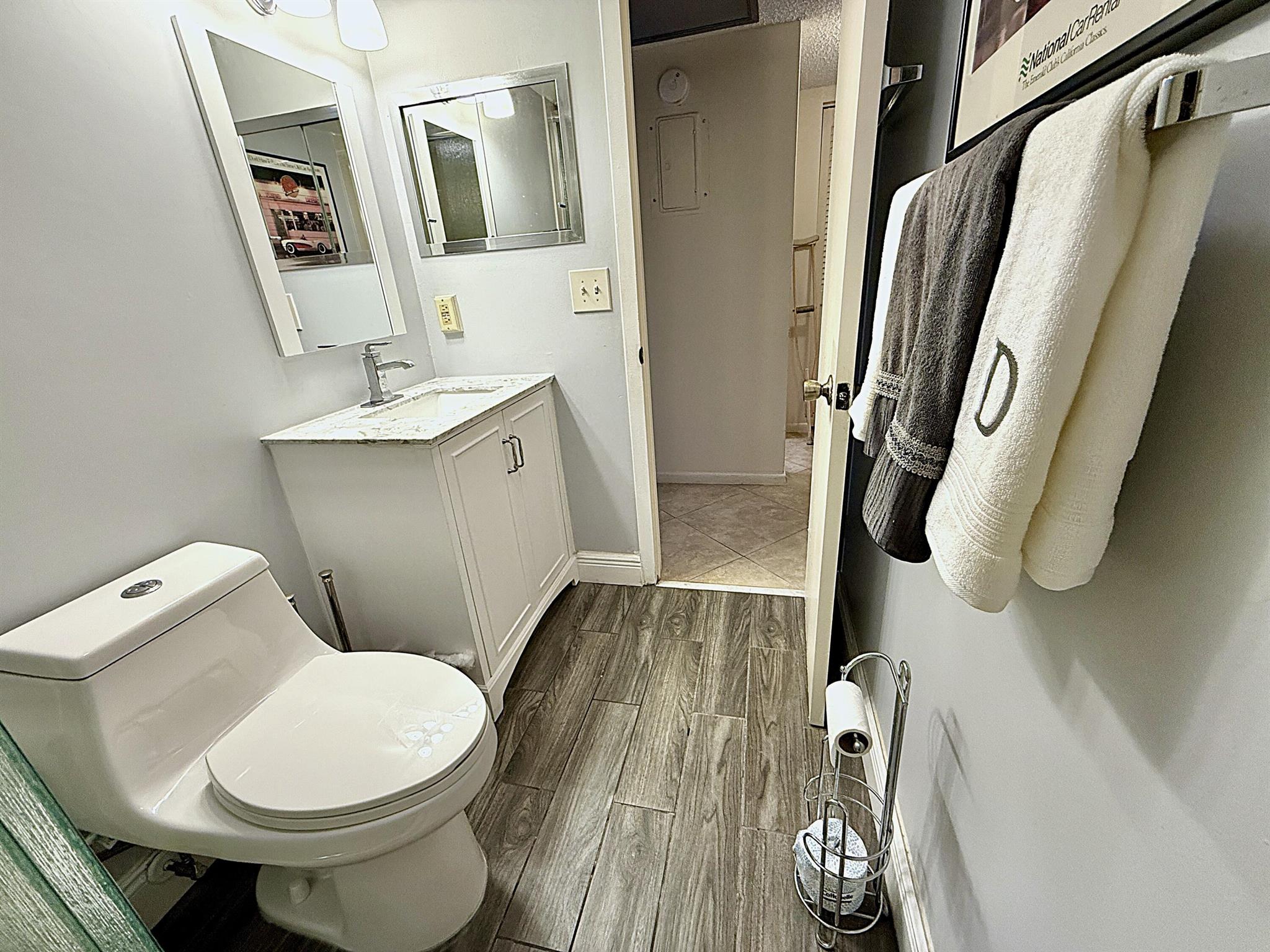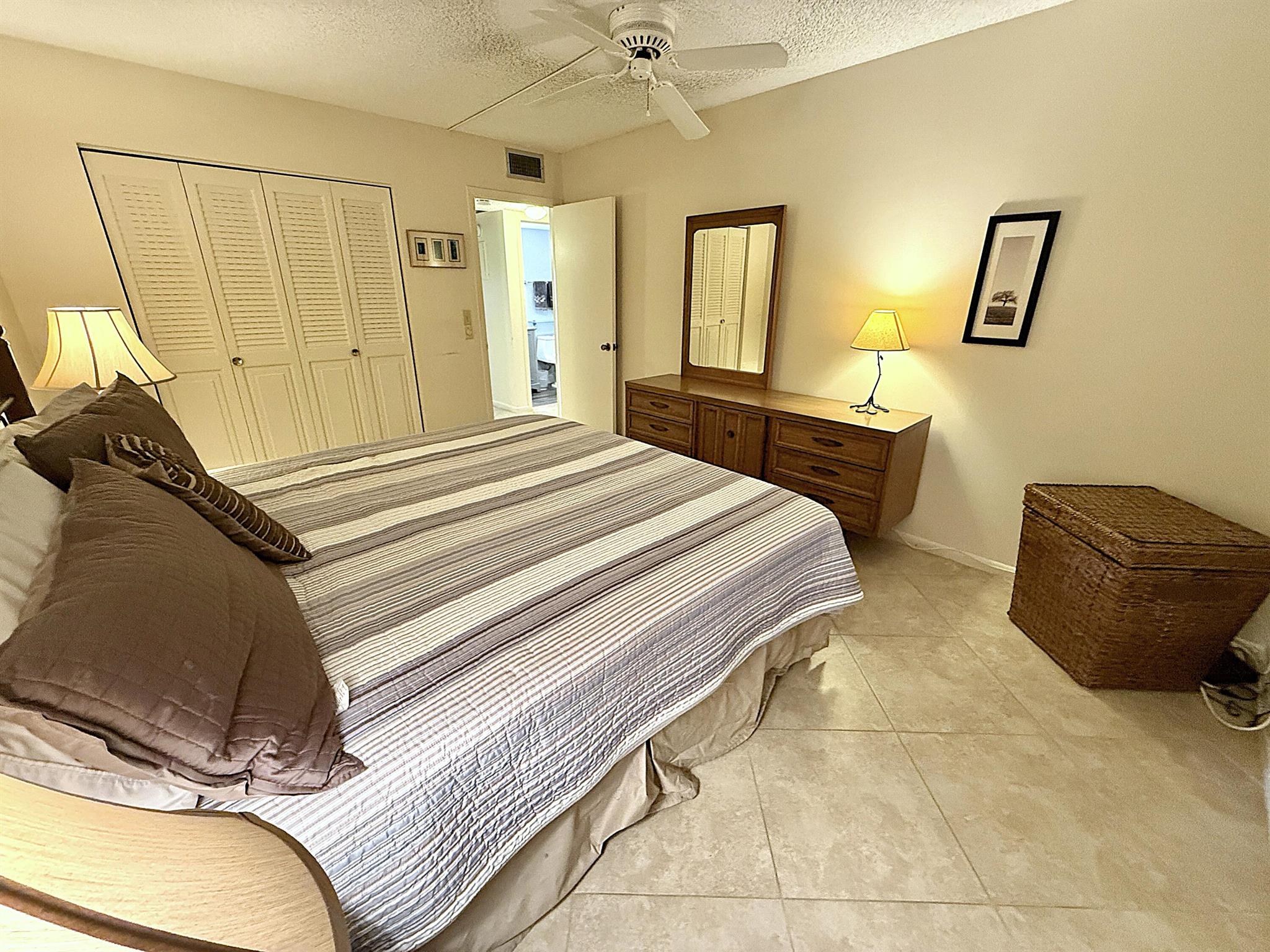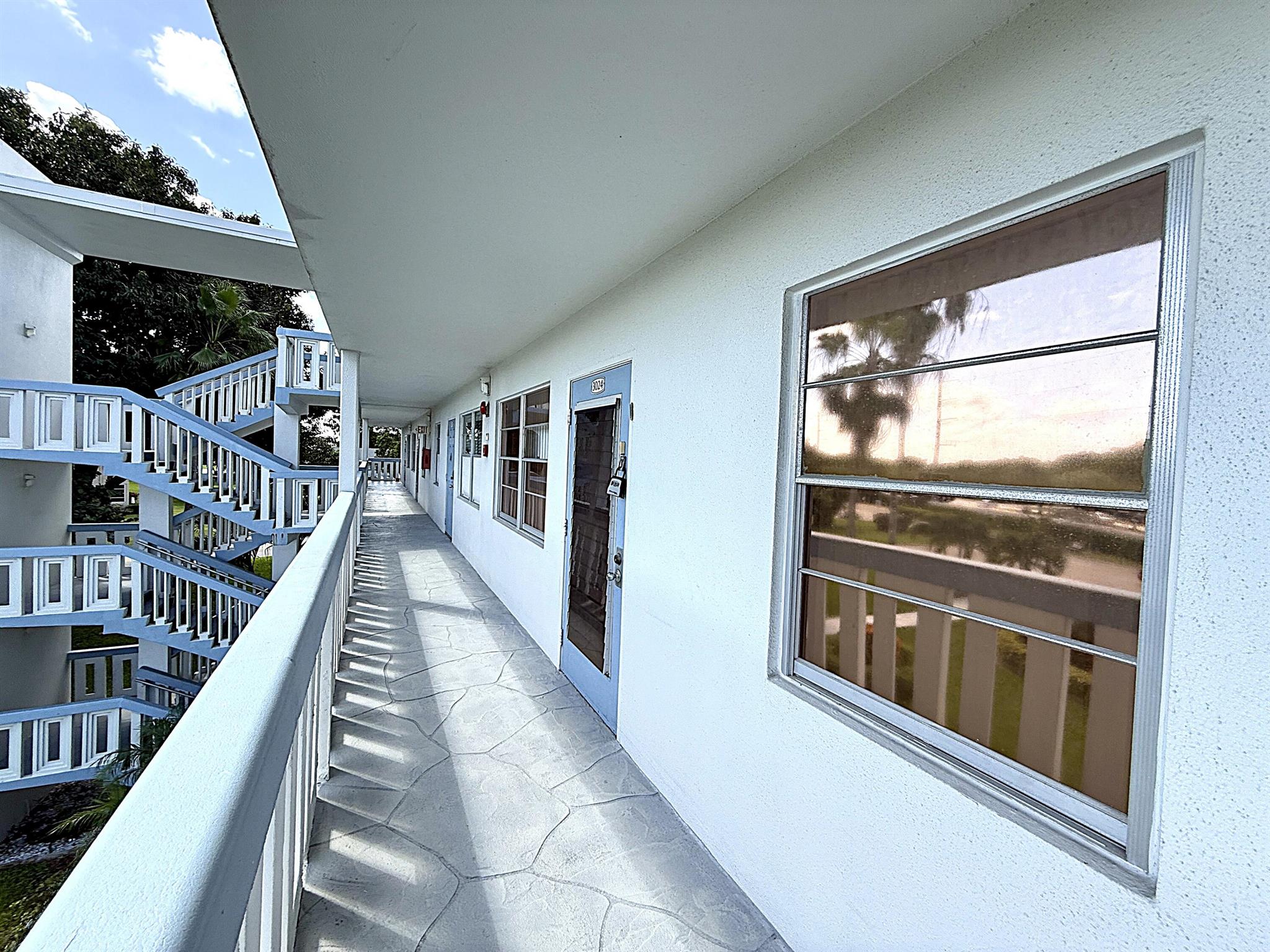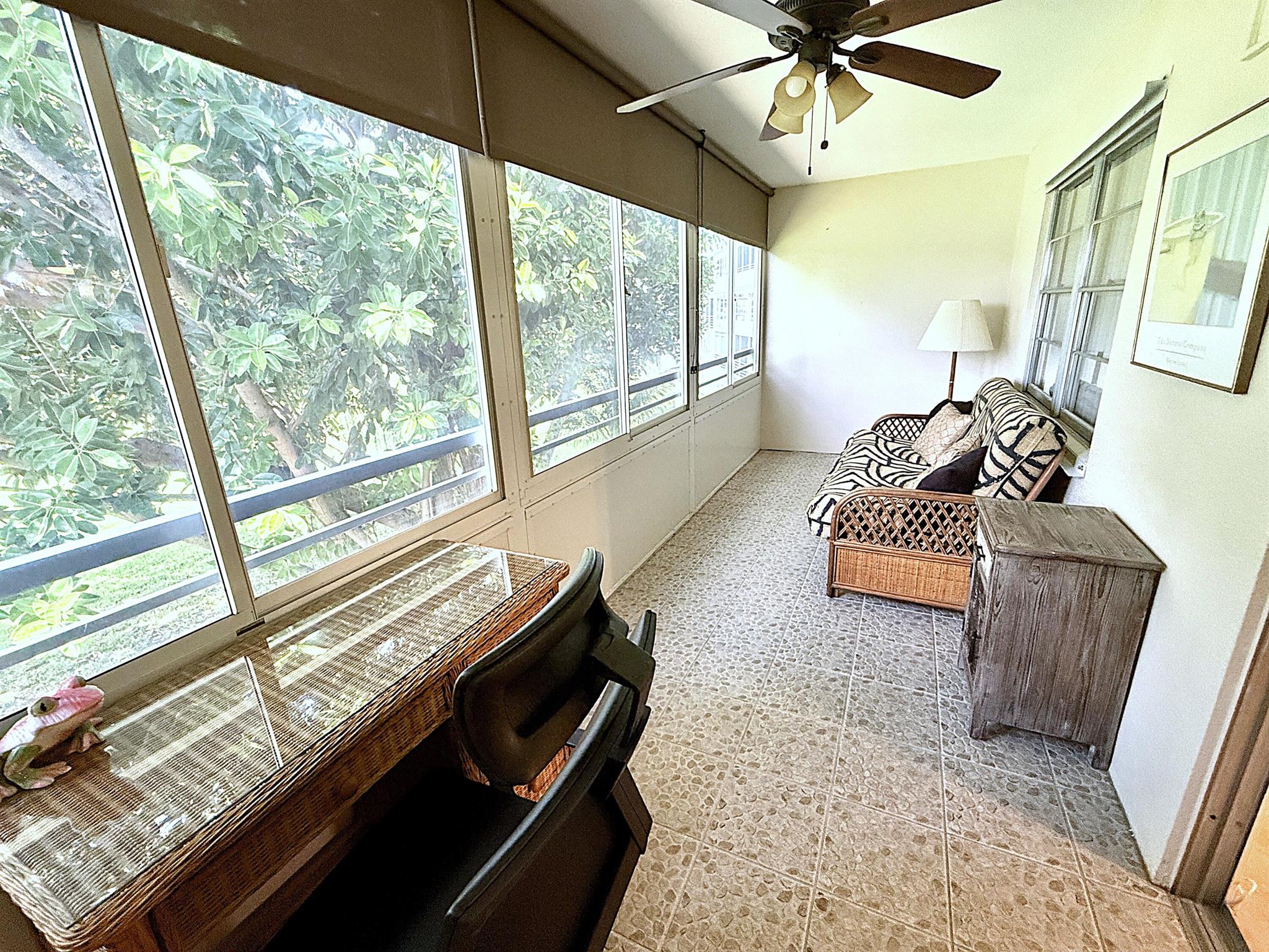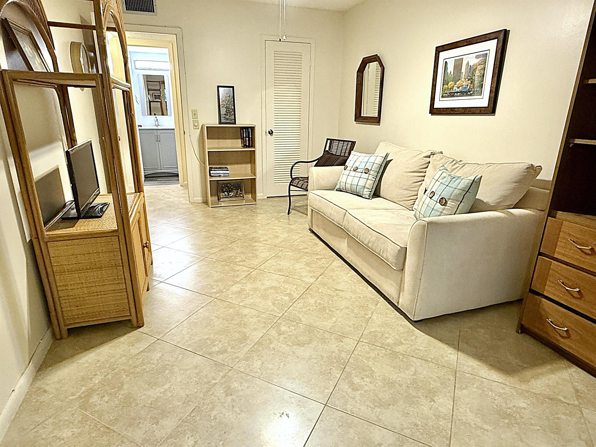 Lovely Garden View from Large Enclosed Patio. Enjoy this Lovely, Spacious 2 BR 1.5 Baths 860 SF Unit. Renovated Master Bath w/ Walkin Shower & Half Bath. Tile throughout unit. AC Age is approx 7 years. Walking Distance to Houses of Worship. Unit and Building well maintained. Walking distance to community pool. and pickle ball courts. Clubhouse has indoor+outdoor pools, cafe, 1600 seat theater, clubs, tennis, billiards, pickleball, volleyball, ping pong, bocce, shuffleboard, fitness center, hiking+bike trails, putting green. Close to beaches, entertainment, dining, shopping. 55+ age.