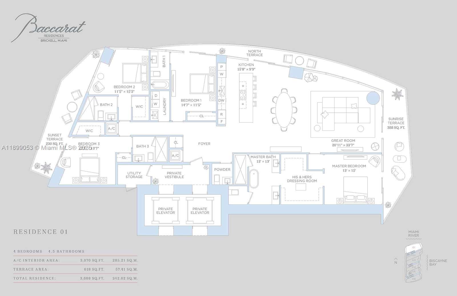 4 BD / 4.5 BA with 3,070 SF +627 SF OF TERRACE. BACCARAT RESIDENCES MIAMI, THE MOST ANTICIPATED LUXURY HIGHRISE IN BRICKELL, OFFERING THIS BEAUTIFUL NE CORNER (THE PREMIUM LINE), EXPERTLY DESIGNED WITH BESPOKE INTERIORS IN THIS FLOW-THROUGH RESIDENCE WITH INFINITE VIEWS OF BISCAYNE BAY, CITY LIGHTS AND THE MIAMI RIVER, DEEP TERRACES, 10 FT. CEILINGS, HIGH END FLOORING, ITALIAN KITCHEN CABINETS, SUB-ZERO/WOLF APPLIANCES, AND MUCH MORE. ELEGANT LOBBY, CAFE, ART GALLERY, WINE CELLAR, MULTIPLE EVENT ROOMS, PRIVATE MARINA, BOARDWALK, BAYFRONT POOL DECK, AND MUCH MORE. PRE-CONSTRUCTION OFFERING - DELIVERY FIRST QUARTER 2028