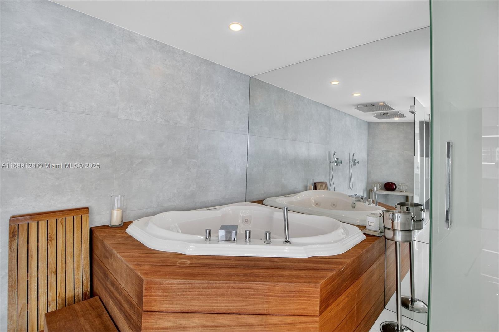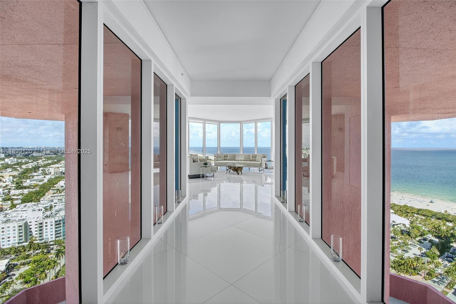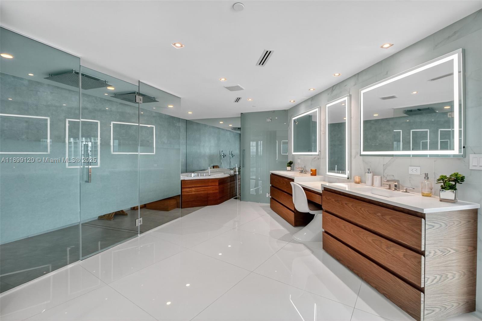 One of a kind, a dream home in the sky! 2-floor residence, boasting 5,450 SqFt to easily accommodate any special event or entertaining occasion. Mega sized flow-through living room and open kitchen with a bridge encased in glass leading to an 800+ SqFt panoramic Great Room. Endless direct views of the Atlantic Ocean, Biscayne Bay, Miami Skyline, and South Beach both day and night with incredible sunrises and sunsets. The lower floor of this townhouse offers all 3 bedrooms, providing excellent privacy and separation of space. The master bedroom overlooking the ocean offers his and hers bathrooms and closets, spa-like bathroom including a double rain shower and separate large jacuzzi tub with an ocean view.