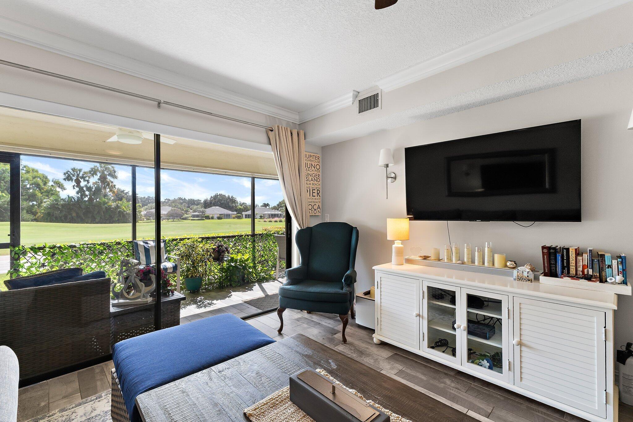 Beautifully renovated and move-in ready, this stunning home offers golf course views right from your patio on the 18th hole. The open-concept layout features a recently remodeled kitchen with white shaker cabinetry, herringbone polished marble backsplash, quartz countertops, stainless steel appliances, and upgraded LED lighting.Elegant details are found throughout, including crown molding, 5'' baseboards, gray wood-look tile flooring, remote-control ceiling fans with adjustable lighting, and newly updated bathrooms. A 2020 A/C system and 2018 hot water heater provide modern comfort and peace of mind, while the tiled patio creates an inviting outdoor space to relax or entertain.