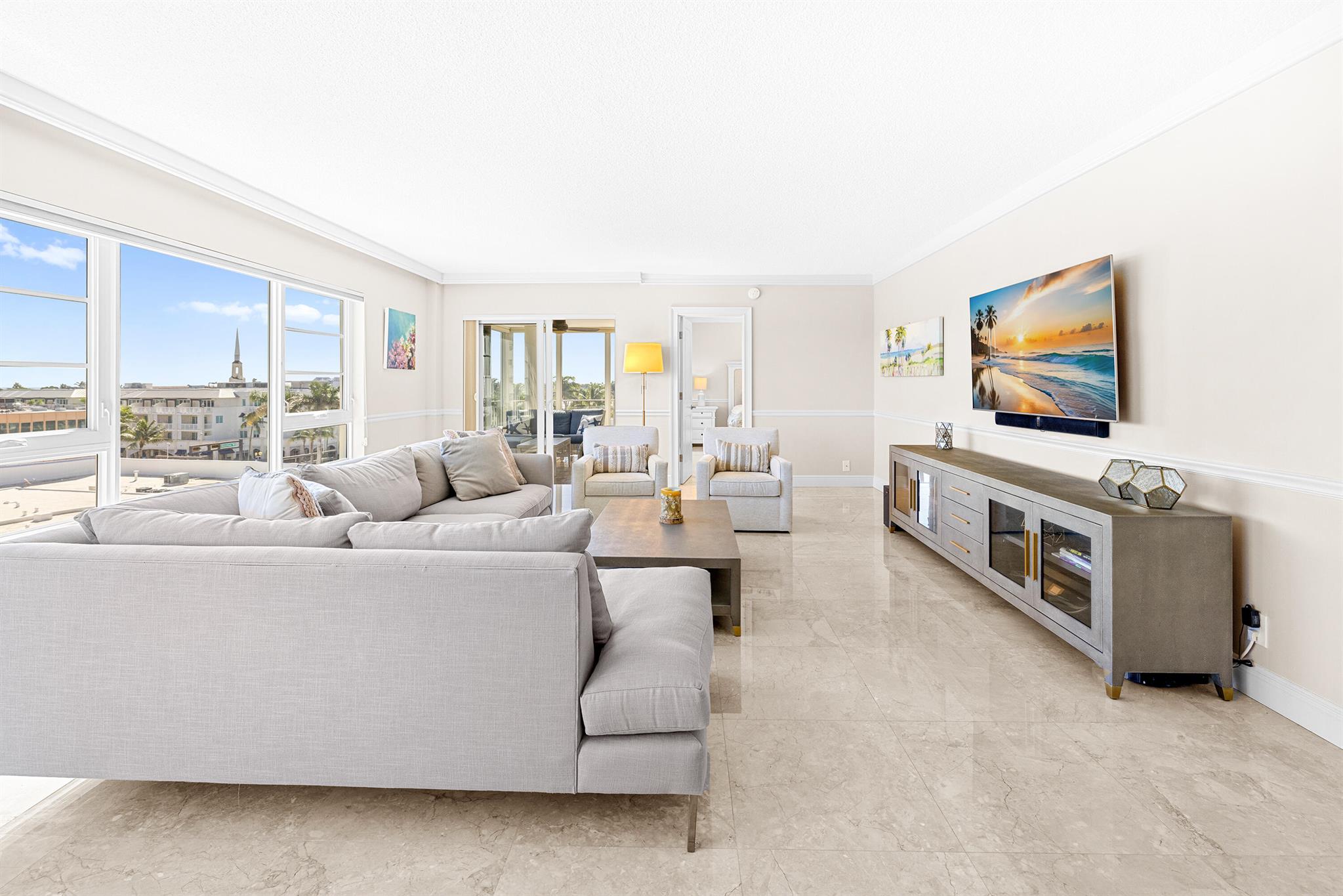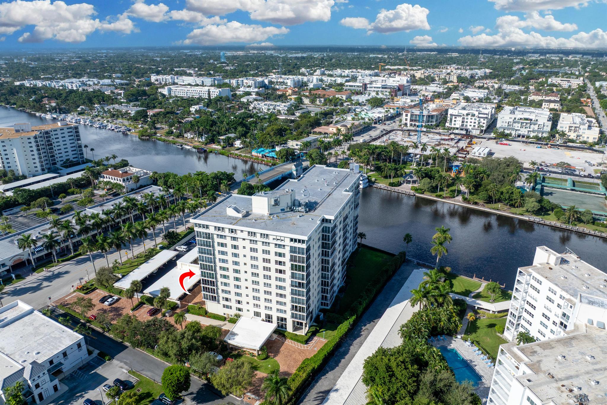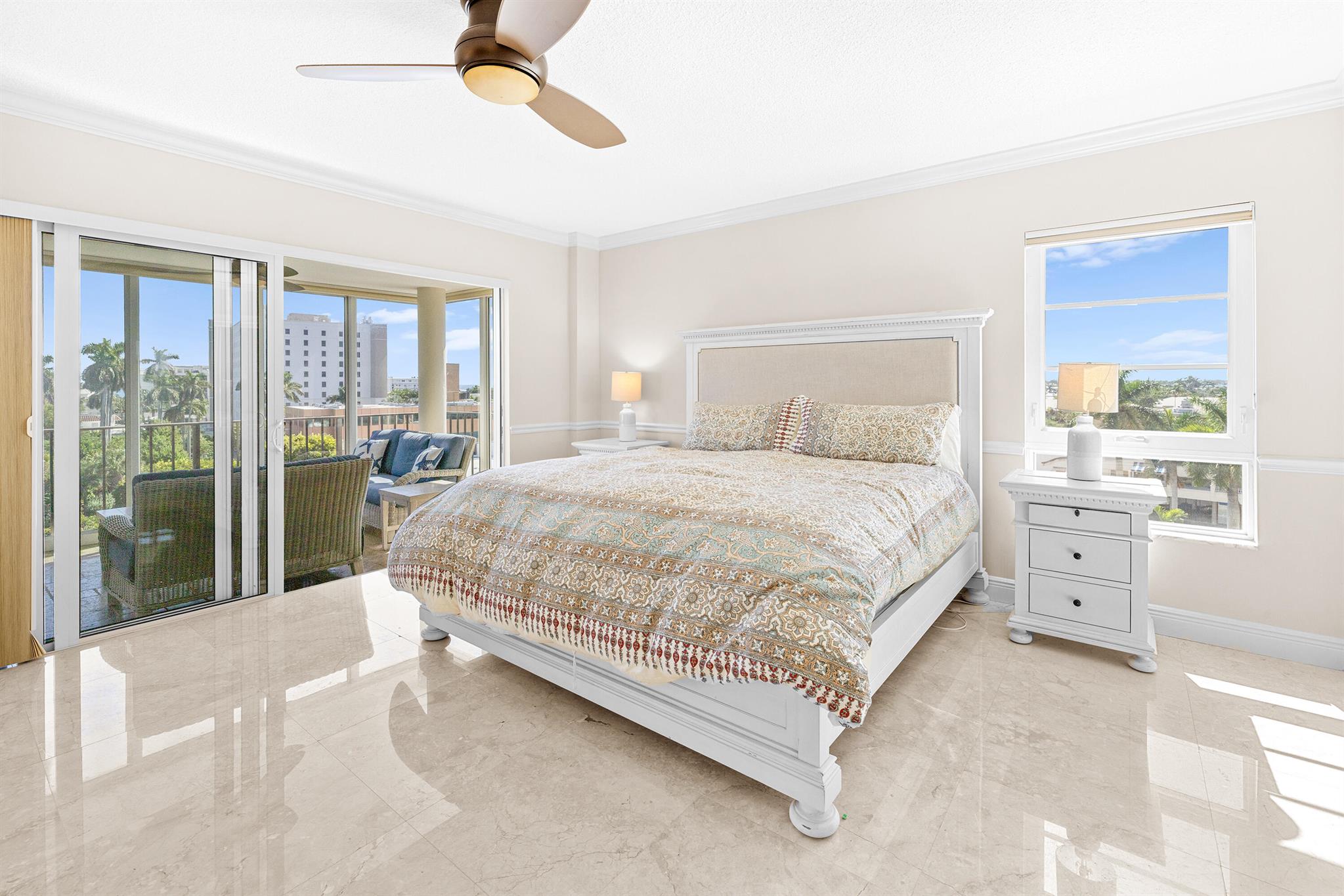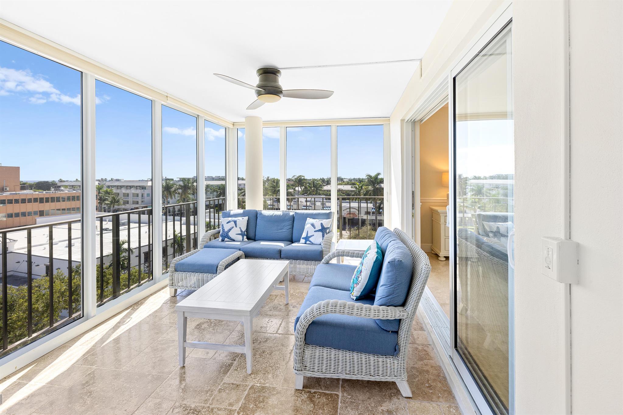 Spacious 2-bedroom, 2-bath corner unit is one of the largest units available in this full-service building in desirable Delray Beach. This southeast-facing condo enjoys bright morning light and city views from an oversized, fully enclosed 19' x 11' balcony overlooking the water. This unit features hurricane-impact windows, in-unit washer and dryer, and a brand-new A/C system. The open layout includes a formal dining area and a modern eat-in kitchen with recessed lighting, custom wood cabinetry, stainless steel appliances, and granite countertops. The split-bedroom floor plan provides privacy, with the primary suite and second bath both offering walk-in showers.