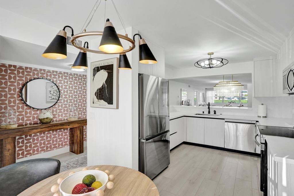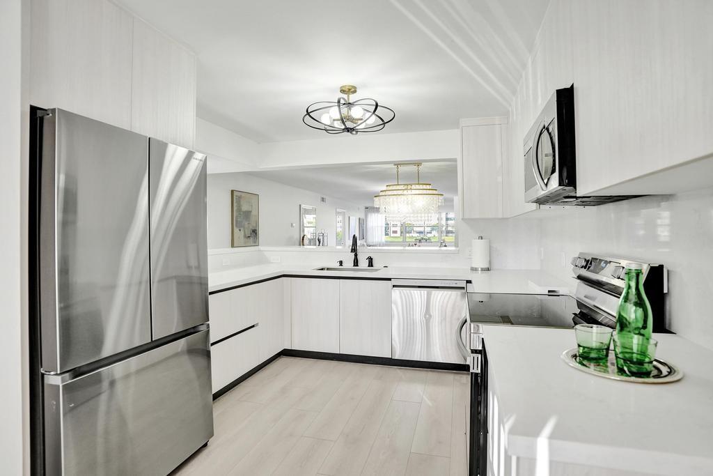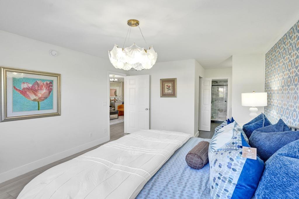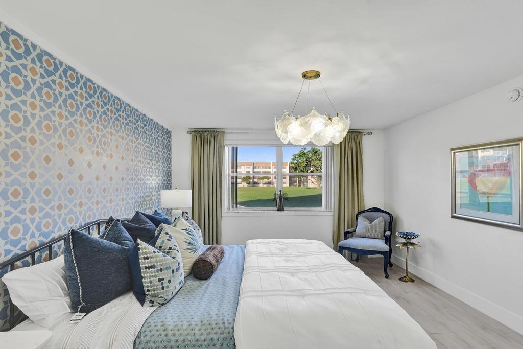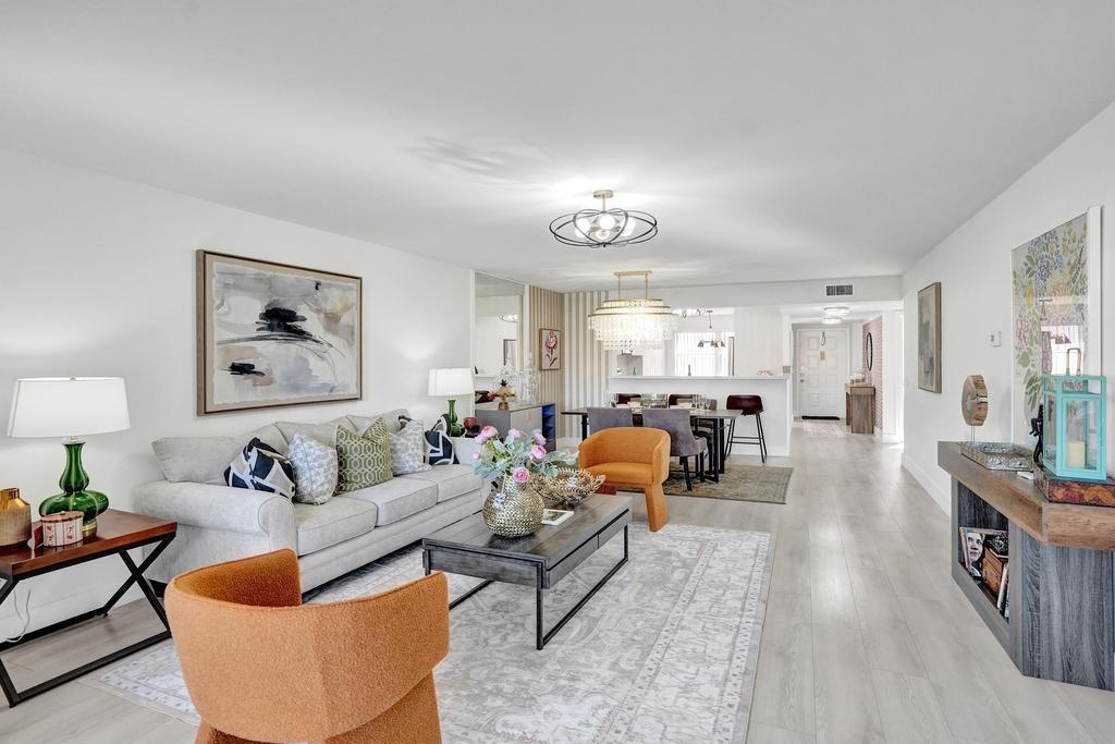 Stunning fully remodeled 1,370 SF first-floor residence blending luxury, comfort & timeless style. This split floor plan features 2 bedrooms + versatile office/den & 2 baths, open-concept layout w/ tons of natural light, serene lake & golf course views. The gourmet kitchen impresses w/ brand-new stainless steel appliances, quartz countertops, elegant cabinetry & designer finishes. Every detail was meticulously curated; new washer/dryer, water heater, upgraded electrical & hand-painted accent walls. Offered fully furnished or unfurnished, w/ parking right at your front door. Spacious laundry/utility rm w/ storage adds convenience. Vibrant 55+ community (one resident must be 55+,others 16+) offers golf, tennis, pools, clubhouse, live entertainment, theater, shuttle service & strong reserves.