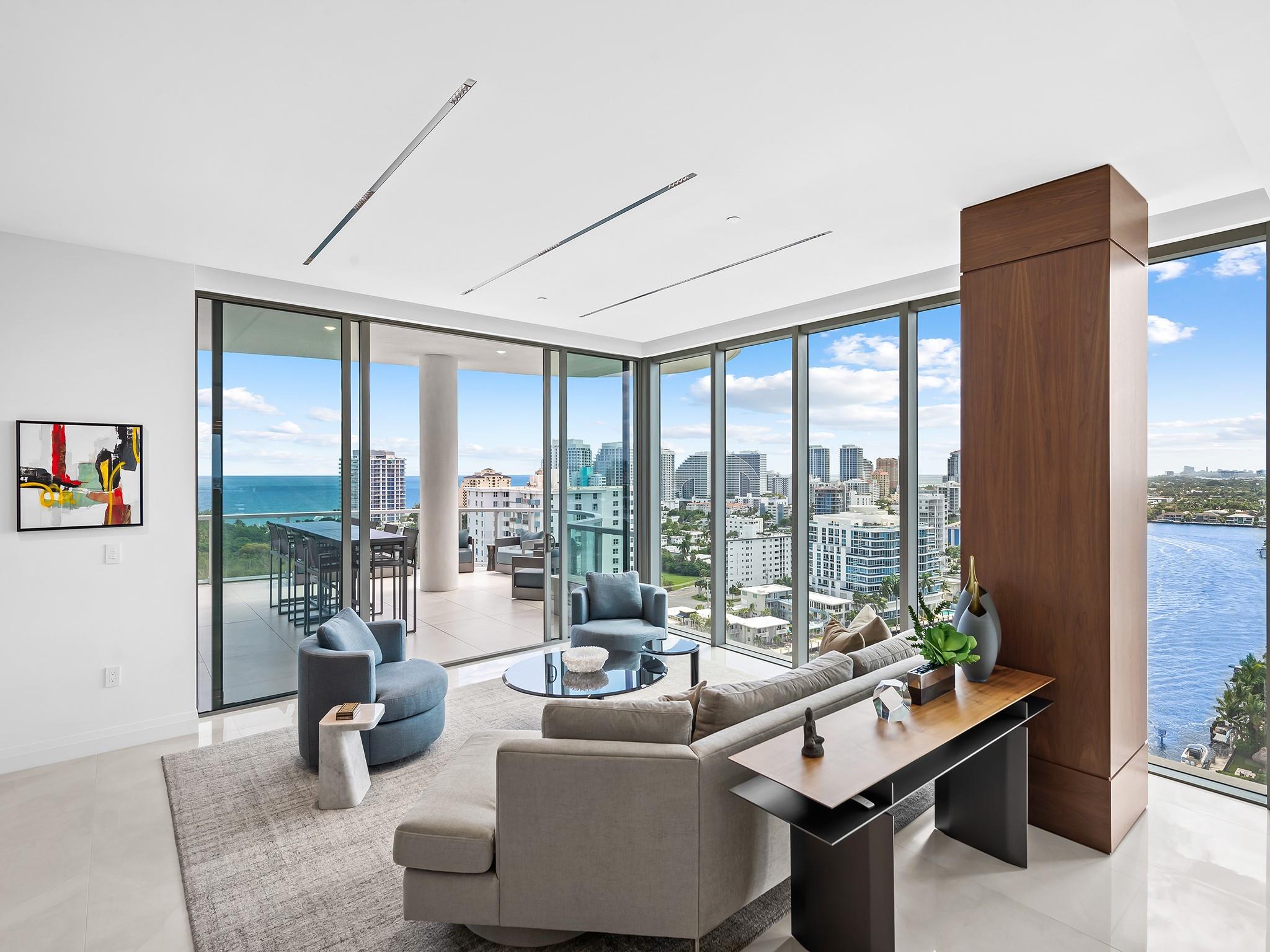 Inspired by a new level of luxury, this unprecedented penthouse commences with breathtaking views over the ocean, Intracoastal waterway & city skyline through floor to ceiling walls of glass that invite an abundance of natural light over the open floor plan & multiple living spaces. Striking architectural details, curated finishes & state of-the art lighting provide a sophisticated lifestyle. Expansive terraces with a summer kitchen extend interior living & entertainment areas into the sky. The epicurean kitchen with an abundance of cabinets & upgraded appliances will inspire those who entertain & cook. The primary suite boasts the ultimate retreat: a custom walk-in closet & spa inspired bathrm. Control 4 technology, turnkey/fully furnished, 3parking spaces & add'l storage. Sqft from BCPA