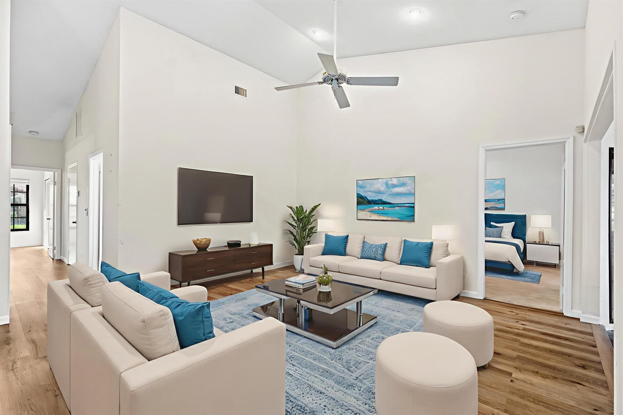 Welcome to this beautifully maintained 3-bedroom, 2-bath villa with stunning long lake views in a desirable 55+ community! Enjoy peace of mind with all-new impact windows, elegant Hunter Douglas blinds, and a recently renovated kitchen that perfectly blends style and functionality. New flooring throughout adds a fresh, modern touch. The community offers a resort-style lifestyle with all the amenities you could want or need--move in and start enjoying the good life! NO MANDATORY MEMBERSHIP