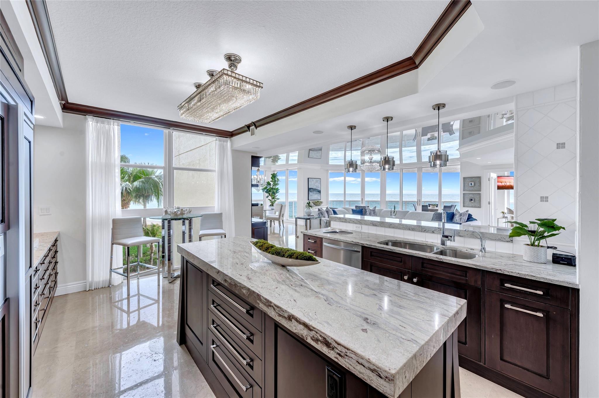 Beach House vibe in this exquisite residence embraced by sand & sea at L'Hermitage-premier luxury gated comm. w/ over 10 acres of prime oceanfront. This corner residence just above the sand, provides direct access to the pool & recreation deck located on the same fl. Incredible wraparound terrace w/ unobstructed views of the ocean waves. Open kitchen w/ island & breakfast nook framed by spectacular ocean views complemented by reflective ceilings in living area. Upon arriving home enjoy direct elevator access from lobby, opening into private foyer w/ stylish glass entry door. Resort-style amenities incl: tennis courts, poolside café, concierge, each attendant, pet park & more. 2 pets are welcome. Included 2 parking spaces & valet serv. Main. fee incl. a credit at L'Hermitage Bar & Grill