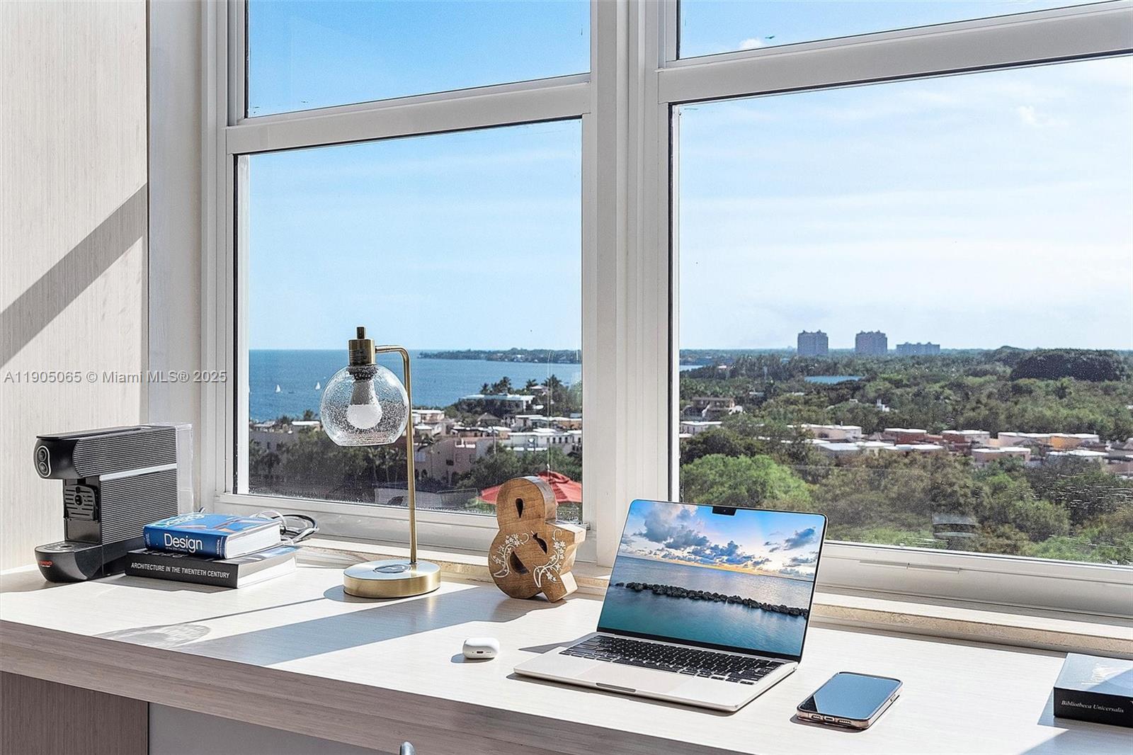 elevated living in this rare offering in the heart of Coconut Grove. This beautifully renovated 2-bedroom, 2-bath residence showcases breathtaking panoramic views of Biscayne Bay and the lush Grove canopy. Thoughtfully designed with high-end finishes throughout, the open layout features a sleek chef’s kitchen, custom cabinetry, premium appliances, and spa-inspired bathrooms. Floor-to-ceiling glass frames unforgettable sunsets,expansive balcony invites seamless indoor/outdoor living. The primary suite feels like a private retreat with water views and abundant closet space. Perfect as a full-time residence, seasonal escape, or investment property—this home also offers strong income-producing potential, in a building well-known for flexibility and desirable rental opportunities.