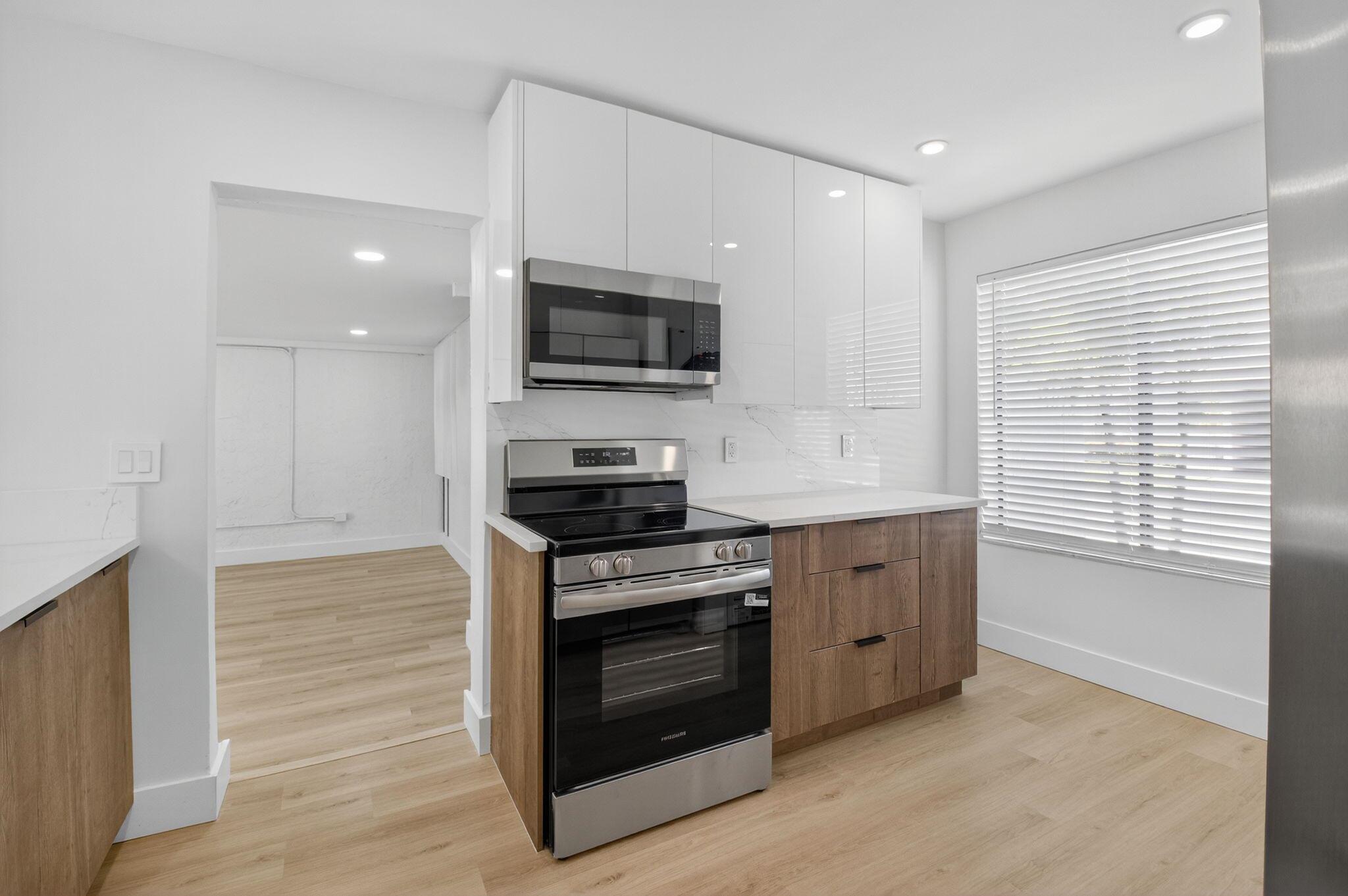 STUNNING REMODEL! This gorgeous 2BR/2BA villa in a 55+ community is fully updated with NEW roof, NEW AC, NEW electrical panel, NEW stainless appliances, NEW washer & dryer, NEW patio screen, and NEW fence all completed 2025. Enjoy open-concept living with modern finishes--high-gloss and wood-tone cabinets, quartz counters, and matching backsplash. Both baths feature frameless glass showers and LED mirrors. Vinyl flooring, recessed lighting, and stylish fixtures throughout. (living/dining room and master bedroom room pictures are virtually staged). Low HOA ($290/mo) includes lawncare, community pool & clubhouse. Prime location near Downtown Delray, Atlantic Ave, beaches, restaurants, shopping & Delray Med Center. 650 credit score required by HOA. Move-in ready--schedule your showing today!