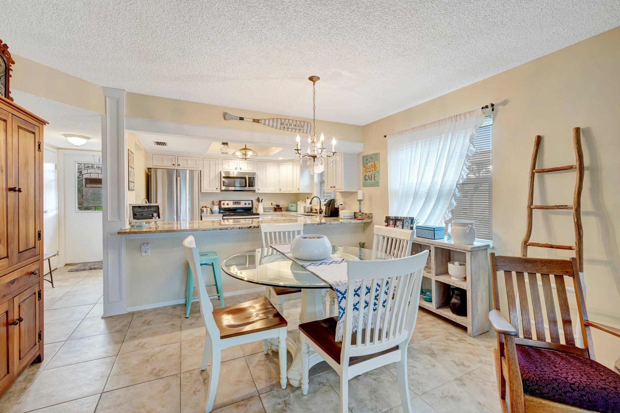 Nestled in a peaceful corner of a desirable 55+ community, this beautifully updated 2nd-story condo offers the perfect blend of comfort and convenience, and security with High Impact Windows. 2 spacious bedrooms, 2 bathrooms, and 1,134 square feet of thoughtfully designed living space, this home is a true gem. The master suite has been elegantly remodeled to feature a stunning tile shower, ensuring your private retreat feels like a spa. The open-concept floor plan is perfect for entertaining, seamlessly connecting the large kitchen--a chef's dream, boasting custom cabinetry, granite countertops, stainless steel appliances, and a generous granite breakfast bar--to the inviting living and dining areas.