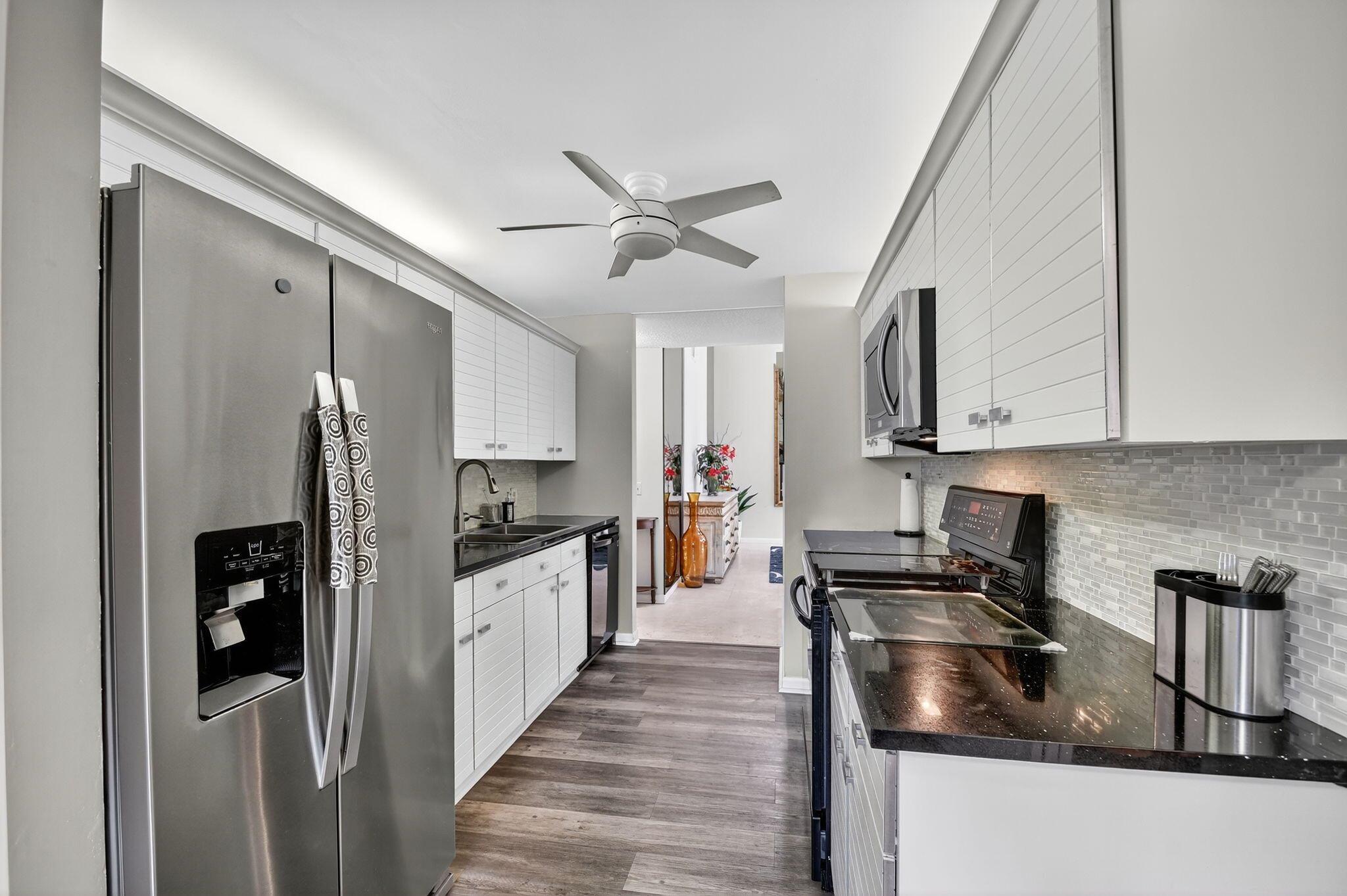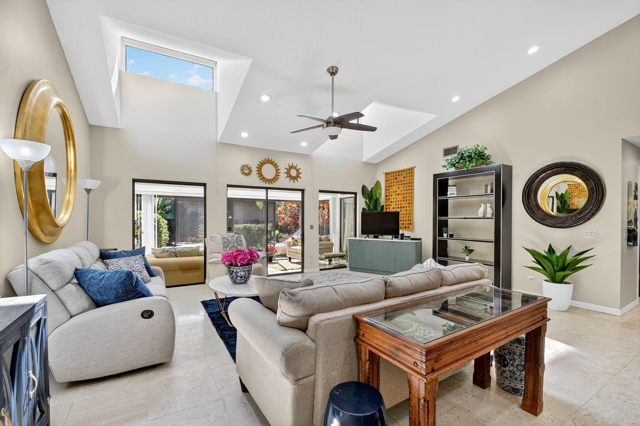 All ages community! Welcome to this elegant 3-bedroom, 2.5-bath corner villa nestled within the gated community of The Fountains of Palm Beach. Offering 2,046 square feet of beautifully designed living space, this residence impresses with vaulted ceilings, skylights, and a bright, open floor plan.HOA covers Water, Roof replacement+ maintenance, Trash, Cable, Wi-Fi, Building Insurance, Driveway + front door painting, 24/7 Security patrol, Manned gate. Roof was replaced in 2018.The modern kitchen features sleek finishes and flows seamlessly into the spacious living and dining areas, ideal for both relaxation and entertaining. A glass-enclosed Florida room extends your living space, opening to a private patio perfect for enjoying Florida's year-round sunshine.