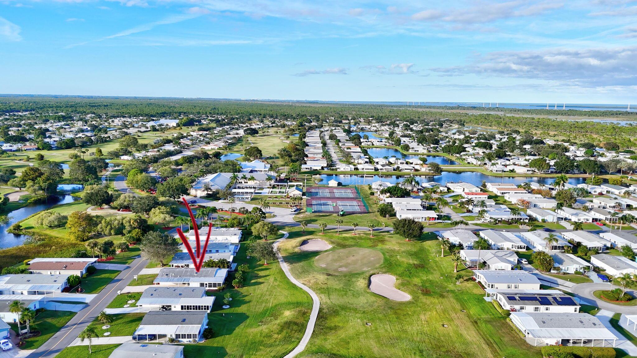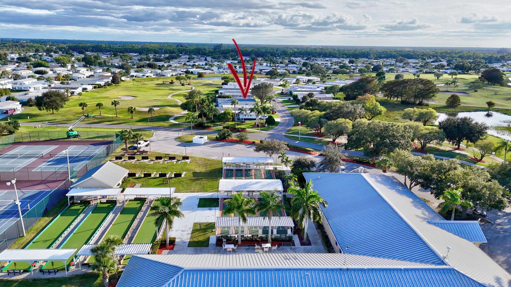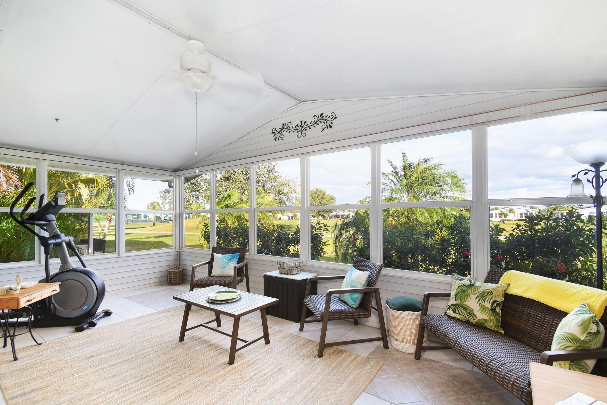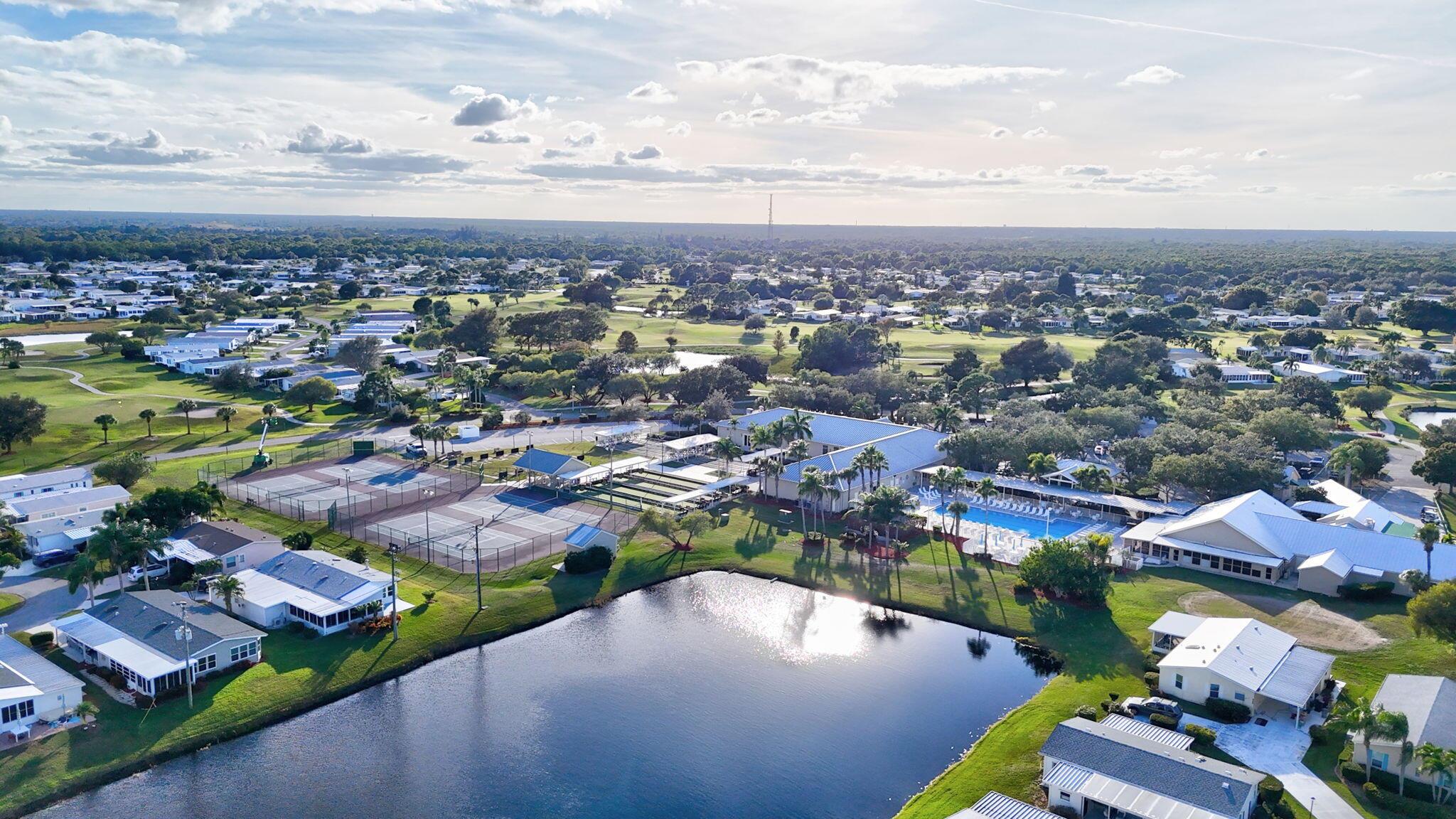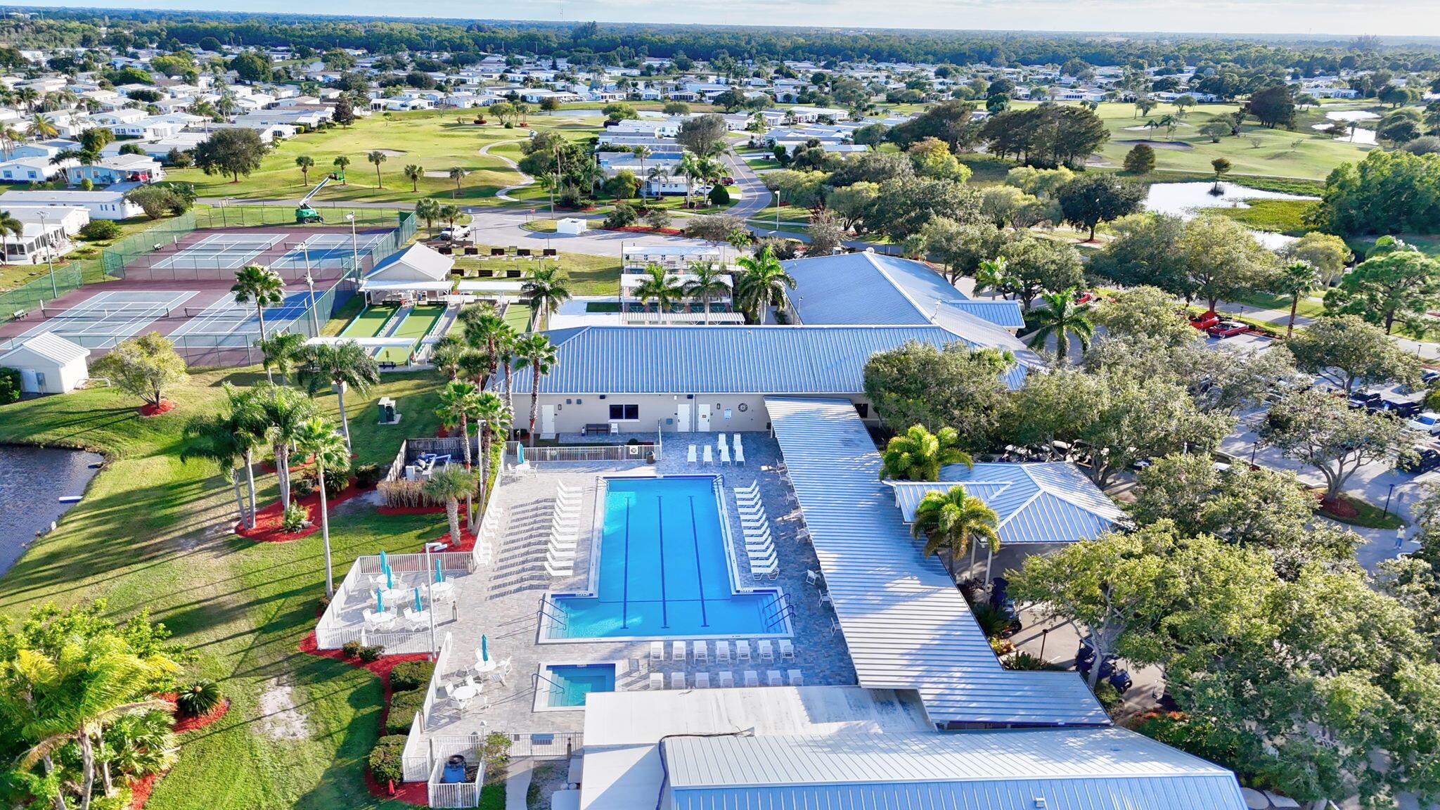 Land-Owned turn-key on the 18th hole of Savanna Club golf course. Walk to the Cove, tennis courts, shuffleboard, bocce ball, Fairways pool, and cafe! Perfect location! This home features upgraded kitchen with granite counters and white cabinets. Tile and laminate flooring in living areas. Interior laundry room. Wood grain barn doors in guest bedroom with extra shelving in the closet. Barn door to laundry room. Primary bedroom with sitting area. Primary bathroom with dual sinks, garden tub, & separate shower. Two enclosed patios, one being used as a workshop. All tools excluded from sale. Shed for storage.