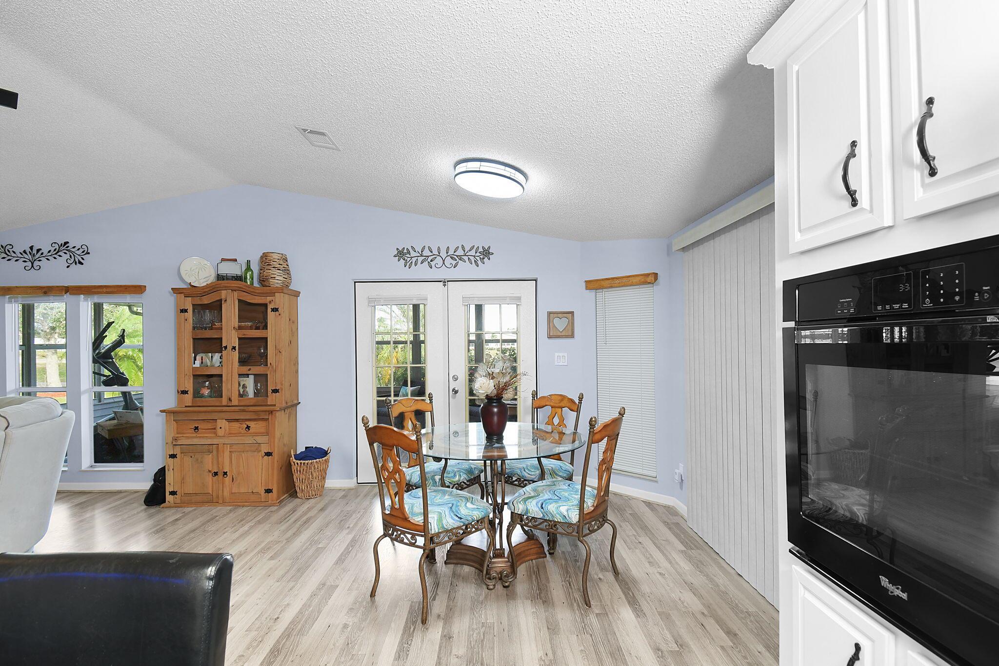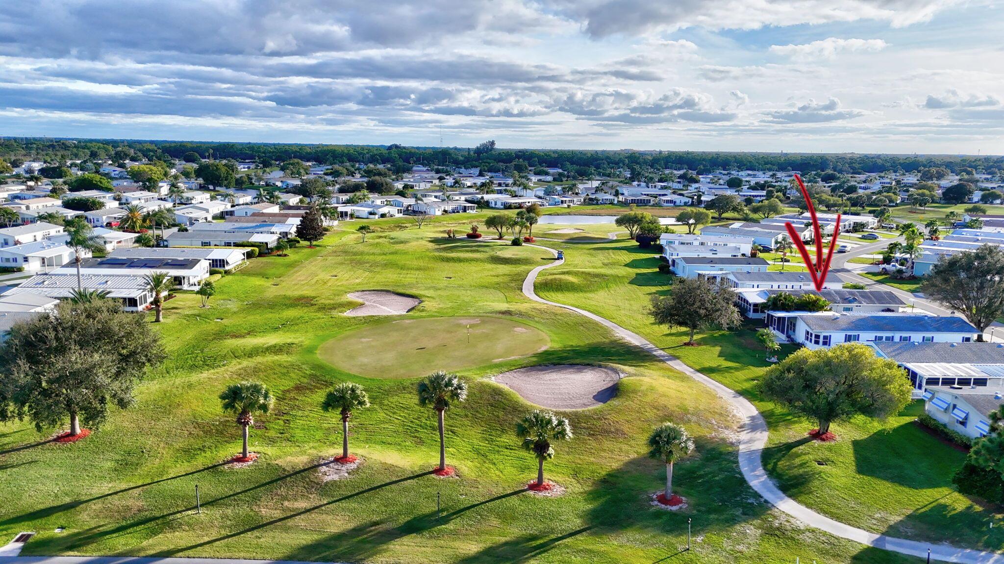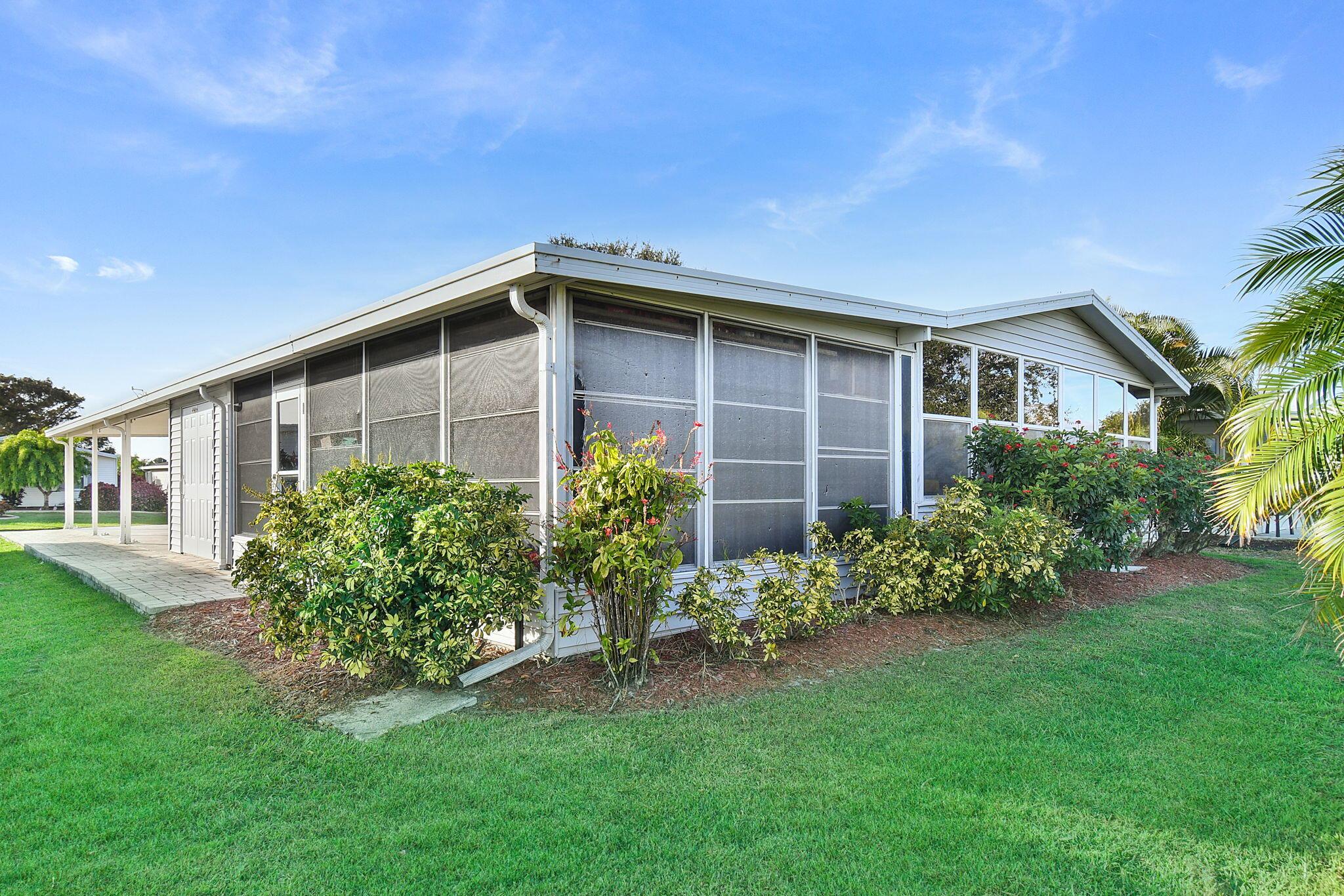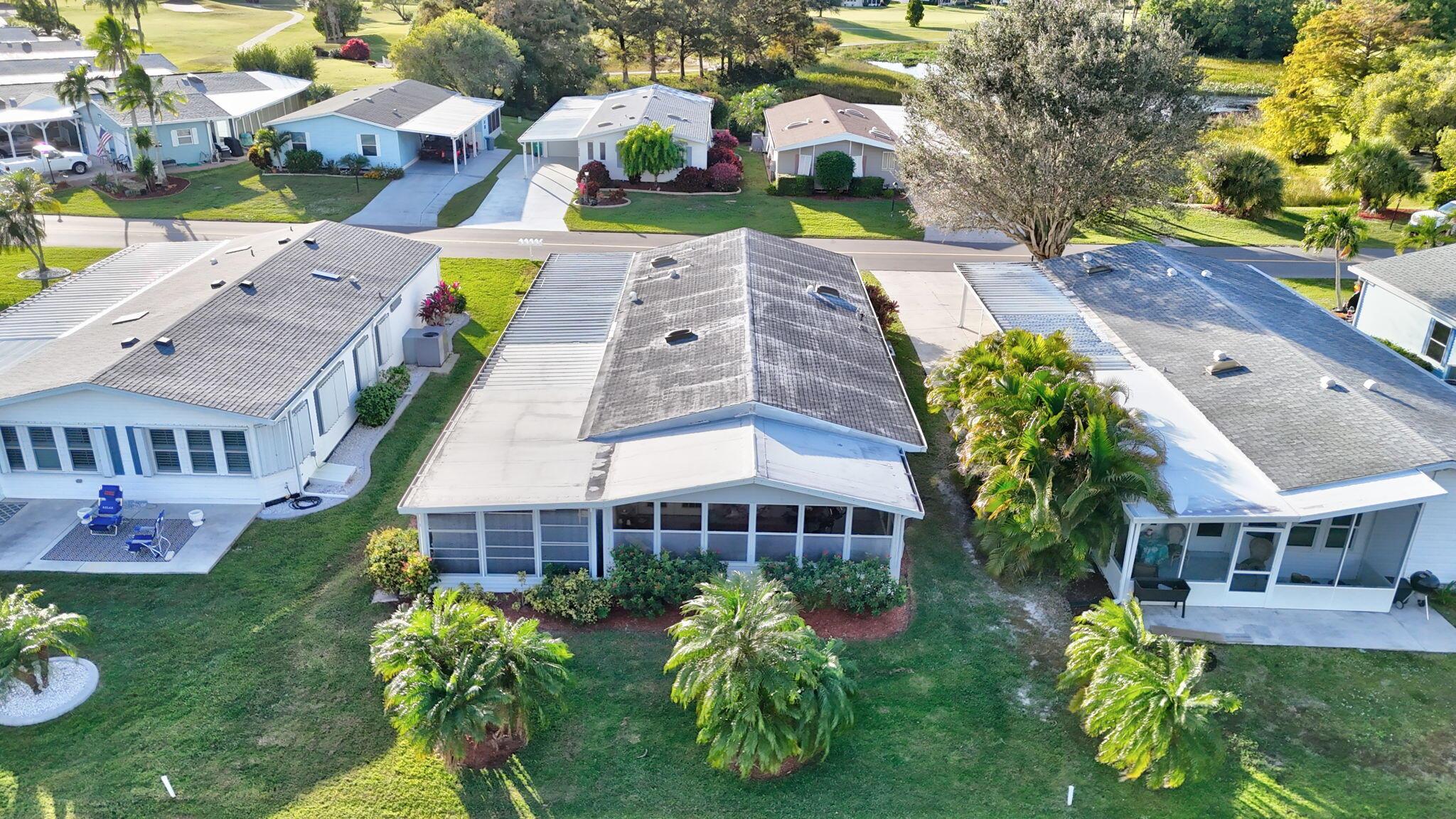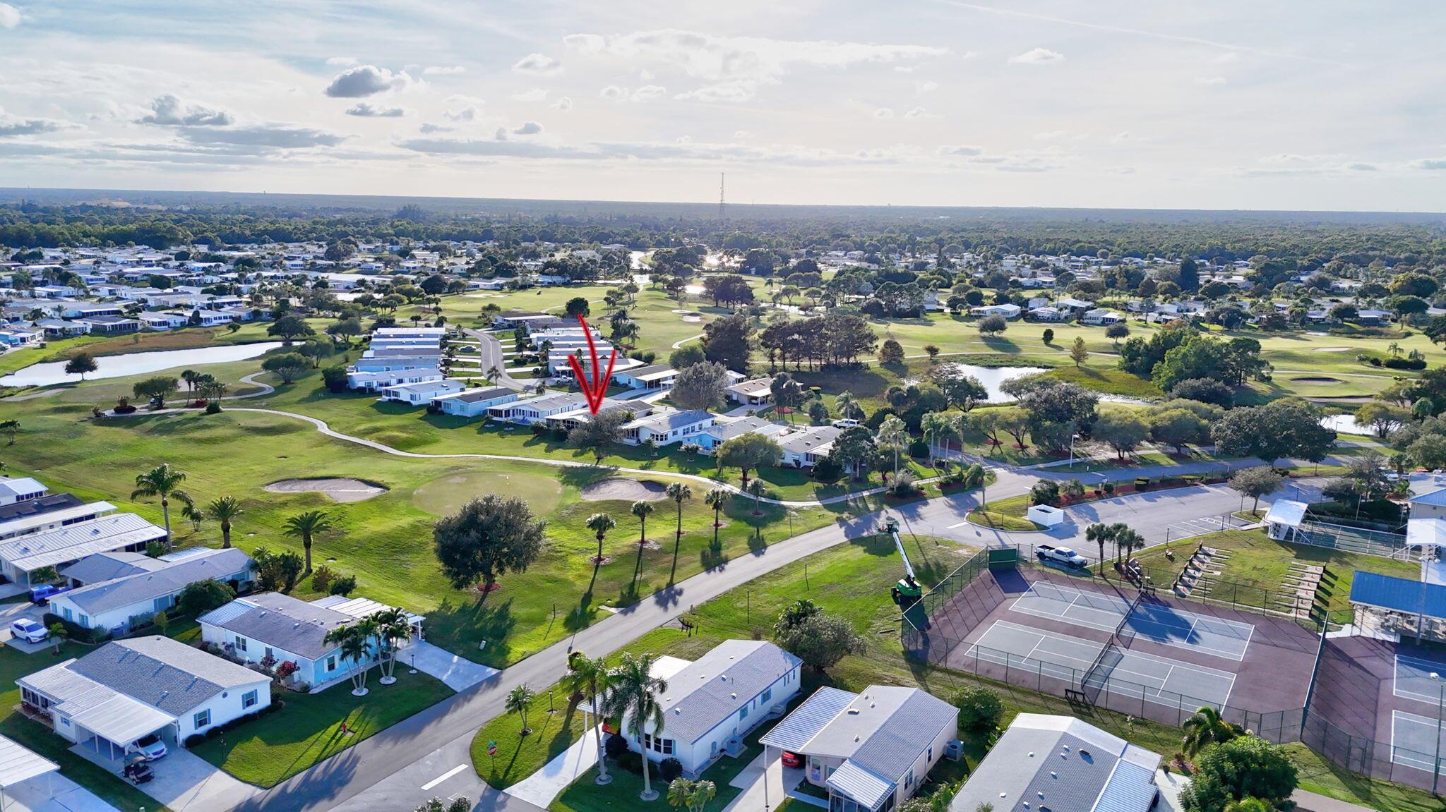 Land-Owned turn-key on the 18th hole of Savanna Club golf course. Walk to the Cove, tennis courts, shuffleboard, bocce ball, Fairways pool, and cafe! Perfect location! This home features upgraded kitchen with granite counters and white cabinets. Tile and laminate flooring in living areas. Interior laundry room. Wood grain barn doors in guest bedroom with extra shelving in the closet. Barn door to laundry room. Primary bedroom with sitting area. Primary bathroom with dual sinks, garden tub, & separate shower. Two enclosed patios, one being used as a workshop. All tools excluded from sale. Shed for storage.