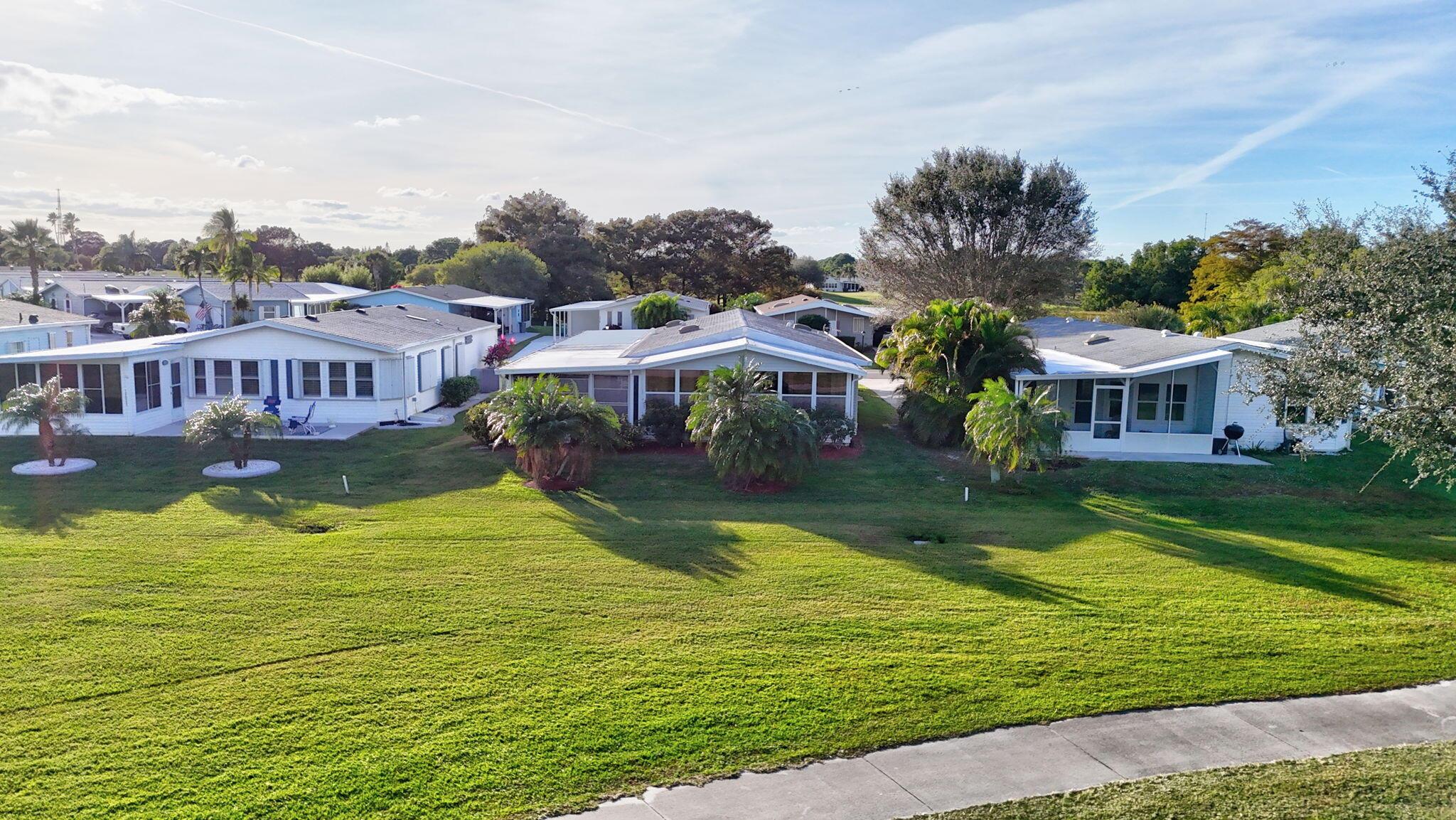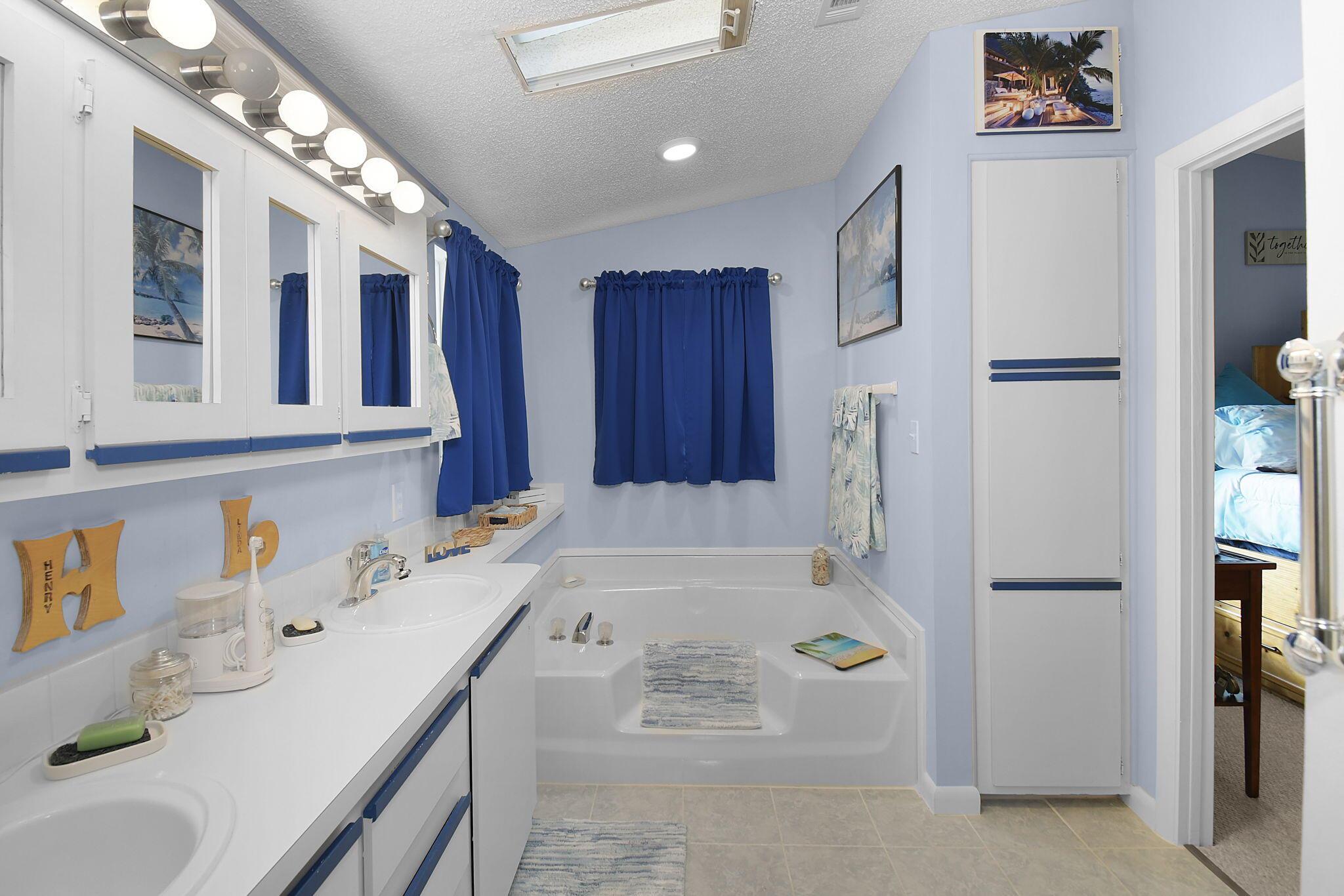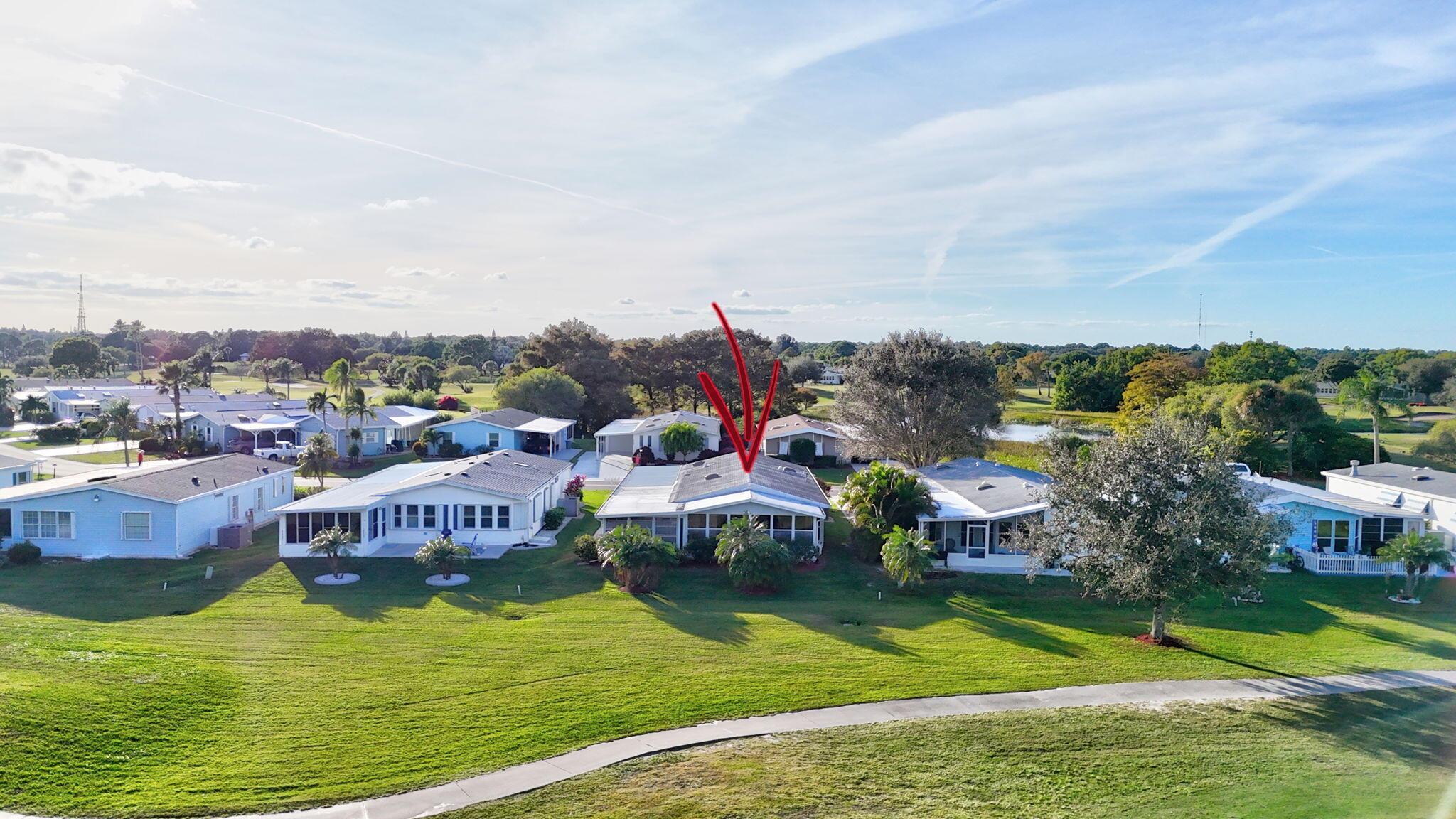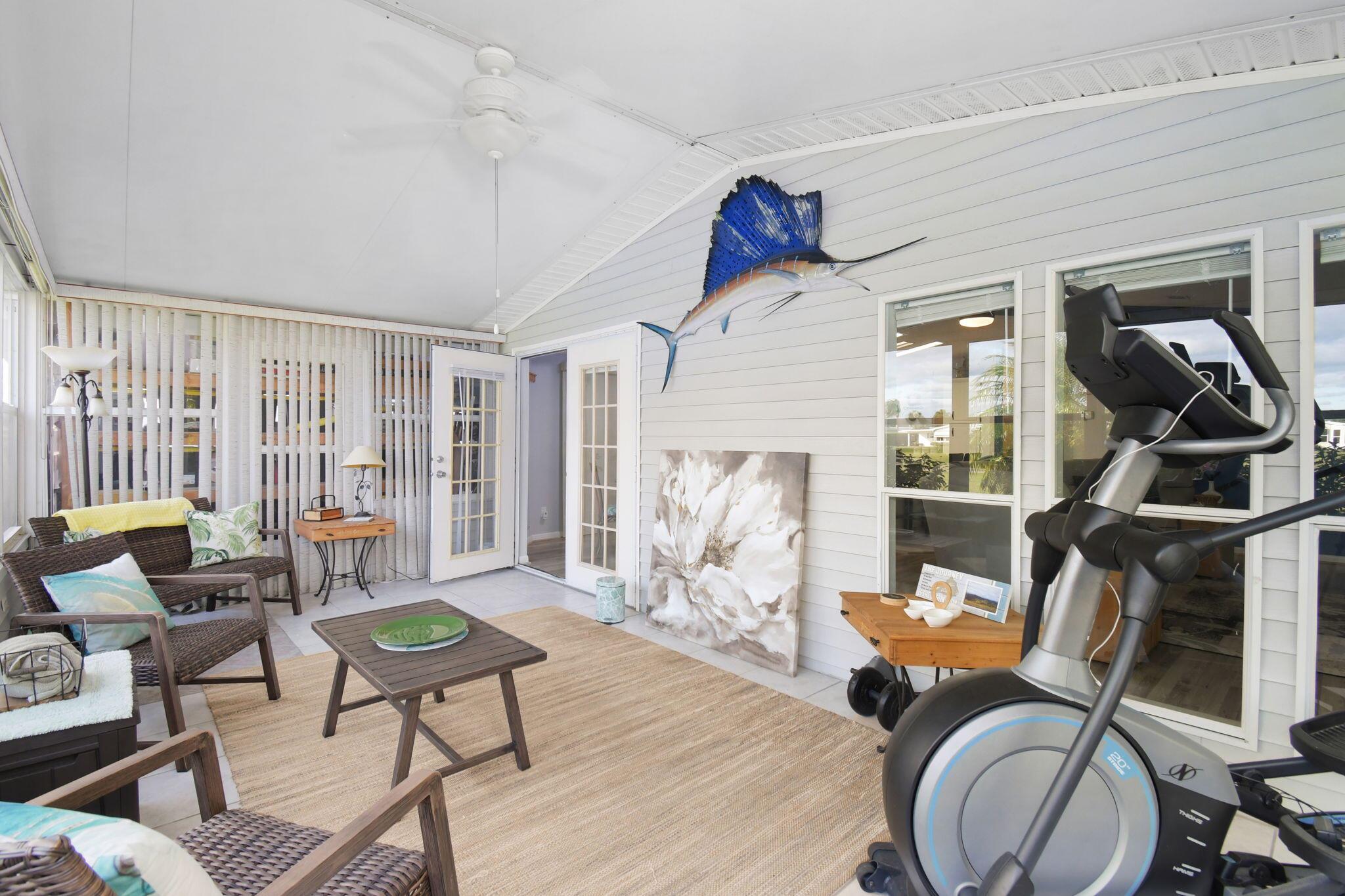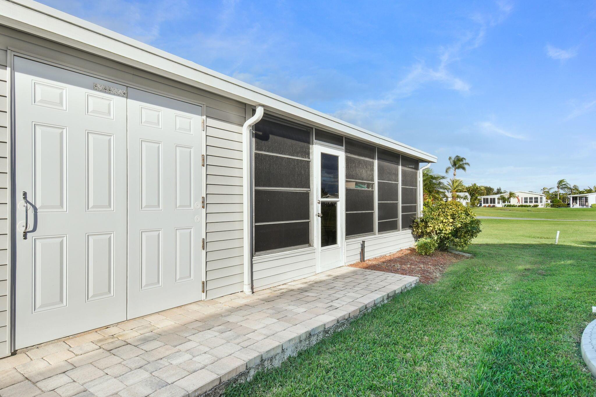 Land-Owned turn-key on the 18th hole of Savanna Club golf course. Walk to the Cove, tennis courts, shuffleboard, bocce ball, Fairways pool, and cafe! Perfect location! This home features upgraded kitchen with granite counters and white cabinets. Tile and laminate flooring in living areas. Interior laundry room. Wood grain barn doors in guest bedroom with extra shelving in the closet. Barn door to laundry room. Primary bedroom with sitting area. Primary bathroom with dual sinks, garden tub, & separate shower. Two enclosed patios, one being used as a workshop. All tools excluded from sale. Shed for storage.