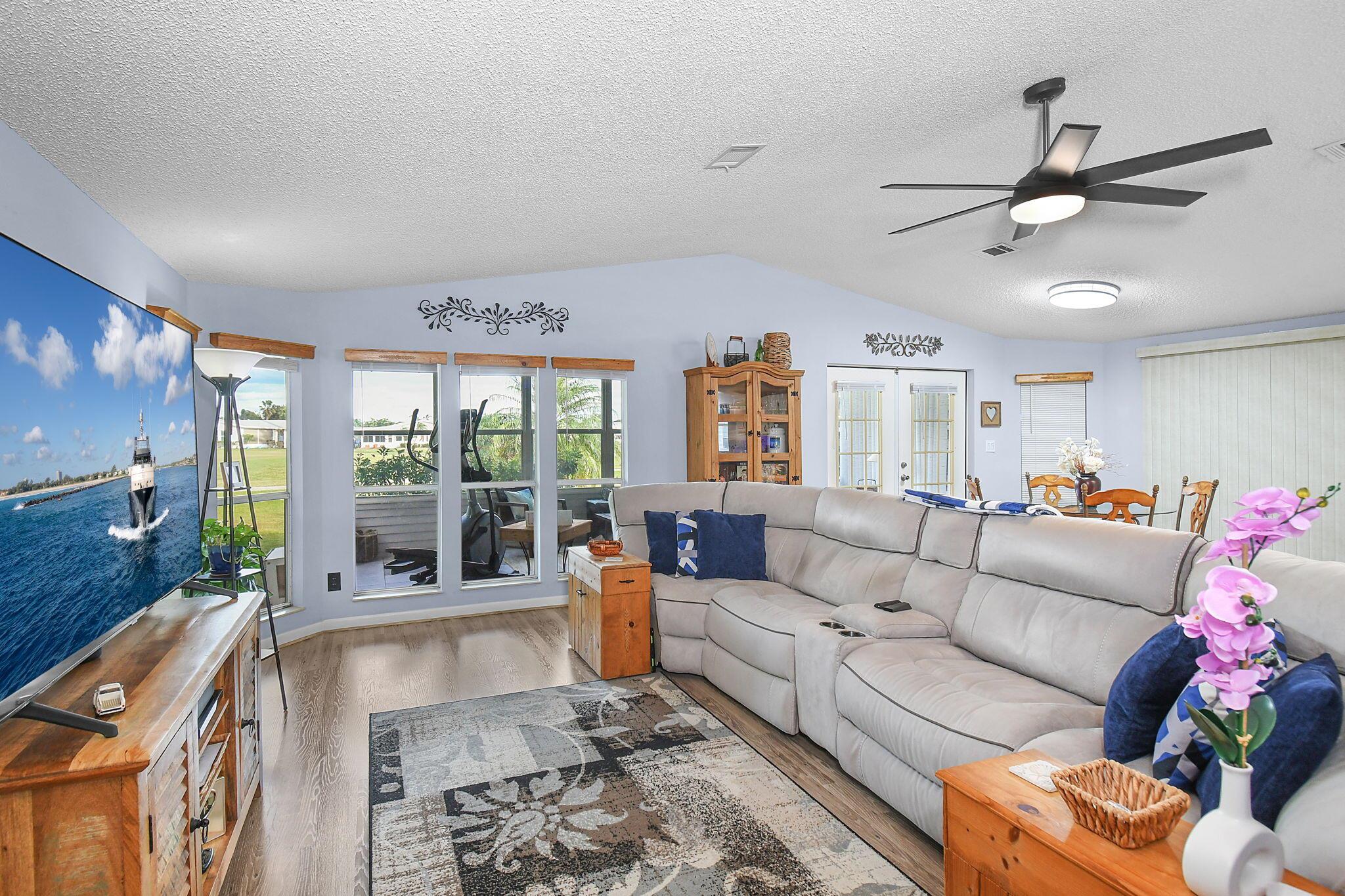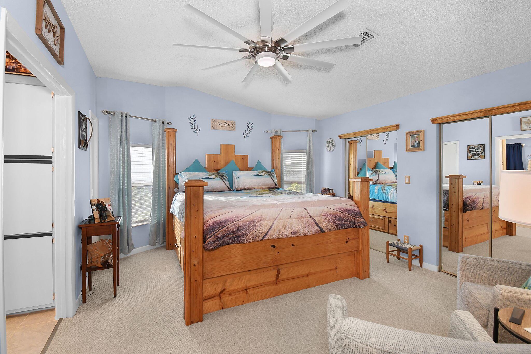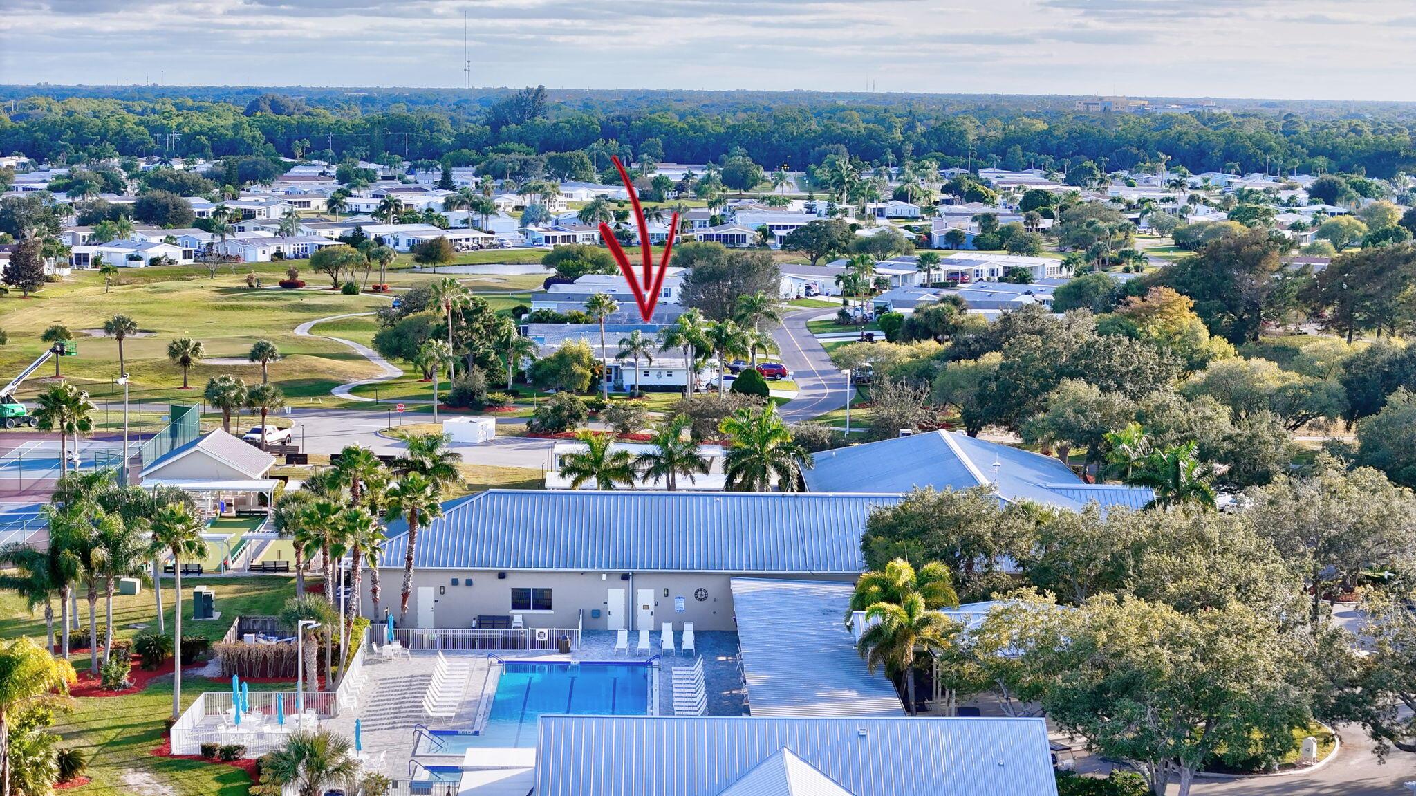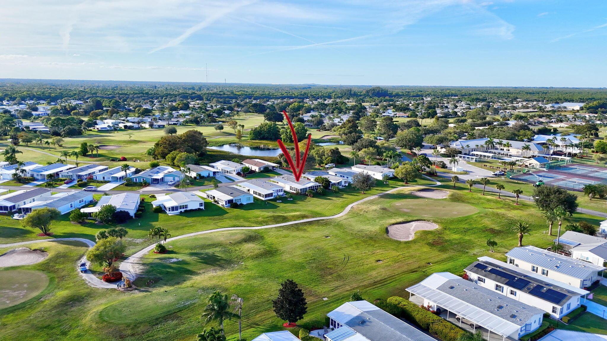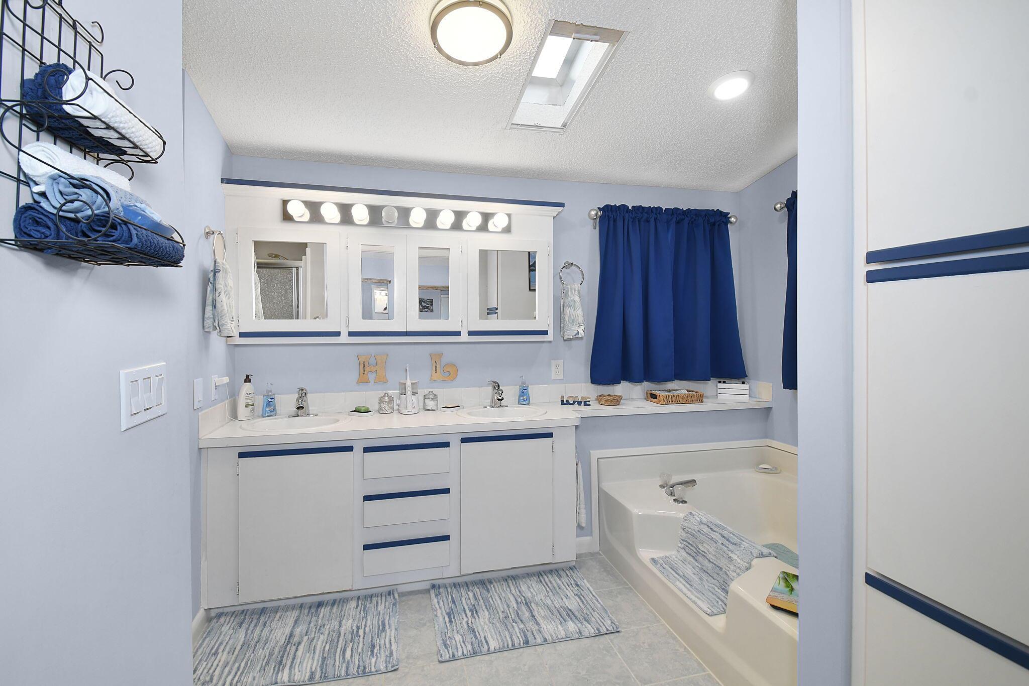 Land-Owned turn-key on the 18th hole of Savanna Club golf course. Walk to the Cove, tennis courts, shuffleboard, bocce ball, Fairways pool, and cafe! Perfect location! This home features upgraded kitchen with granite counters and white cabinets. Tile and laminate flooring in living areas. Interior laundry room. Wood grain barn doors in guest bedroom with extra shelving in the closet. Barn door to laundry room. Primary bedroom with sitting area. Primary bathroom with dual sinks, garden tub, & separate shower. Two enclosed patios, one being used as a workshop. All tools excluded from sale. Shed for storage.