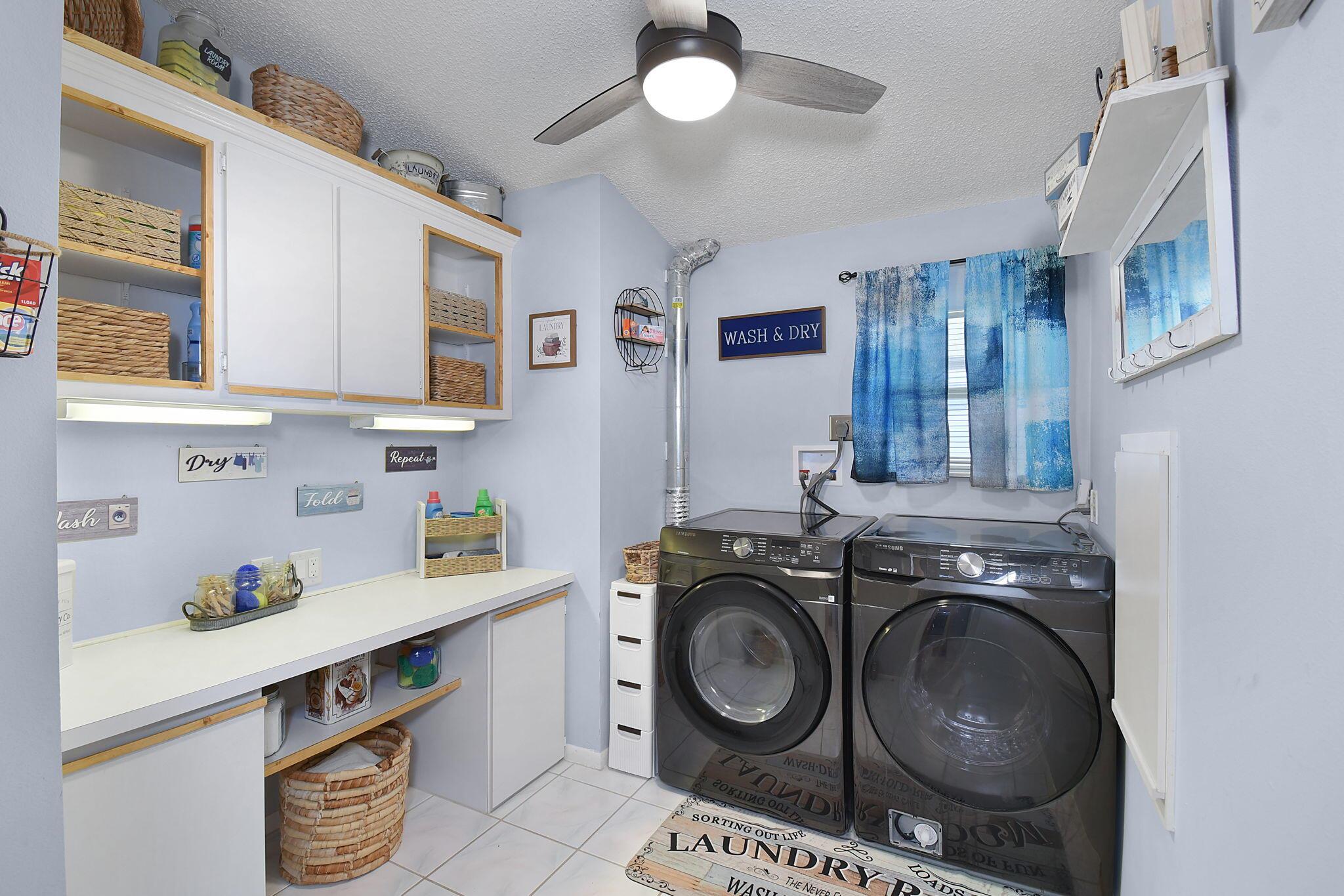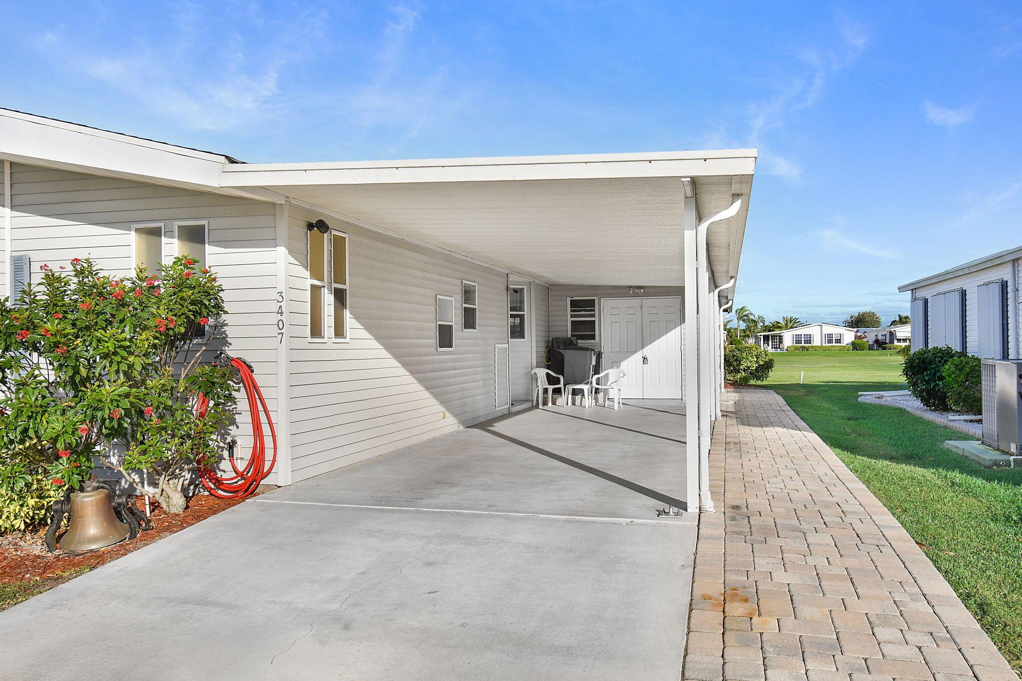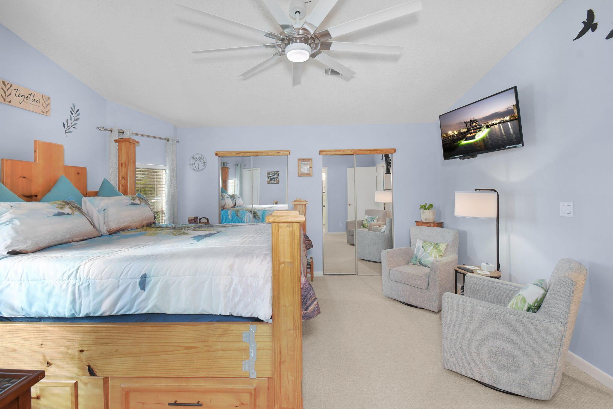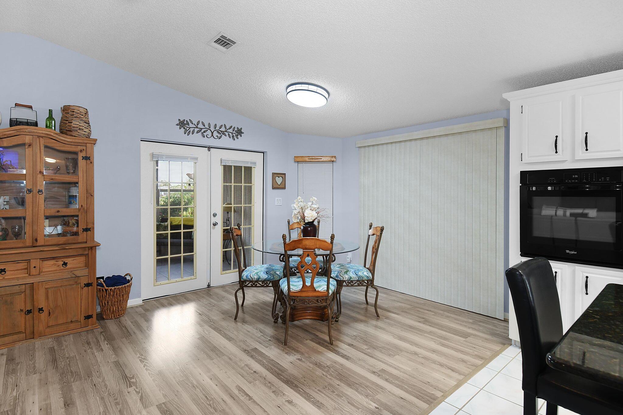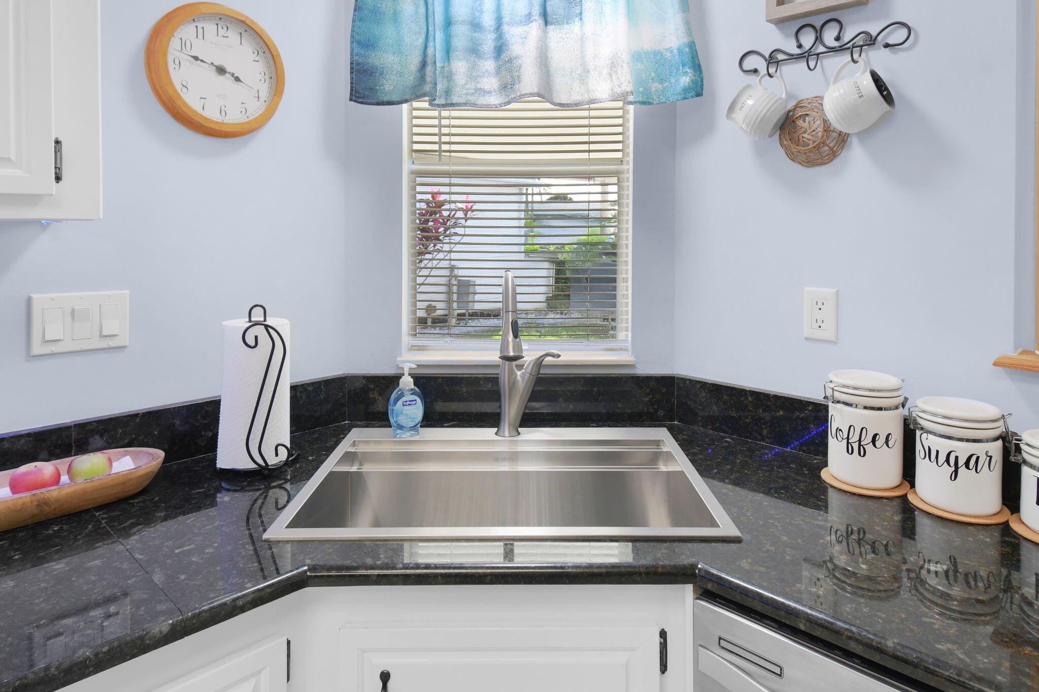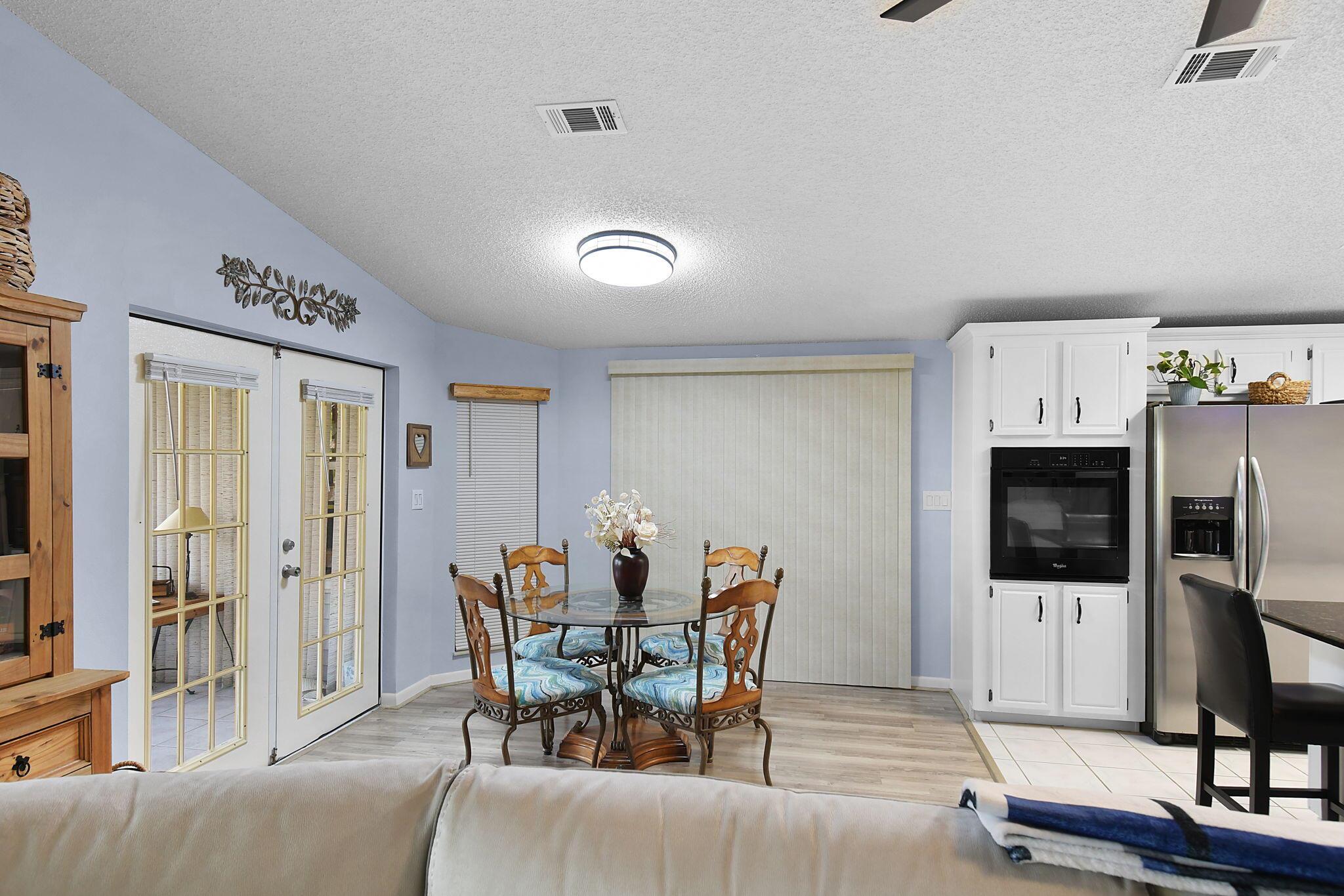 Land-Owned turn-key on the 18th hole of Savanna Club golf course. Walk to the Cove, tennis courts, shuffleboard, bocce ball, Fairways pool, and cafe! Perfect location! This home features upgraded kitchen with granite counters and white cabinets. Tile and laminate flooring in living areas. Interior laundry room. Wood grain barn doors in guest bedroom with extra shelving in the closet. Barn door to laundry room. Primary bedroom with sitting area. Primary bathroom with dual sinks, garden tub, & separate shower. Two enclosed patios, one being used as a workshop. All tools excluded from sale. Shed for storage.
