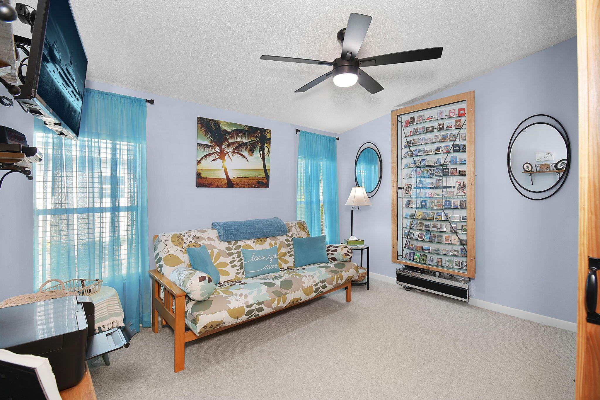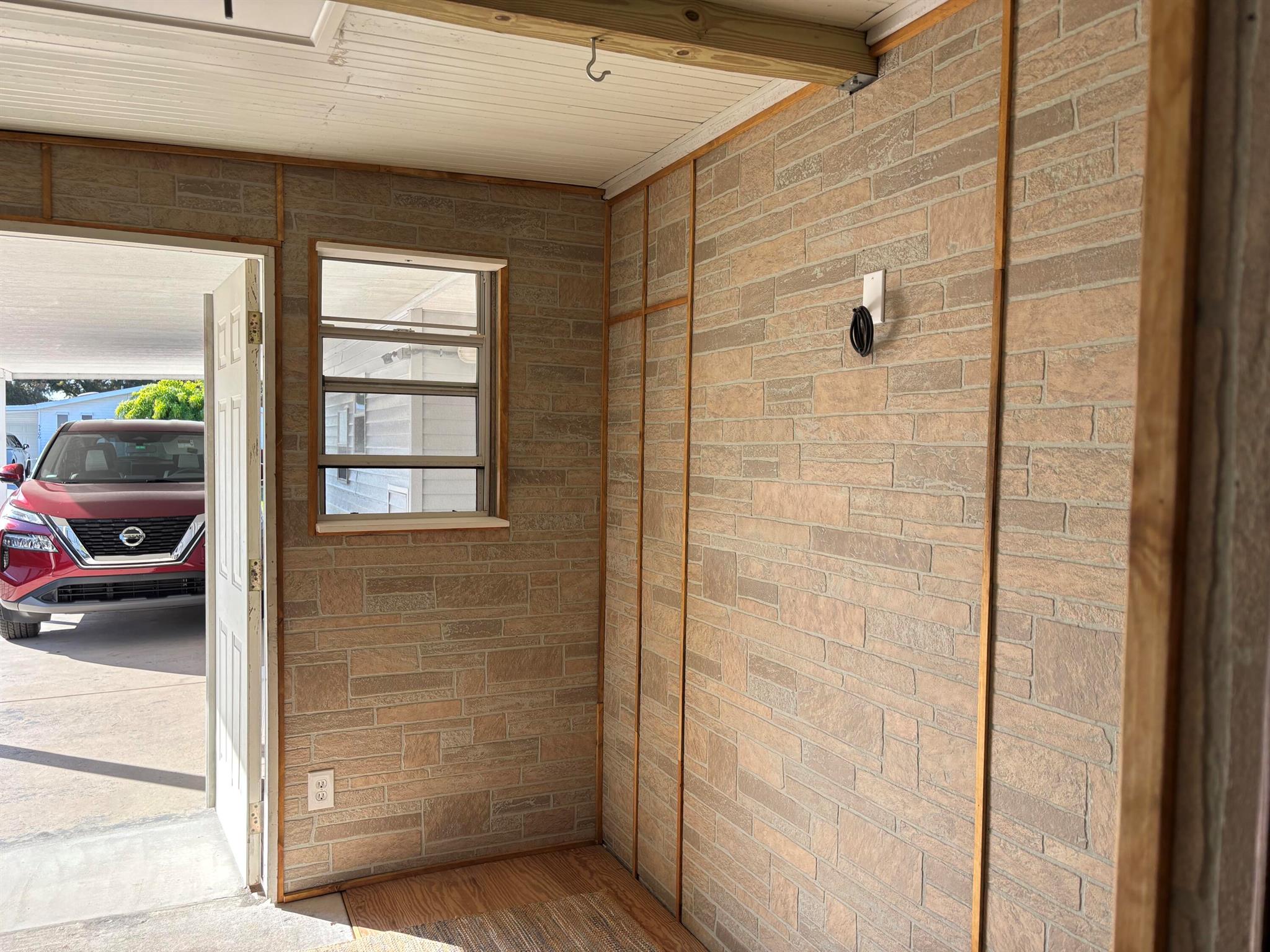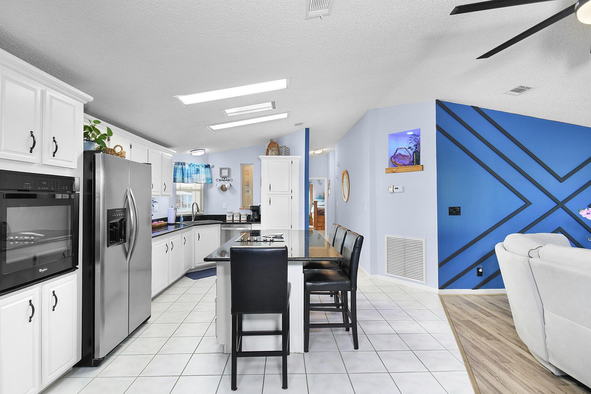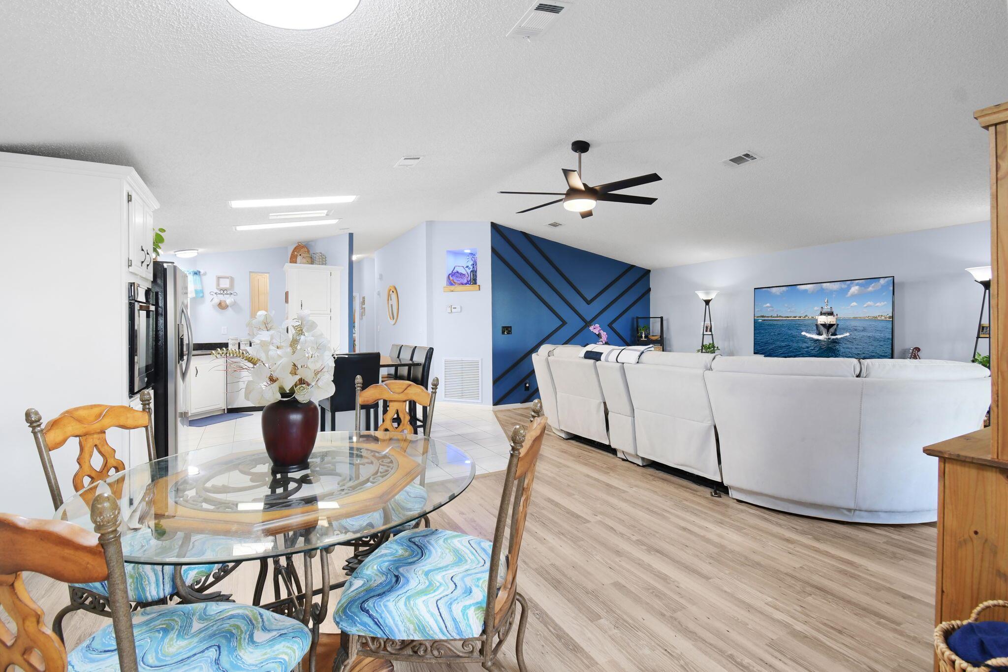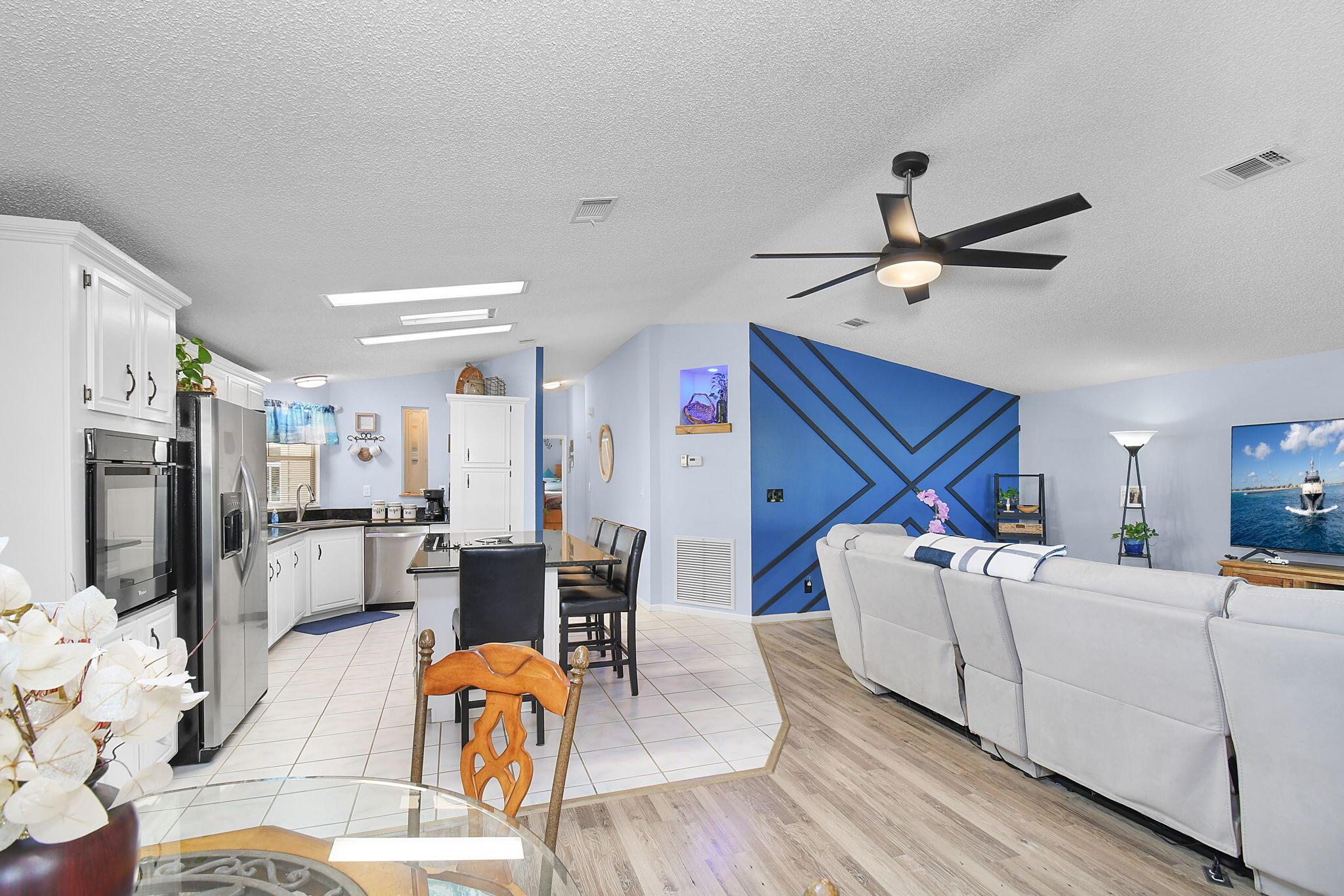Land-Owned turn-key on the 18th hole of Savanna Club golf course. Walk to the Cove, tennis courts, shuffleboard, bocce ball, Fairways pool, and cafe! Perfect location! This home features upgraded kitchen with granite counters and white cabinets. Tile and laminate flooring in living areas. Interior laundry room. Wood grain barn doors in guest bedroom with extra shelving in the closet. Barn door to laundry room. Primary bedroom with sitting area. Primary bathroom with dual sinks, garden tub, & separate shower. Two enclosed patios, one being used as a workshop. All tools excluded from sale. Shed for storage.