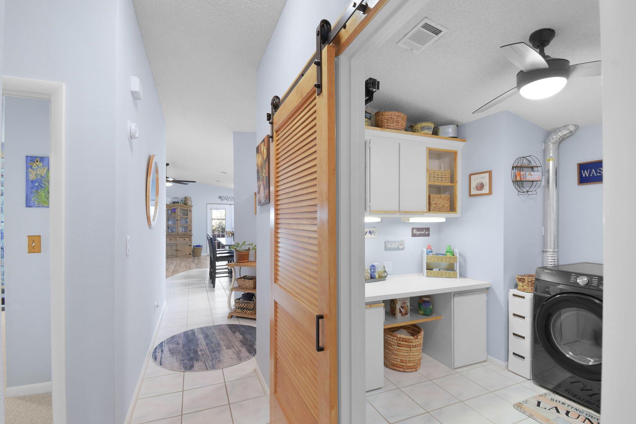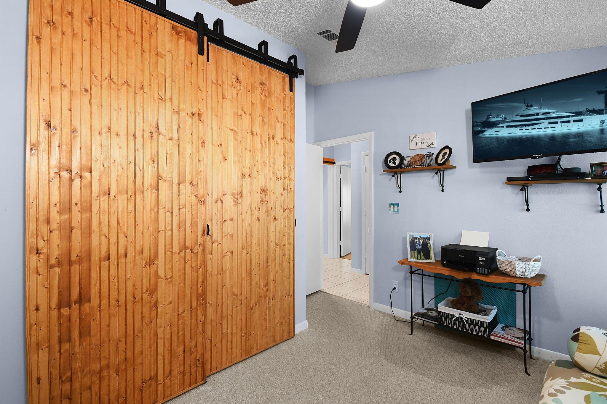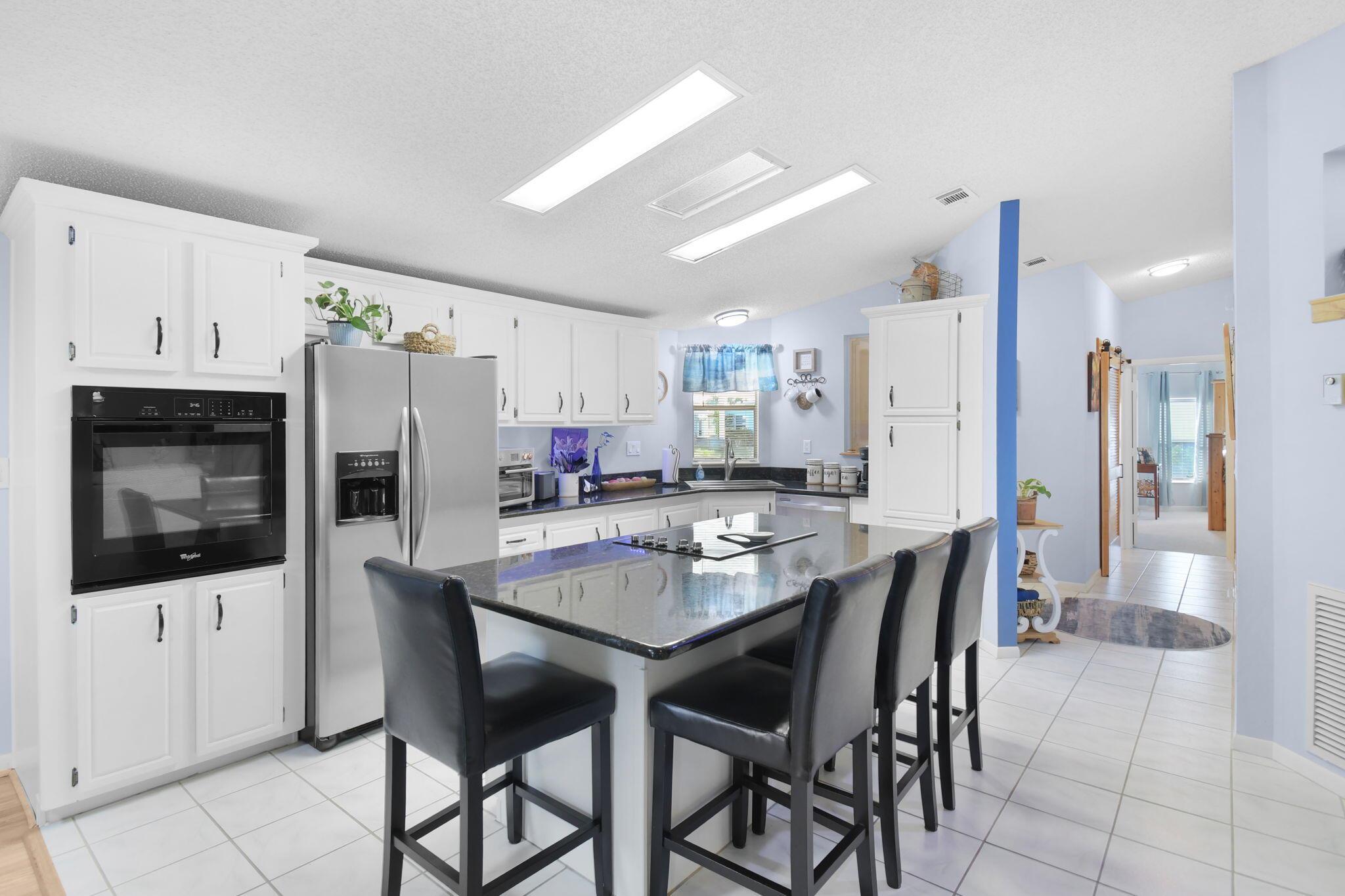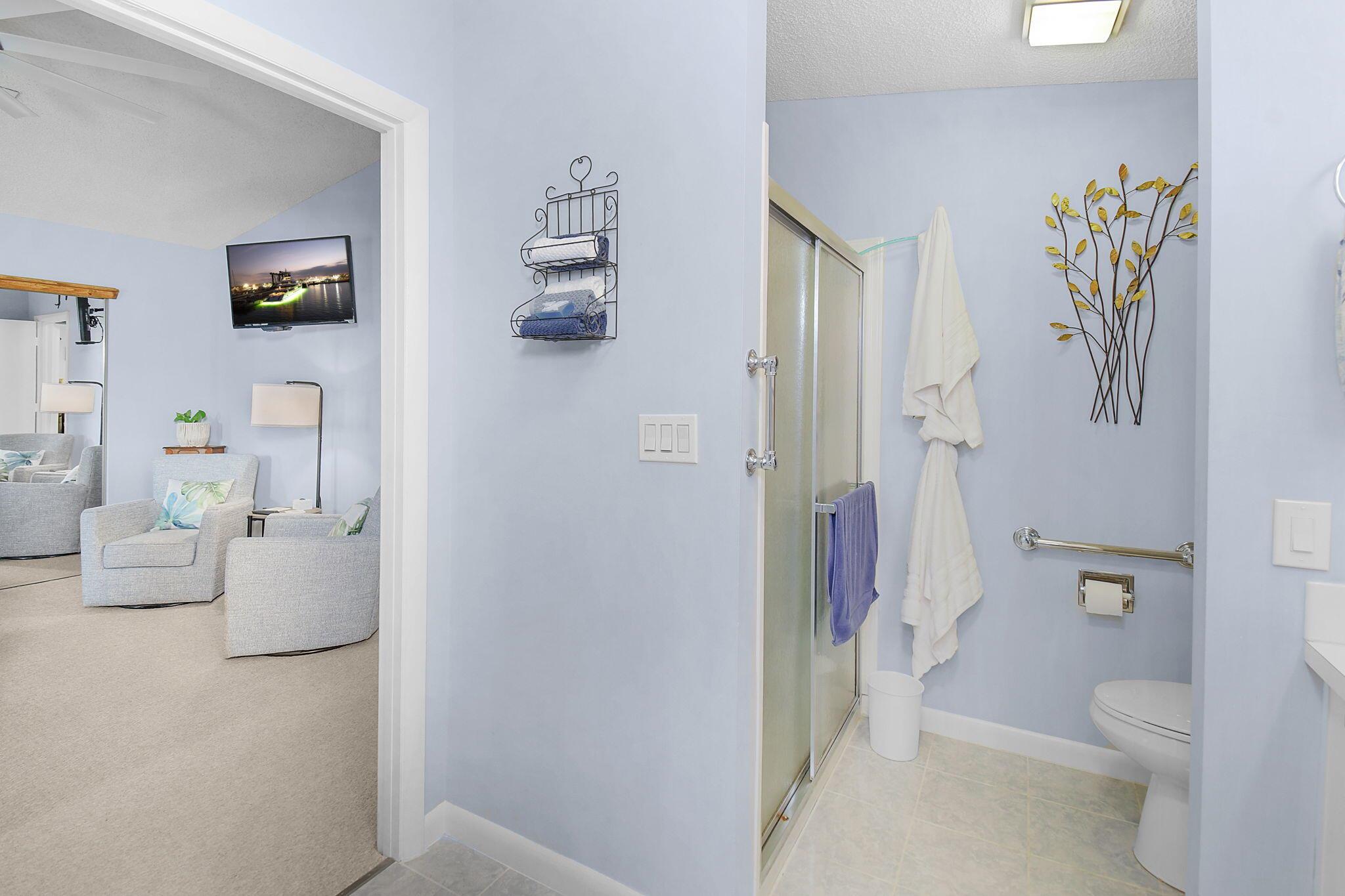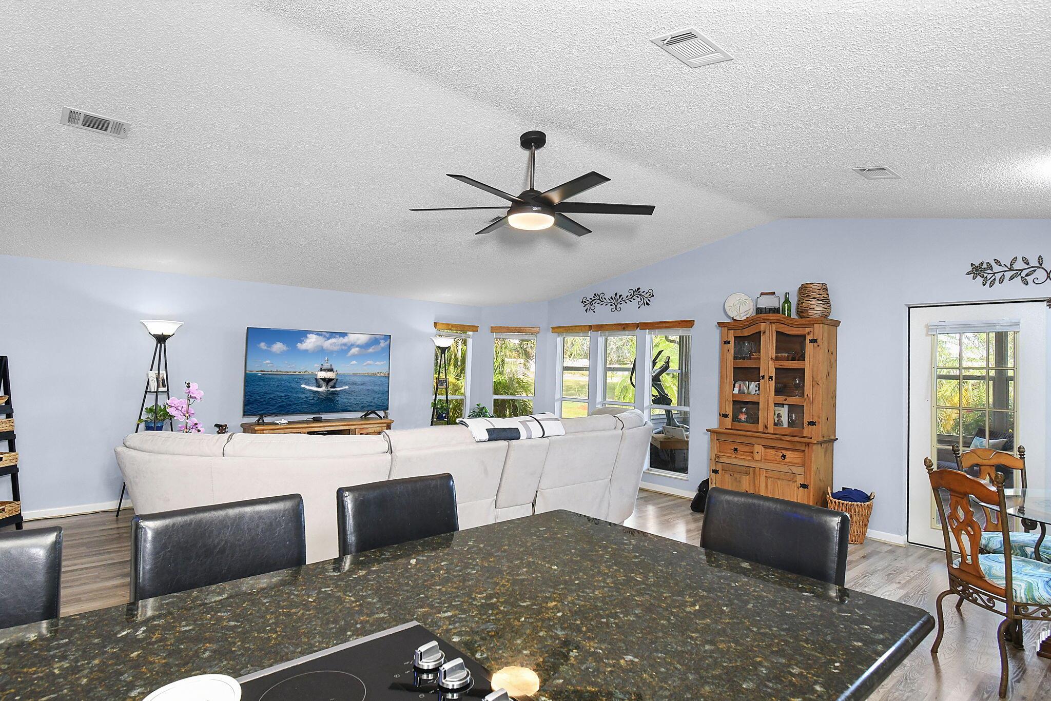 Land-Owned turn-key on the 18th hole of Savanna Club golf course. Walk to the Cove, tennis courts, shuffleboard, bocce ball, Fairways pool, and cafe! Perfect location! This home features upgraded kitchen with granite counters and white cabinets. Tile and laminate flooring in living areas. Interior laundry room. Wood grain barn doors in guest bedroom with extra shelving in the closet. Barn door to laundry room. Primary bedroom with sitting area. Primary bathroom with dual sinks, garden tub, & separate shower. Two enclosed patios, one being used as a workshop. All tools excluded from sale. Shed for storage.