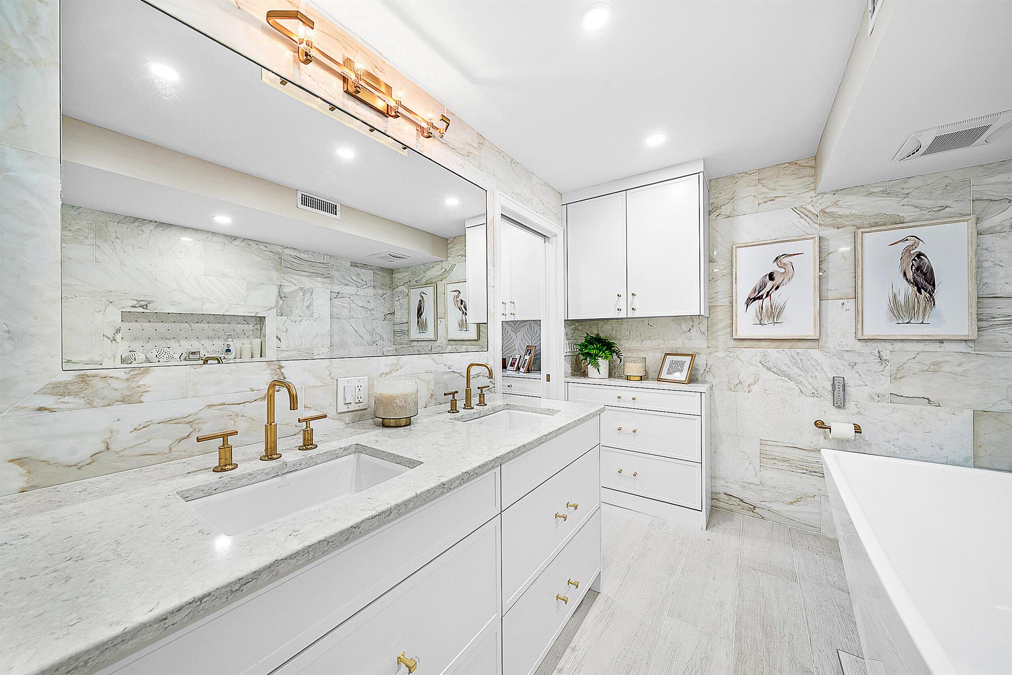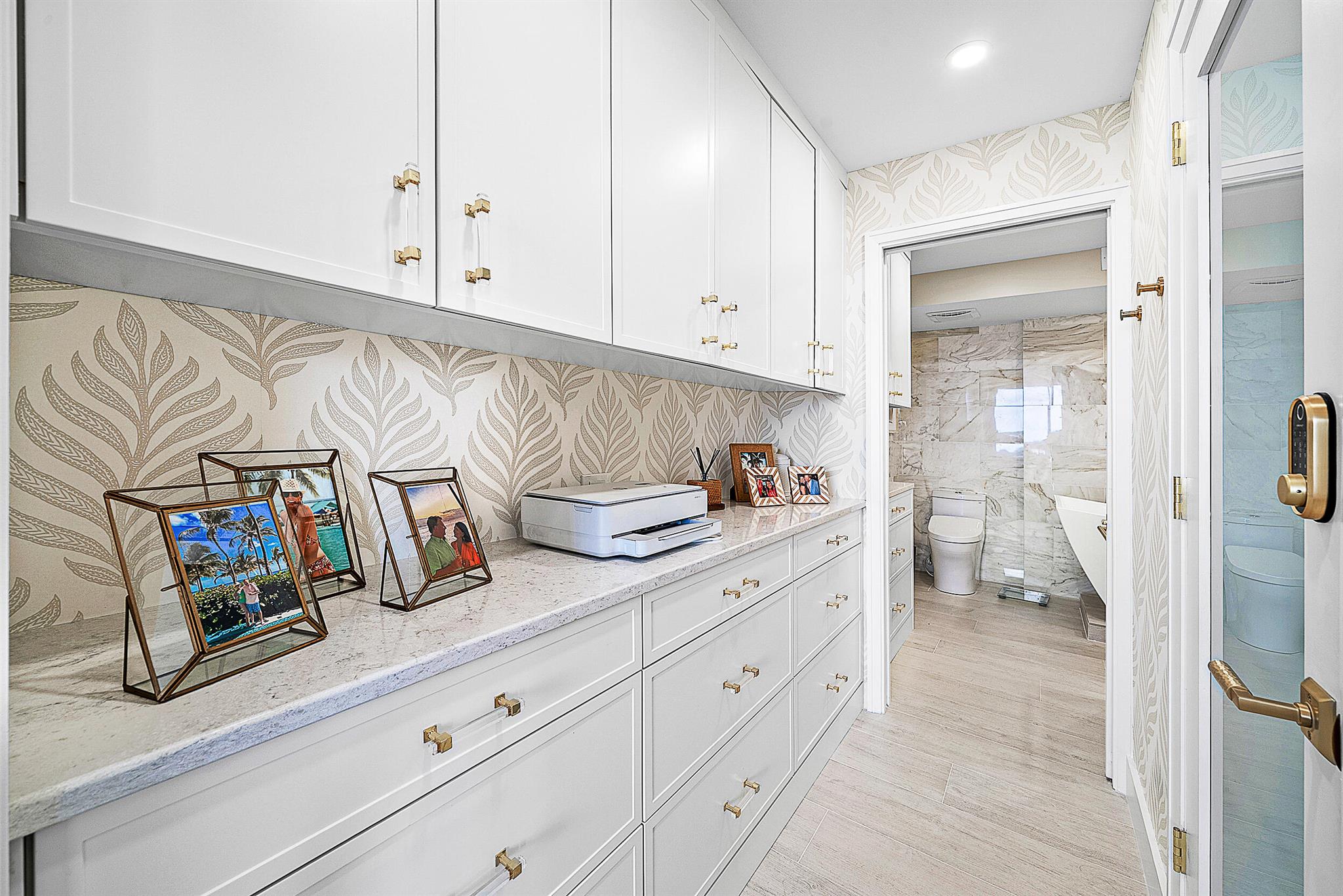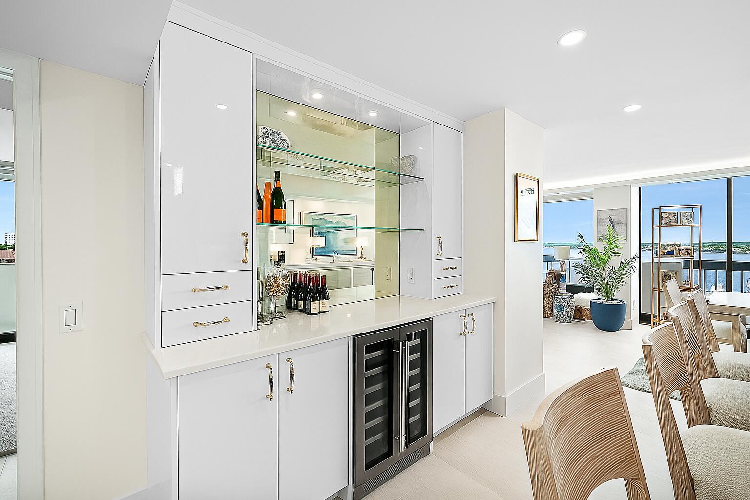 Completely remodeled down to the studs in November 2022, this exquisite 2BR/2BA residence in Marina Tower at Old Port Cove offers luxurious modern living with breathtaking water views from every room. Enjoy seamless indoor-outdoor living with an expansive wrap-around balcony perfect for entertaining or taking in year-round sunsets over the Intracoastal. Every inch of this home has been thoughtfully upgraded -- featuring new hurricane-rated doors & glass, high-end fixtures for plumbing & lighting, electric window shades with remotes in every room, upgraded interior doors with smoked glass & hardware, new washer & dryer (2023), and all lights on dimmers.