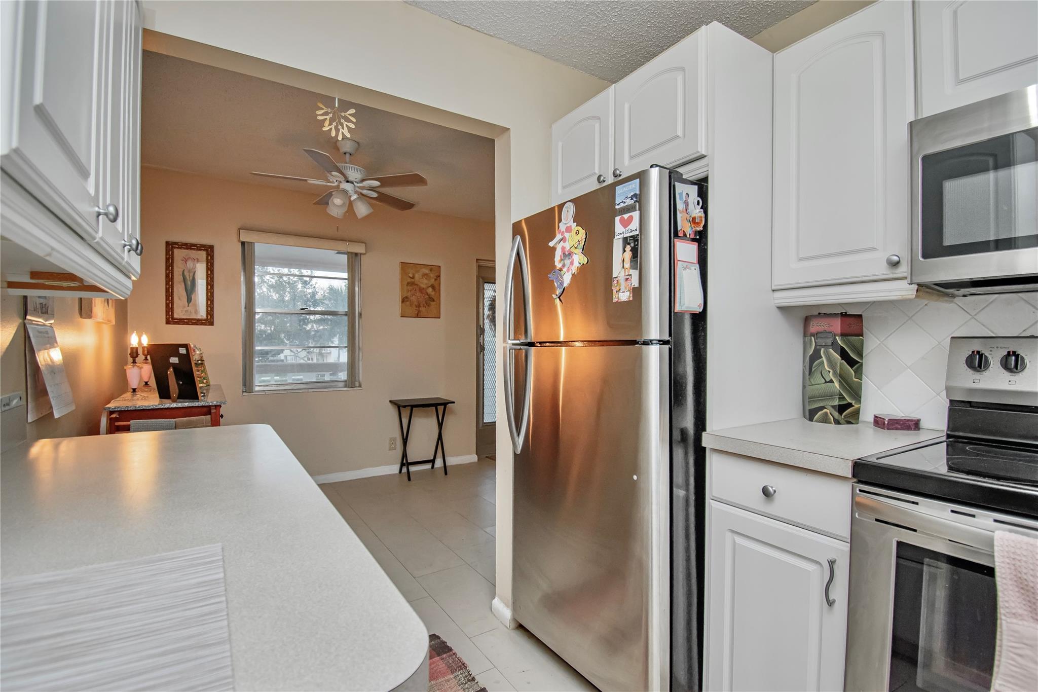 Discover this immaculate 2-bedroom condo in the highly sought-after gated community of Century Village. Enjoy resort-style amenities, including a massive clubhouse with a ballroom and theater, indoor & outdoor pools, tennis, shuffleboard, a state-of-the-art fitness center, sailing, and billiards room. Peace of mind is ensured with 24-hour security guards, along with all amenities included in the HOA. This well-maintained building received a new roof in 2022, and has no special assesments. The lovely unit features an updated kitchen with stainless steel appliances, white shaker cabinets, and a tile backsplash. Enjoy your morning coffee in the enclosed Florida Room with impact windows!) or secure your home with front accordion hurricane shutters. 2021 AC. Call listing agent now for a tour!