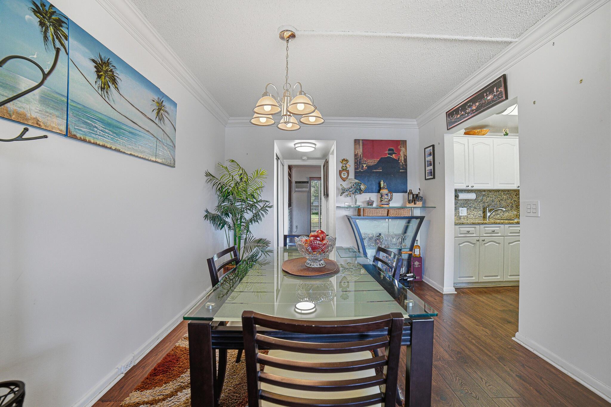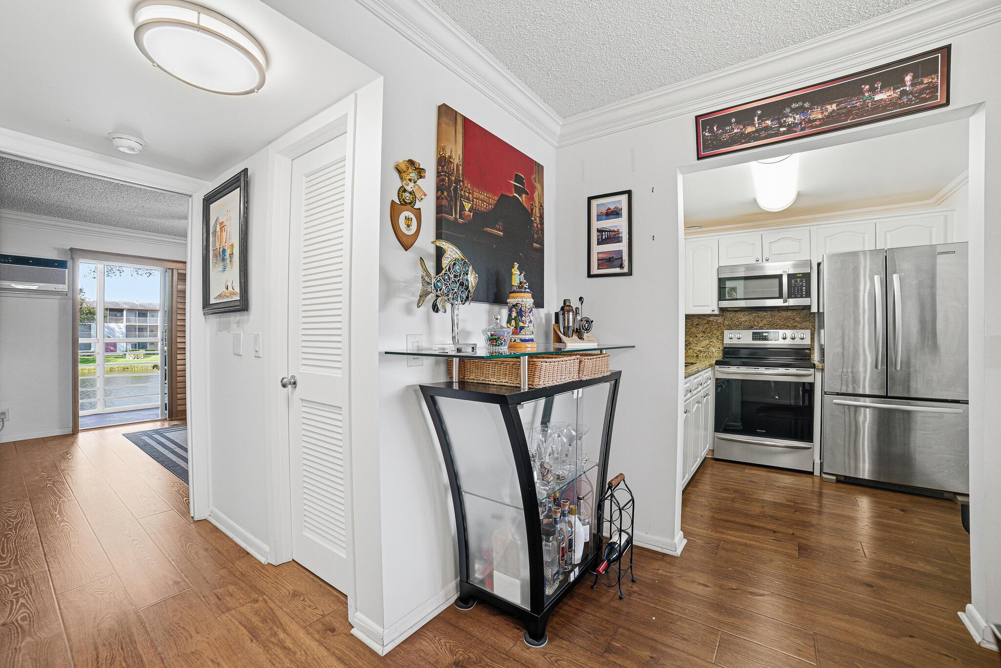 GORGEOUS WATERFRONT 1 BEDROOM AND 1 AND A 1/2 BATHS WITH PATIO OVER LOOKING LAKE. MOVEIN READY!TOTALLY REMODELED WITH MOHAWK WATERPROOF FLOORS THROUGHOUT , WHITE KTCHEN CABINETS WITH GRANITE COUNTERS, STAINLESS STEEL SINK WITH WATER FILTRATION SYSTEM,STAINLESS STEEL KITCHENAID FRENCH DOOR REFRIGERATOR, LG STAINLESS STEEL MICROWAVE , FRIGIDAIRE STOVE ,COMPLETELTY NEUTRAL TILED WALLS IN PRIMARY BATH WITH FRAMELESS GLASS SHOWER DOORS , 2 FRIEDRICH REMOTE CONTROLLED AC UNITS (3 YEARS OLD). 7 INCH CROWN MOLDING THROUGHOUT, CUSTOM WOOD PLANTATIOAN SHUTTERS IN LIVING ROOMA AND PRIMARY BEDROOM, CUSTOM MDF PATIO STORAGE CABINET AND TINTED SLIDING WINDOWS ON SCREENED BACK PATIO OVERLOOLKING LAKE AS WELL AS TINTED PATIO SLIDERS, INVESTORS CAN RENT UNIT RIGHT AWAY.