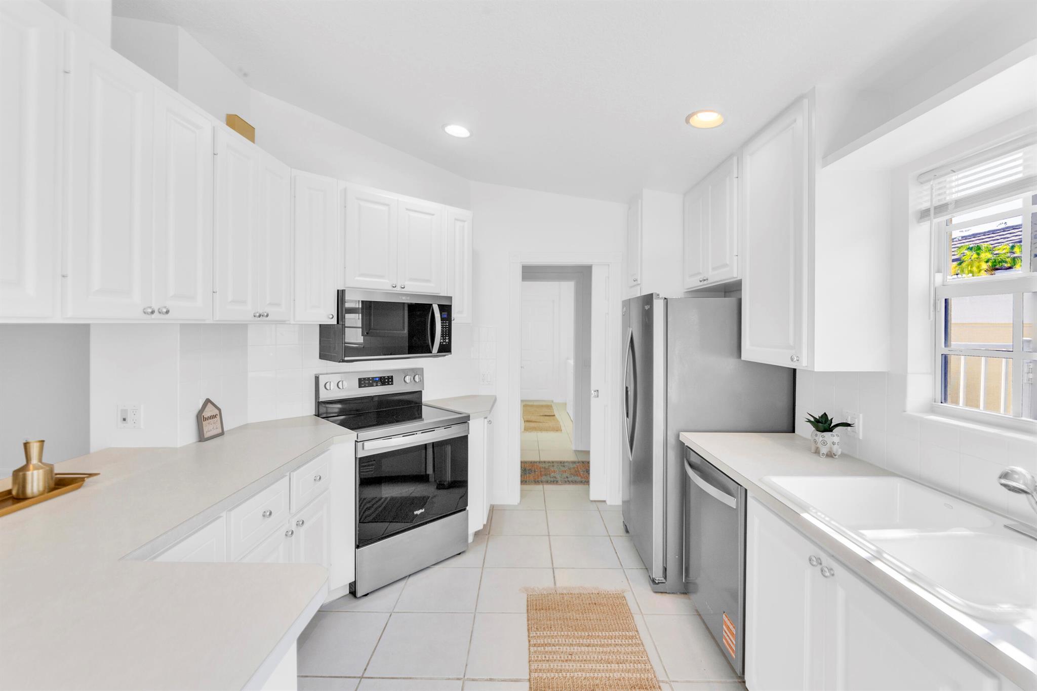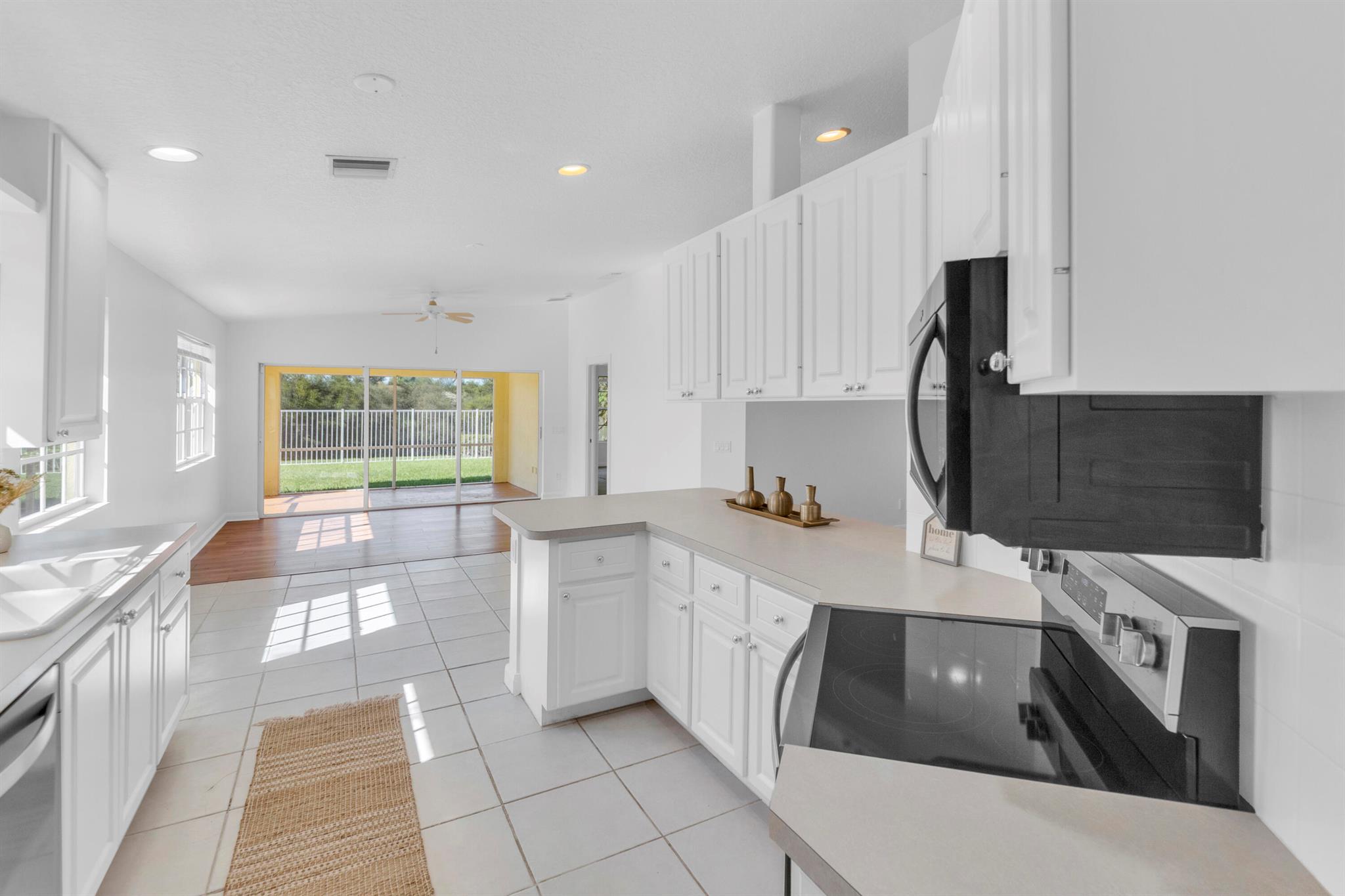 Welcome to this beautifully maintained 2-bedroom, 2-bathroom, 2-car garage villa in the highly sought-after Lakes at Tradition, an all-ages, resort-style community known for its peaceful atmosphere and unbeatable convenience. Located just minutes from Tradition Town Center's shops, dining, and community events, this home offers the perfect blend of comfort and lifestyle.Step inside to a bright and inviting layout featuring fresh interior paint and brand-new stainless steel Whirlpool appliances. The kitchen opens seamlessly to the spacious living and dining areas. The living room features DiVosta's signature mirrored wall unit an elegant and timeless built-in that adds depth, abundant storage, and a polished look that elevates the entire space.