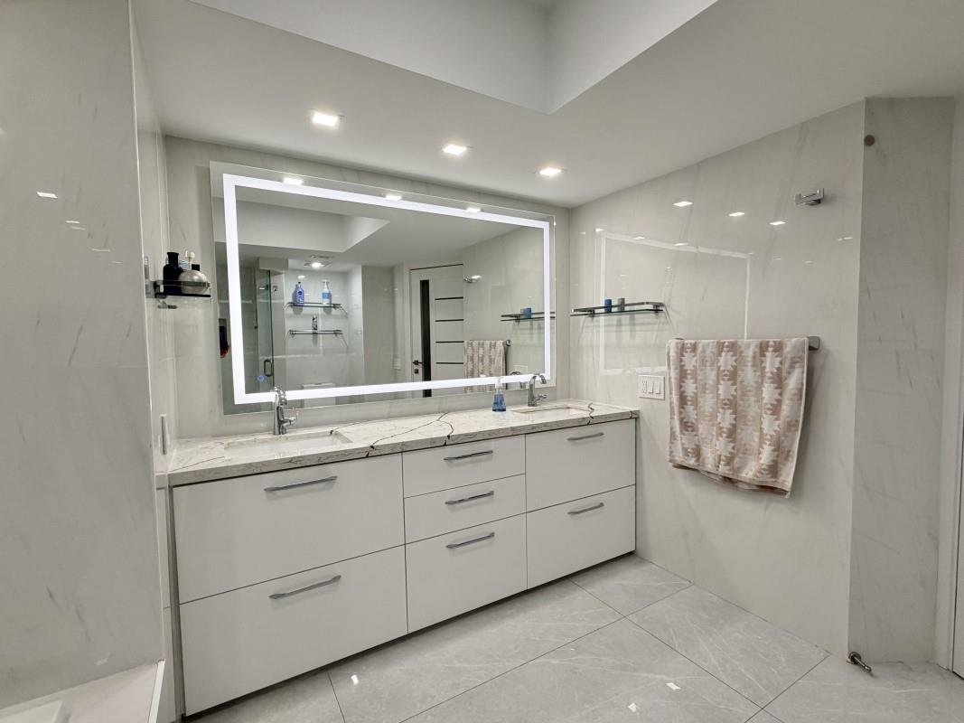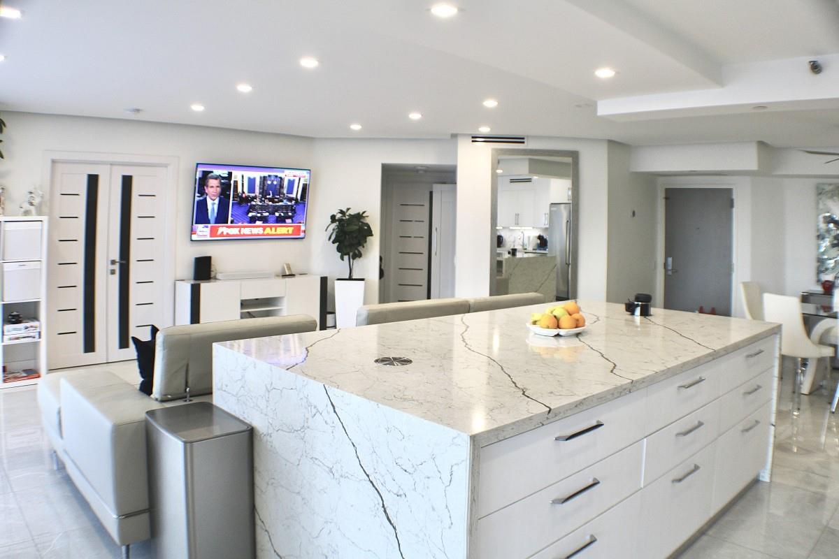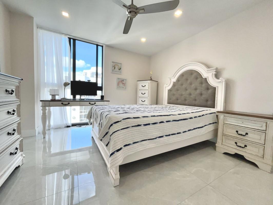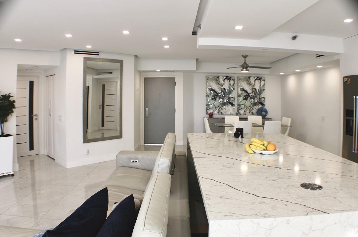 Completely remodeled/upgraded south-west corner unit has 3bd/2ba, a large balcony with stunning water view of the Waterways marina. Modern rectified porcelain tile floors, completely renovated custom build kitchen with a large island high end stainless steel appliances. Completely renovated bathrooms. Lots of custom built closets. Full size washer and dryer in the unit. Recessed lights throughout. Custom European doors. Brand new impact windows and doors. Custom Hunter Douglas uv shades. 5-star amenities.