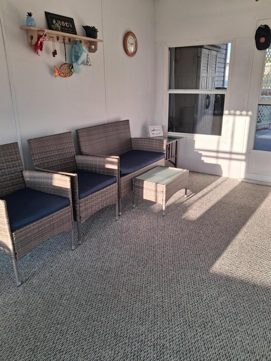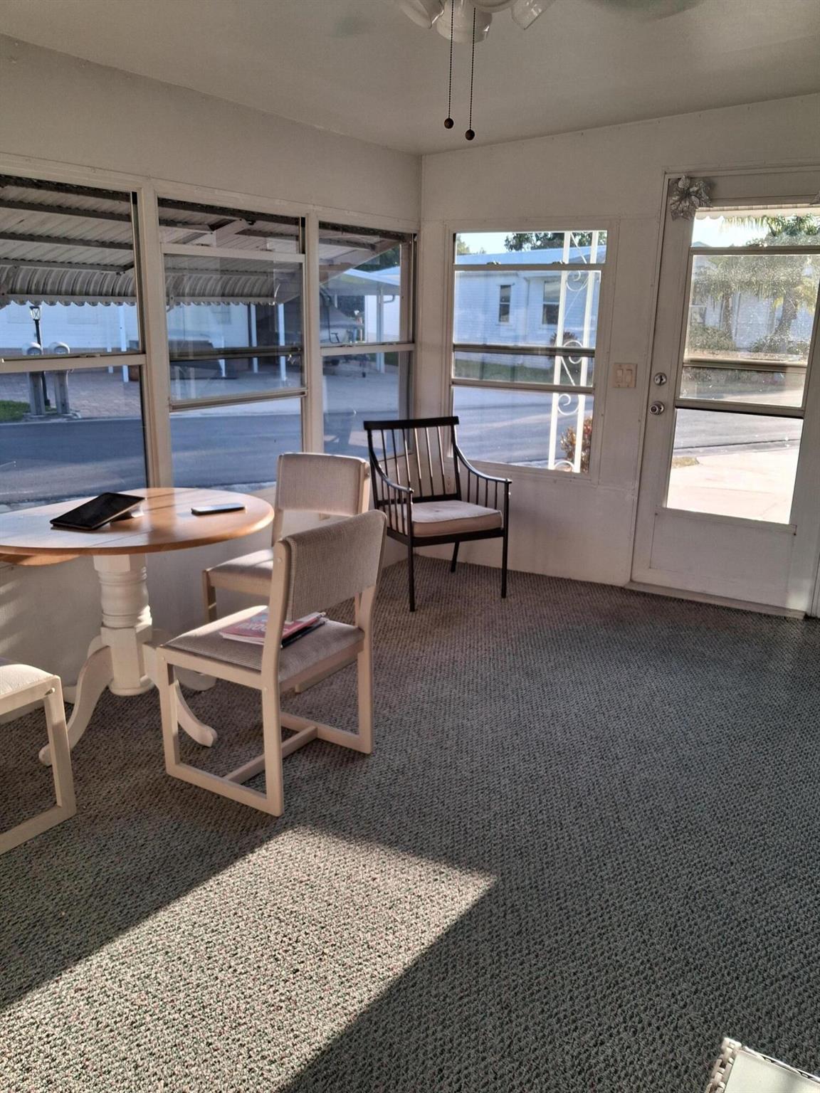 SEMINOLE COVE 2/2 Furnished with 2 Master suites and all appliances. NO STEPS to go into home. 2 entrances with driveways on both sides. Both entrances lead to front porch. Relax or read a book and enjoy the Florida weather. Large living room and open concept to dining area. Inside laundry area. Both master suites have large closets, bathrooms & ceiling fans. Home has a metal room and storage room. Corner lot and landscaped with fruit trees and center island. Seminole Cove is a 55+ community with a heated swimming pool, large clubhouse, fish cleaning house, shuffleboard court and many activities to keep busy. Gated at dusk for security, Measure rooms for accuracy