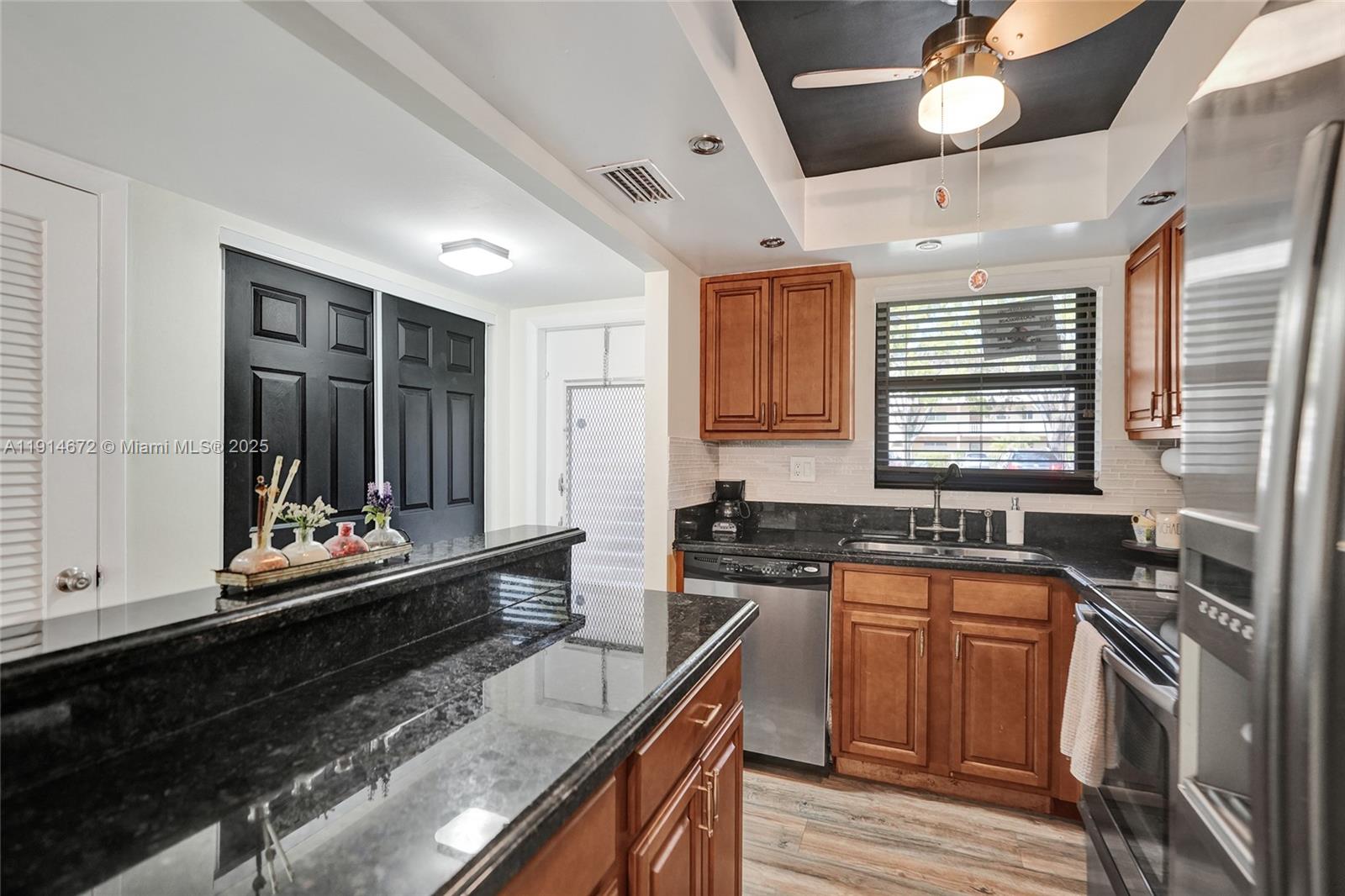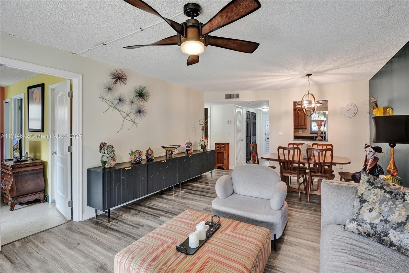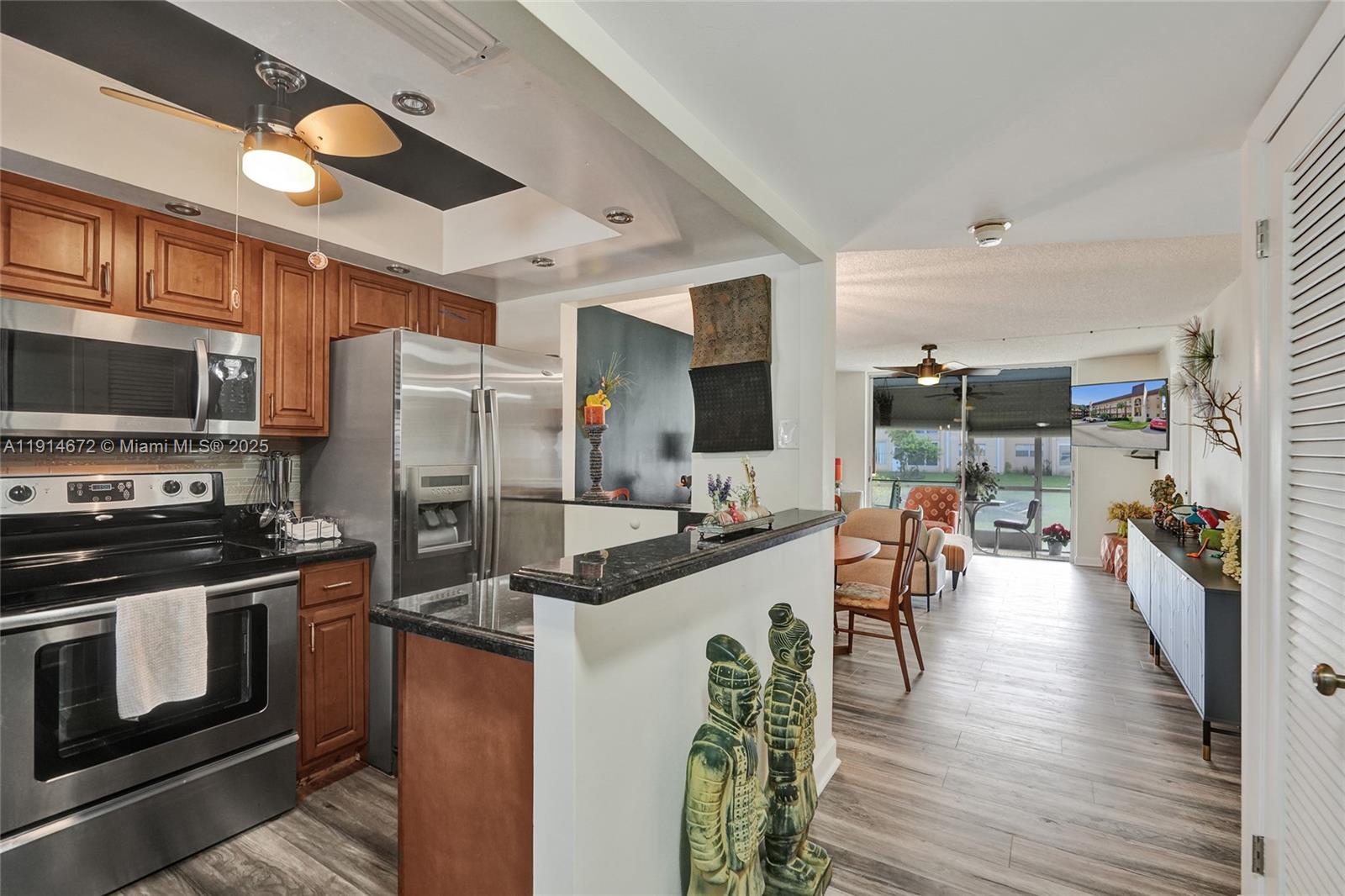 Gorgeous updated 1st-floor corner unit with stunning lake views in Sunrise Lakes Phase 3 (55+community). Features Gourmet kitchen w/ granite counter tops, wood cabinets & SS appliances. Split-bedroom layout with a spacious primary suite, w/ huge walk-in closet + extra closets; updated bath w/walk-in shower. Second BR w/walk-in closet; remodeled guest bath. High-end waterproof laminate in living areas, tile in bedrooms. Screened porch overlooking the lake. New impact windows 2025 & New roof 2024. Trane A/C 2006, Water heater 2024, Microwave 2 years. Amenities: multiple pools, private golf, clubhouse, game room, gym, movies, bingo, storage room, common laundry, assigned (steps away from front door) + ample guest parking . Close to shopping, dining, Sawgrass Mills, airport & major highways.
