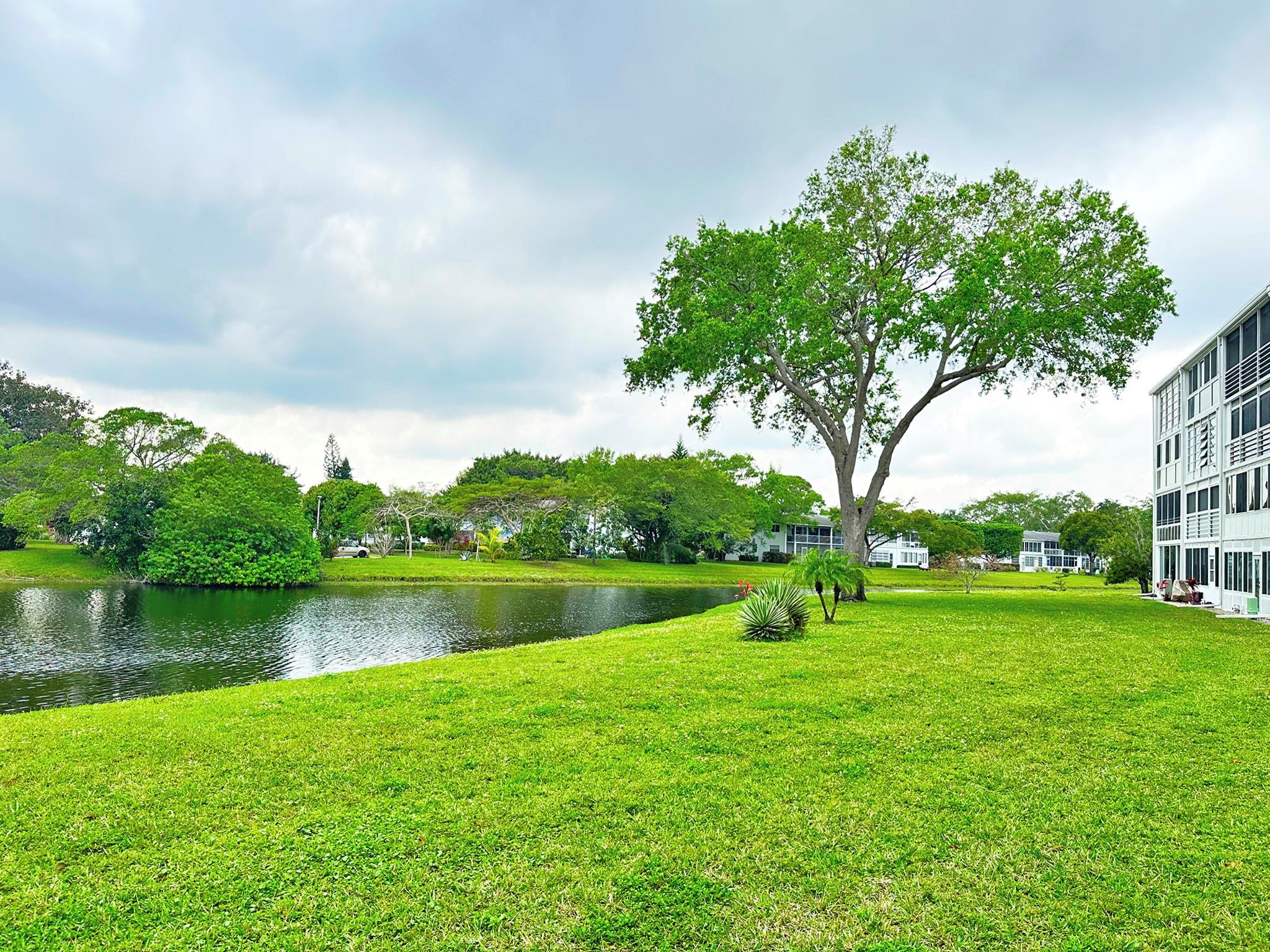 WATER VIEW! Beautifully maintained 1-bedrm, 1.5-bath condo on the top floor of a desirable 4 story bldg. This bright & clean unit features a spacious layout w/tile in liv areas & lam flrs in the bedroom. Kitchen offers white appls & plenty of natural light. Addt'l upgrades incl a HURRICANE IMPACT FRONT DOOR, updated electrical panel & ceiling fans thru-out. Enjoy peaceful evenings from the encl patio w/sliding windows, showcasing a stunning lake & fountain view w/breathtaking sunsets. Offered fully furnished & conveniently located close to the elevator & across from pool. Move in & start enjoying the Fl lifestyle w/amazing amenities Century Village has to offer..24 hr sec, bus service, pools, tennis, pickleball, putting green, cafe, gym, classes, clubs, billiards & MORE! ASSOC. CLAIMS 55+