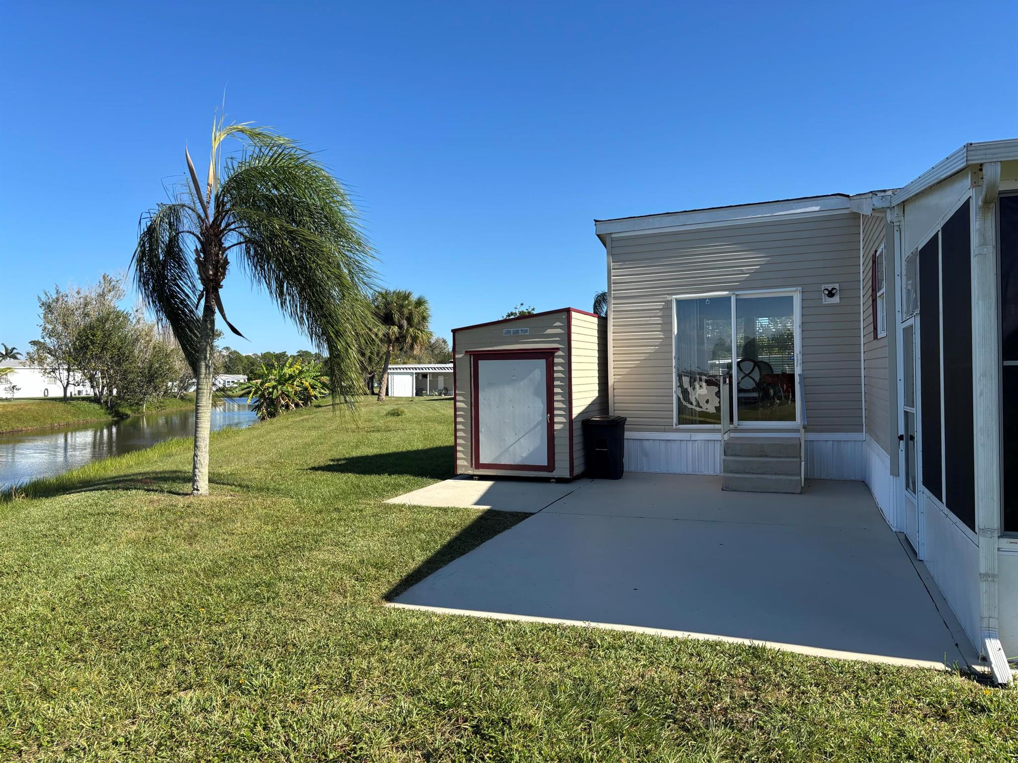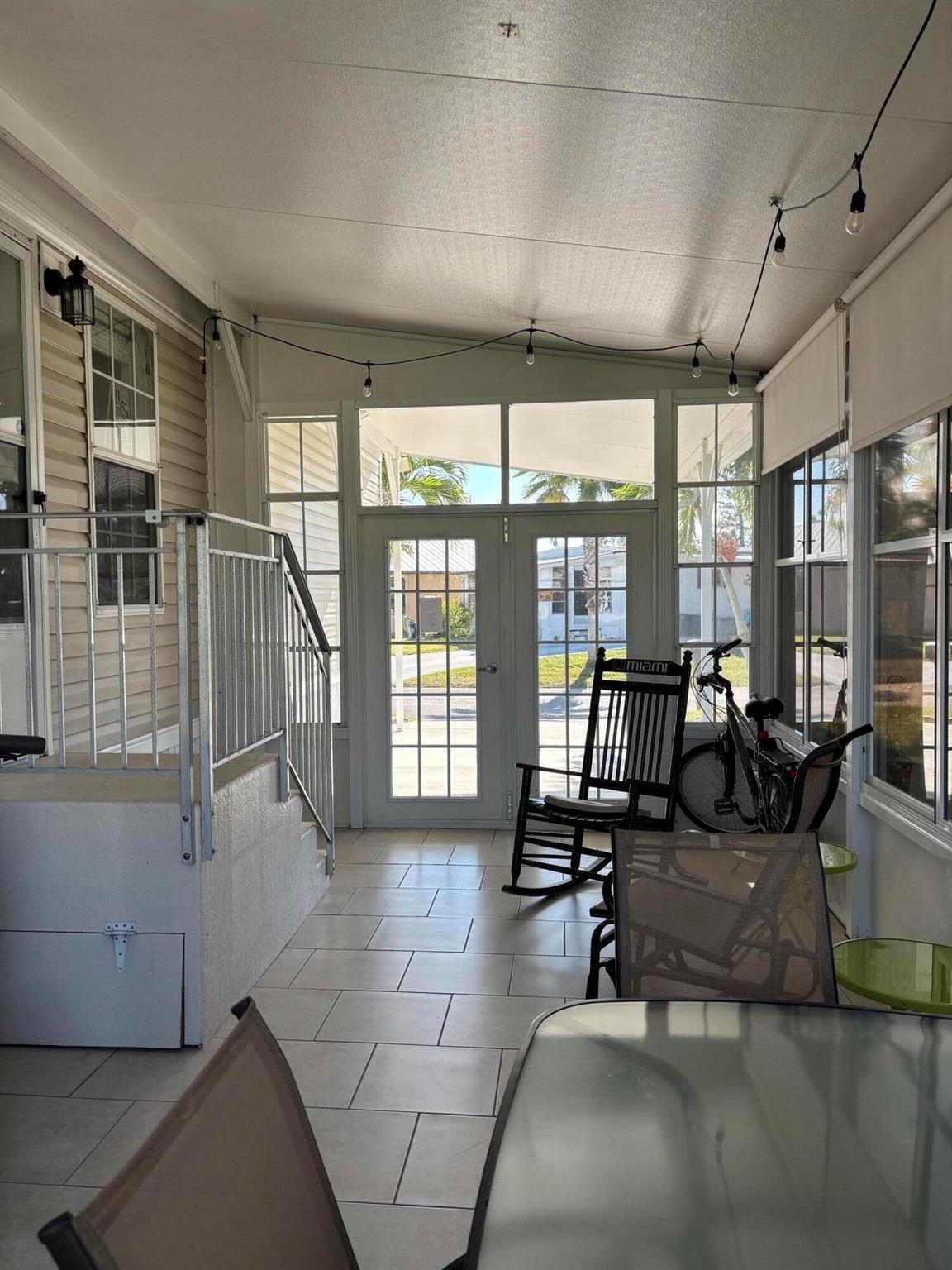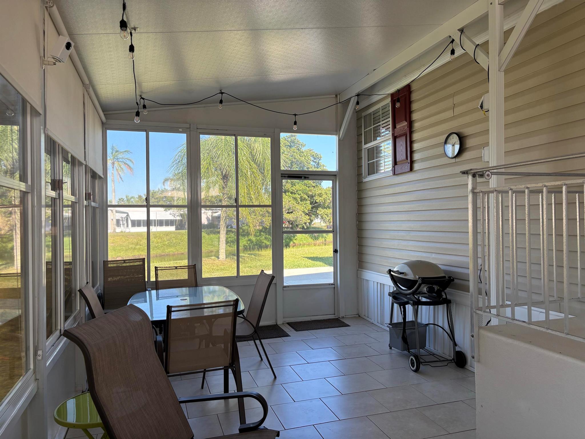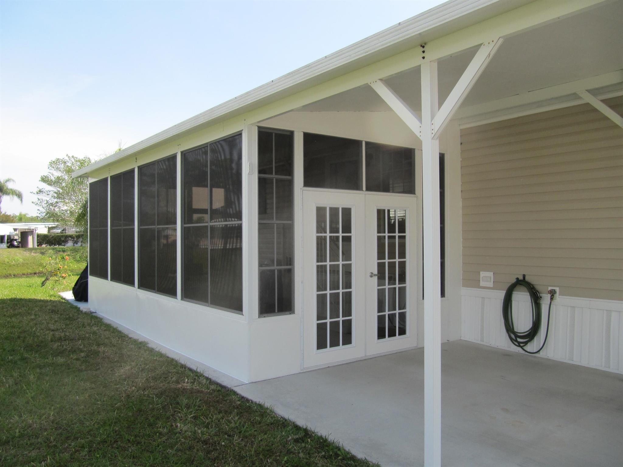 Leased Lot $910.60, This pristine 2bed/2Bath furnished manufactured home with crown molding and new AC 2021. Kitchen is open and includes large island, inside laundry, laminate flooring. Large private screened porch and solar shades. Located in a 55+ community, Spanish Lakes One provides a relaxed yet vibrant lifestyle for active seniors. Enjoy resort-like amenities, including a community clubhouse, free golf, social events, tennis courts, and pool. Park approval is required to purchase.
