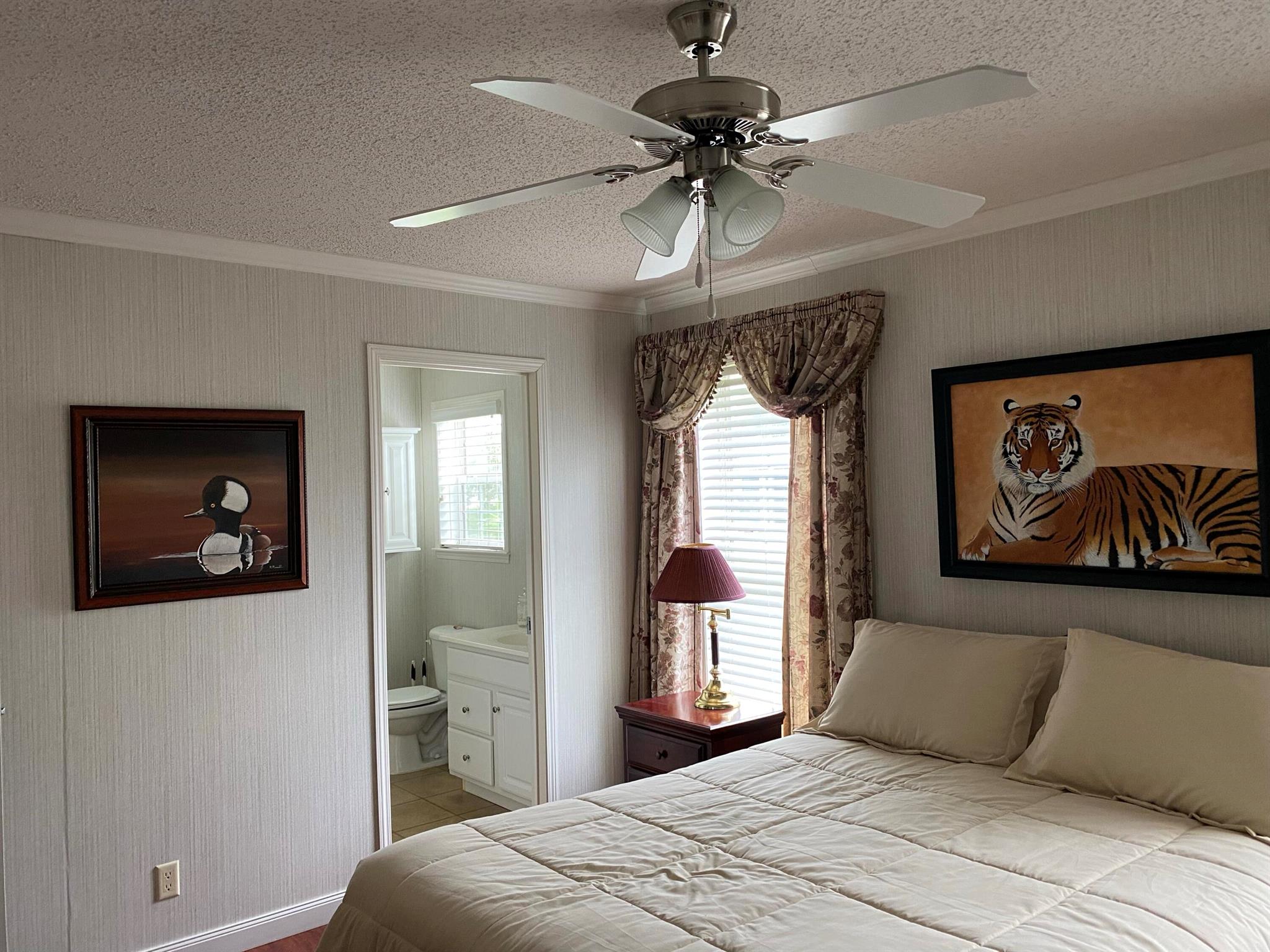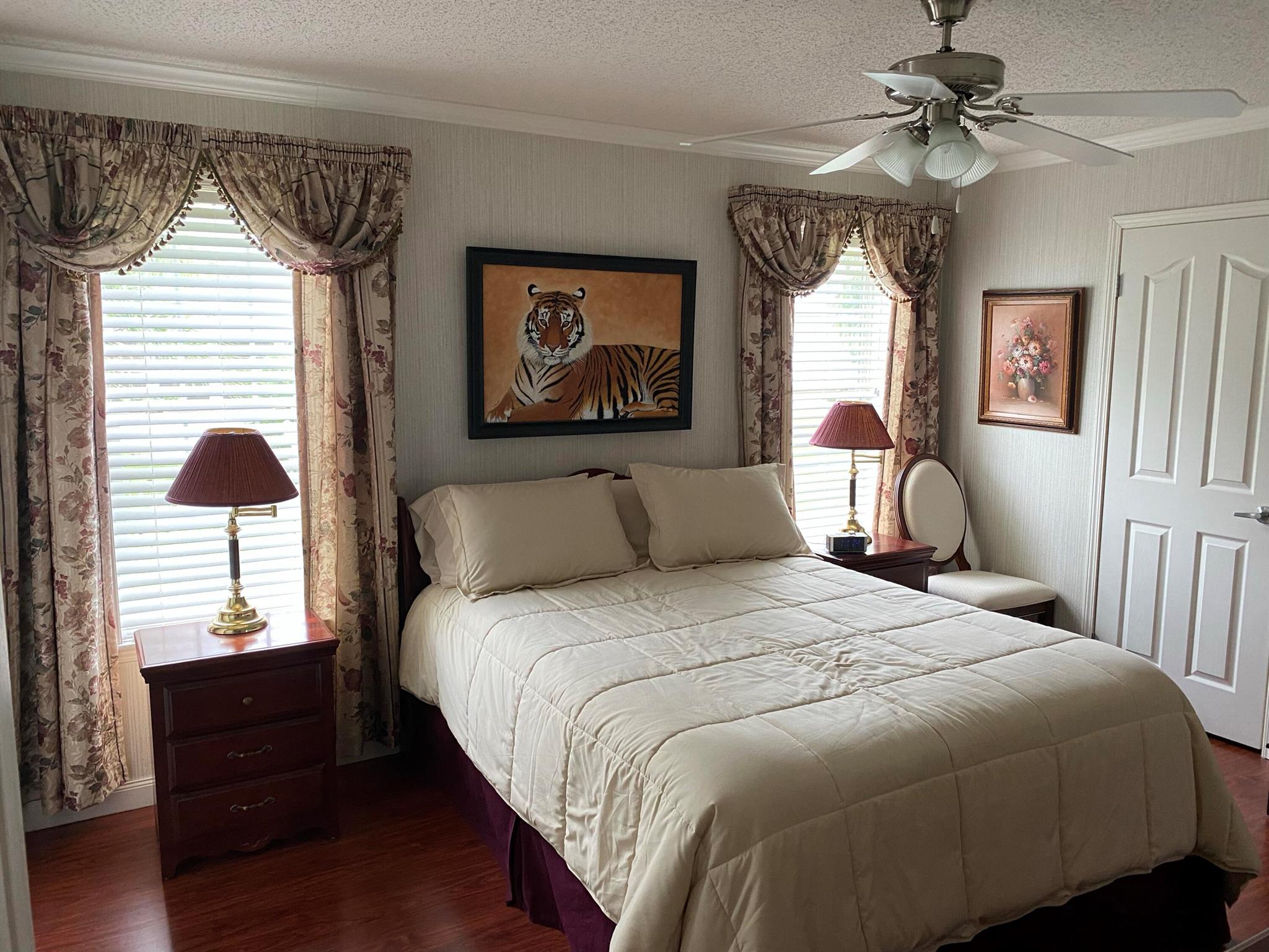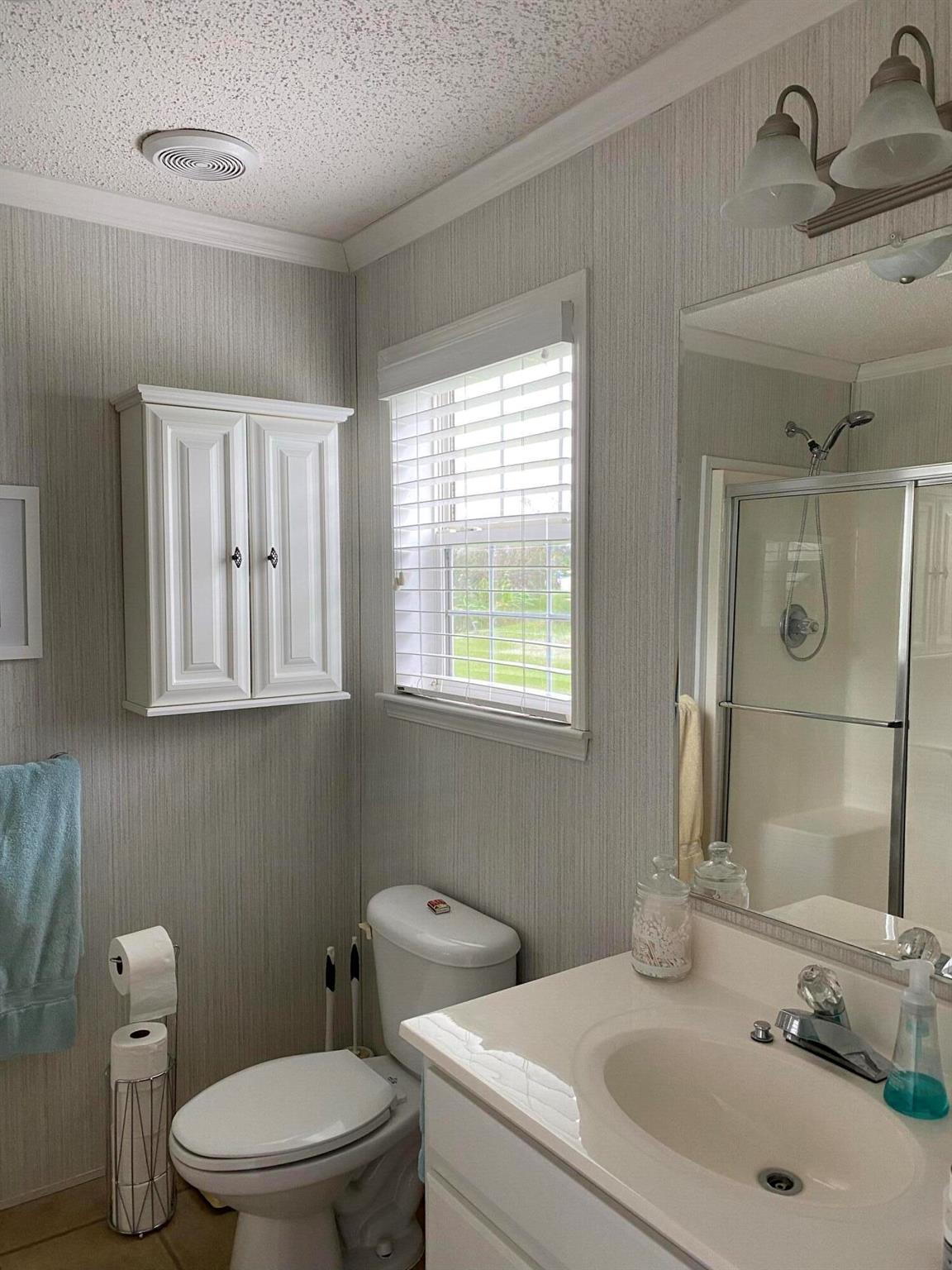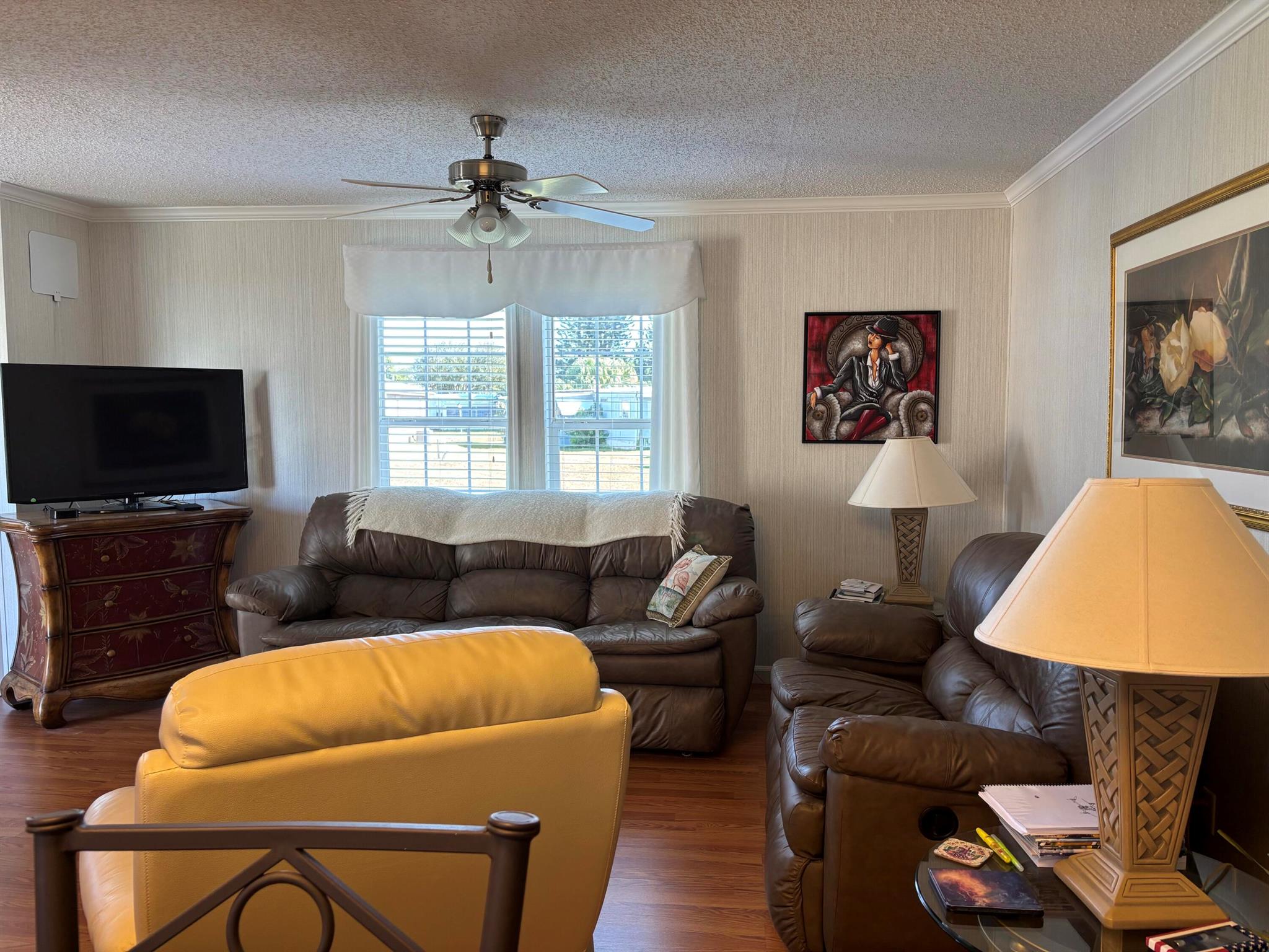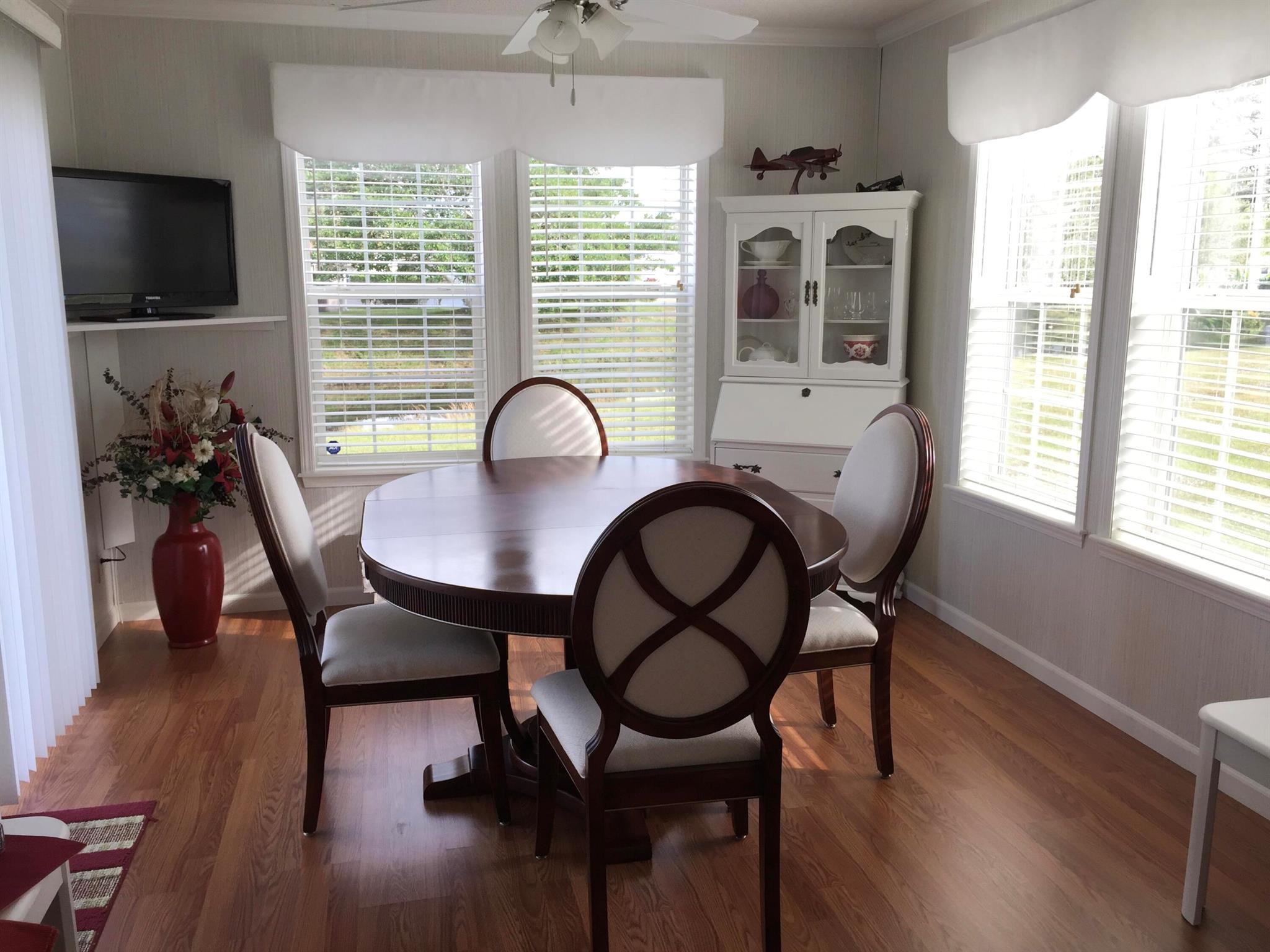Leased Lot $910.60, This pristine 2bed/2Bath furnished manufactured home with crown molding and new AC 2021. Kitchen is open and includes large island, inside laundry, laminate flooring. Large private screened porch and solar shades. Located in a 55+ community, Spanish Lakes One provides a relaxed yet vibrant lifestyle for active seniors. Enjoy resort-like amenities, including a community clubhouse, free golf, social events, tennis courts, and pool. Park approval is required to purchase.