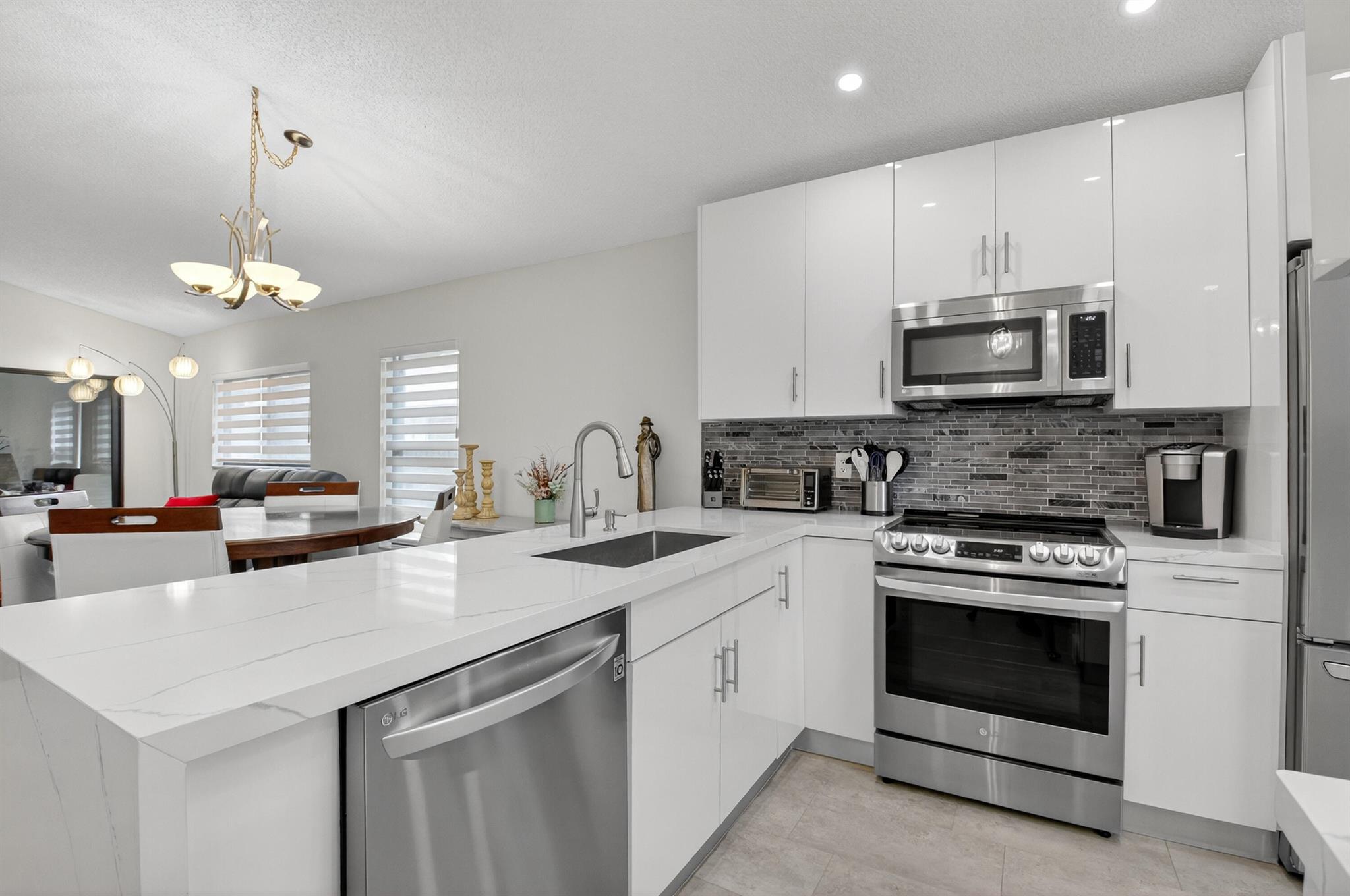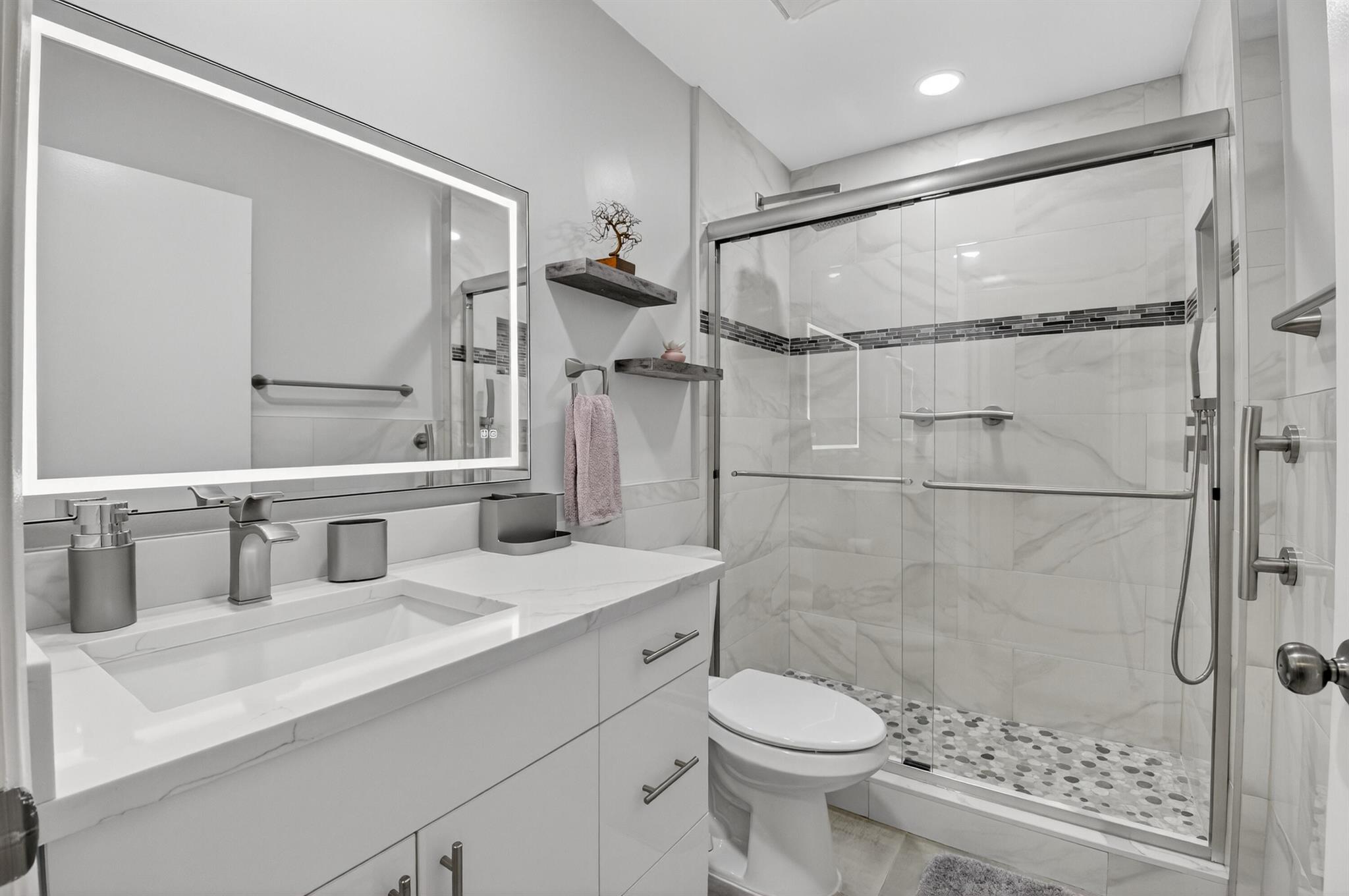 Move in Ready! Exquisite totally redone 2 BR, 2 Full Bath plus air conditioned Bonus Room to be used as office or 3rd bedroom if you prefer. This corner villa features the following: Hurricane windows thru out, Beautiful Chefs Kitchen featuring Glass Backsplash, all new GL Appliances, Quartz Countertops, all with designer perfection. New roof, attached garage, brand new A/C, newer H20 heater plus separate laundry room (good for storage) Baths feature gorgeous tiling and vanities with exquisite appointments. Can walk to clubhouse and pool. This gated pristine, parklike, 55+ community features pickleball, tennis fitness center and more. Located near major highways, restaurants, shopping, places of worship and central Boca Raton. Run don't walk...just bring your toothbrush and move in