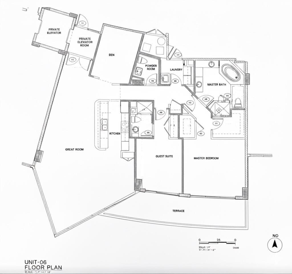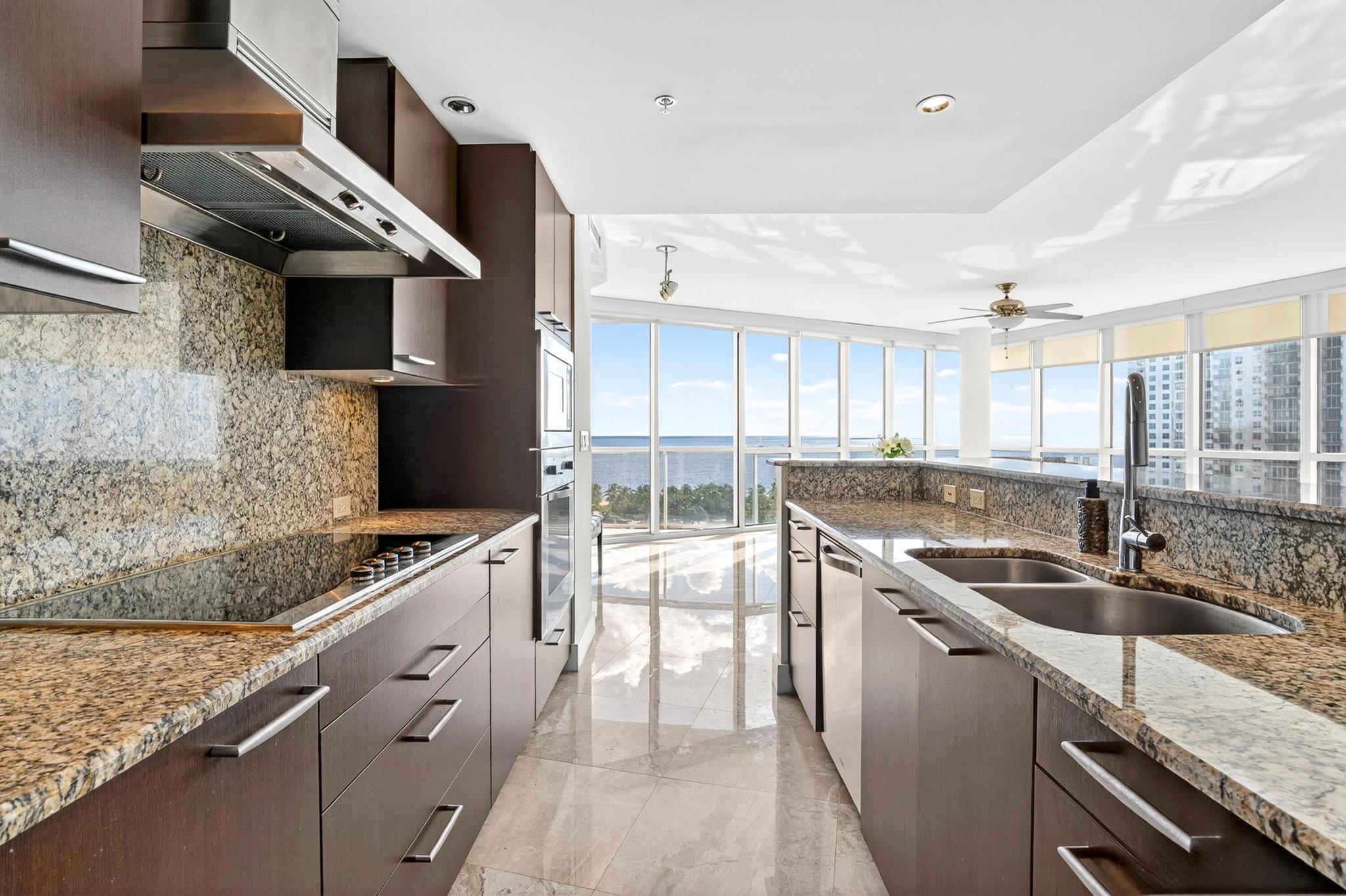 Ocean Luxury: Spectacular 270 degree ocean views, rare high floor -06 line, fully built out den. Panoramic ocean sunrises, floor-to-ceiling glass in every room of this 2BR+1Den/2.5BA open concept layout, unique protruding living room. Italian marble floors, incl. 300 sq. ft. glass terrace. Private elevator foyer. Custom installed den: frosted doors, 2 workstations, storage, full closet, queen Murphy bed--great for remote work/guests. Fiber optic internet. 2 garage spaces, storage unit. World-class, 5-STAR amenities: resort pool, tennis courts, News Cafe breakfast, modern gym, spa/saunas, theater, lounge, bar, virtual sports simulators, wine room. Sold furnished as-is. BUYER AGENTS WELCOME.