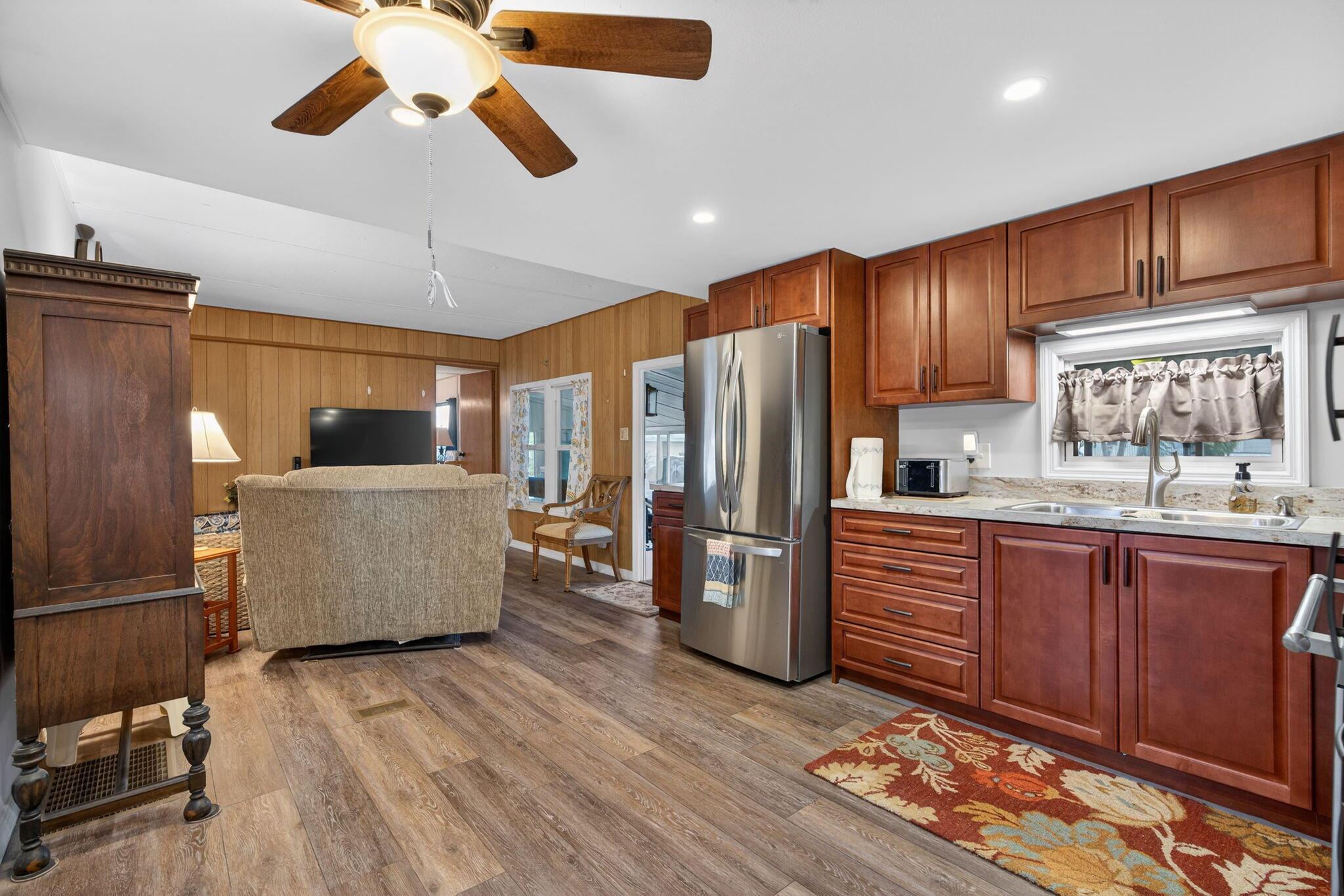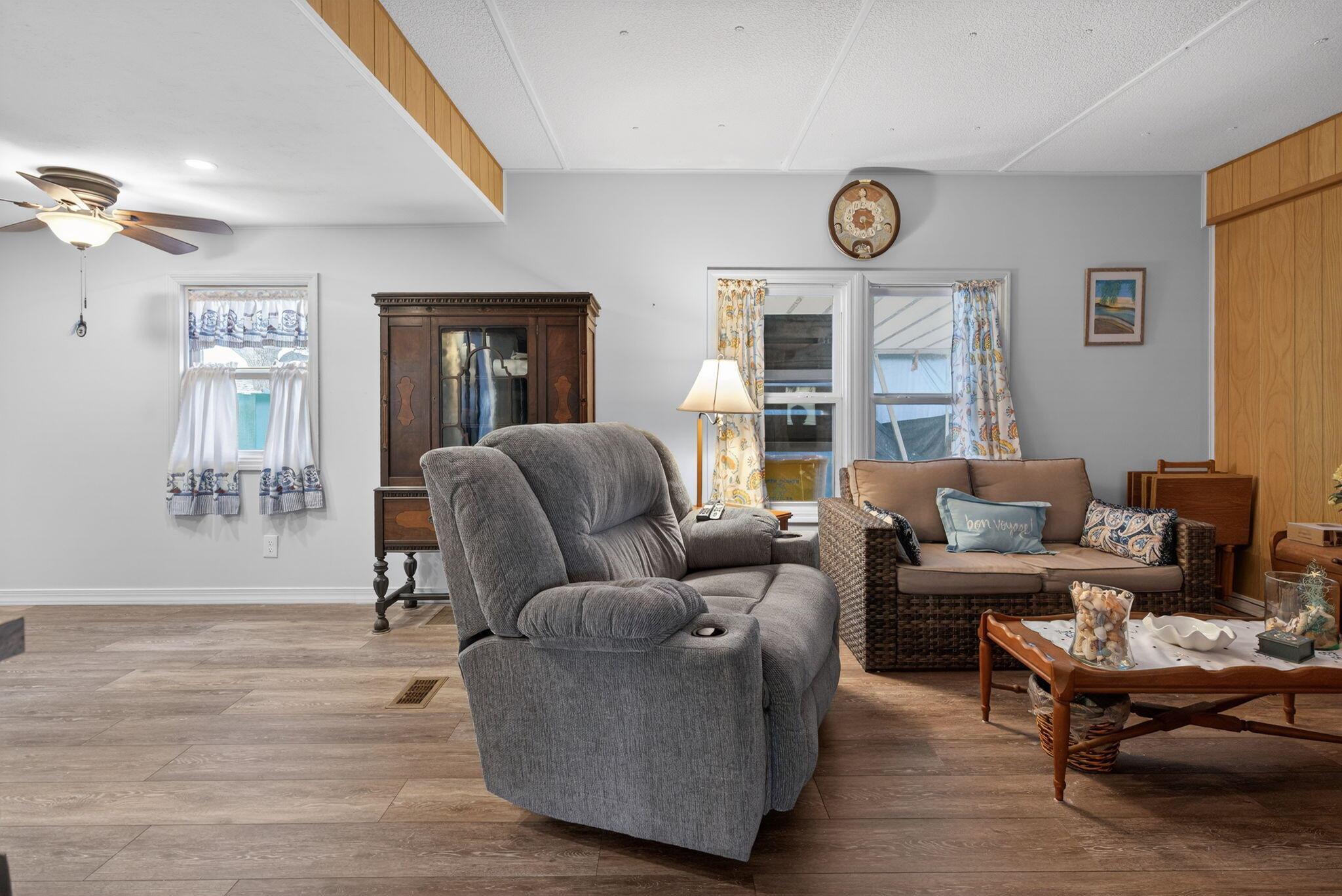 This updated 2BR/2BA Co-op home sits on a desirable corner lot in the 55+ community of Woodbridge Mobile Village. Since 2021, improvements include soft-close kitchen cabinets, new appliances, hot water tank, updated electric, water softener, sprinkler system, new windows, new flooring, remodeled master bath, new porch, and new roof. The home features an enclosed porch, carport, and utility shed. Lot rent is $250/month and includes cable, garbage, pool access, community washer/dryer, events, and more. Close to Hobe Sound's beaches, shops, and dining.