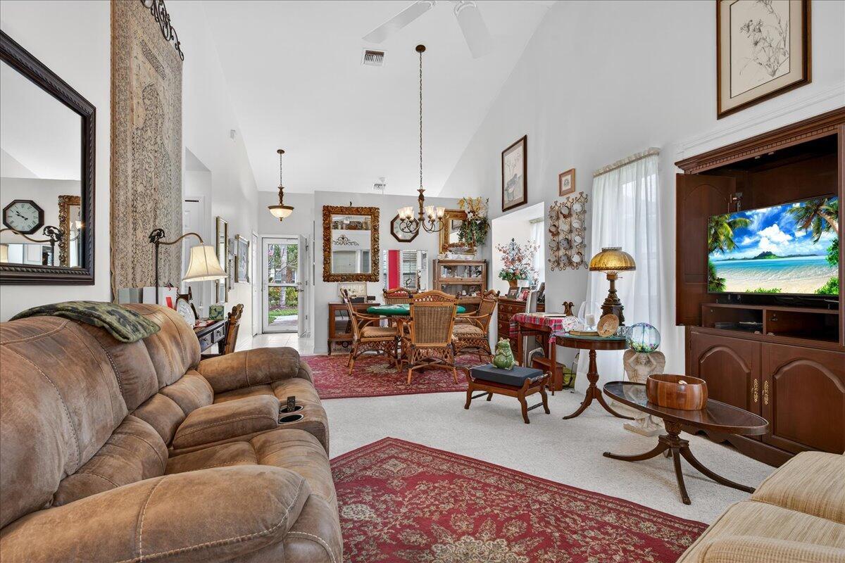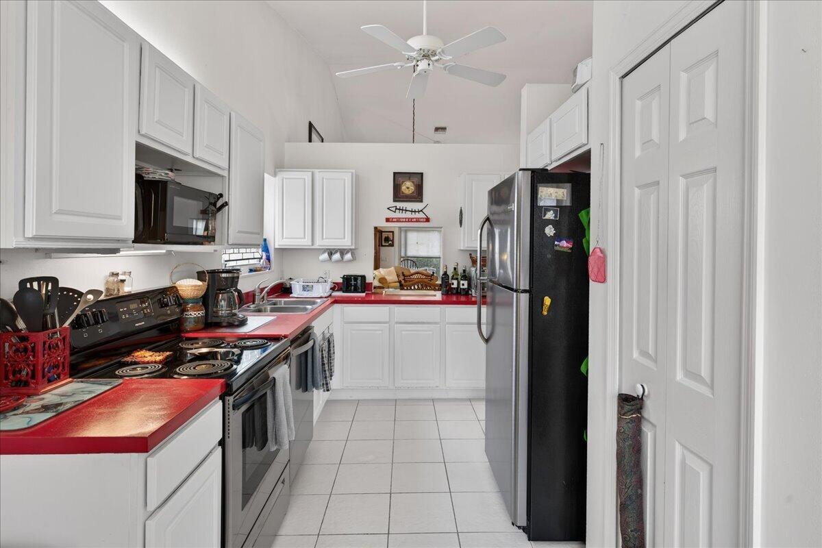 Single-story, courtyard condo with attached garage! Soaring ceilings! Private Florida room with full-sized laundry! Super storage in interior attic with pull-down stairs, plus attic in garage. Handy garage entrance to eat-in kitchen. Impact windows! Roof -2018. AC 2022. Building re-pipe 2023. HW 2025. Many furnishings included! 8 miles to the beach! Island clubhouse with heated pool, fitness center, tennis/pickleball/racquetball, library, billiards, more!