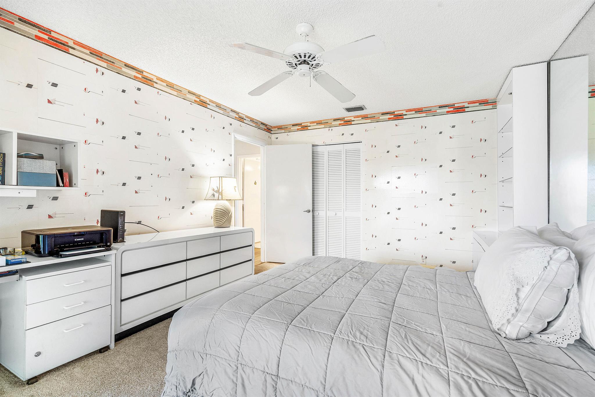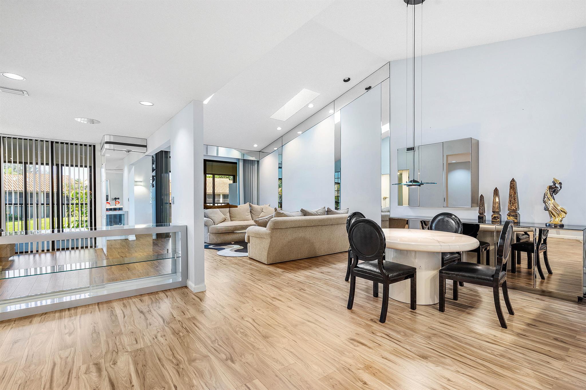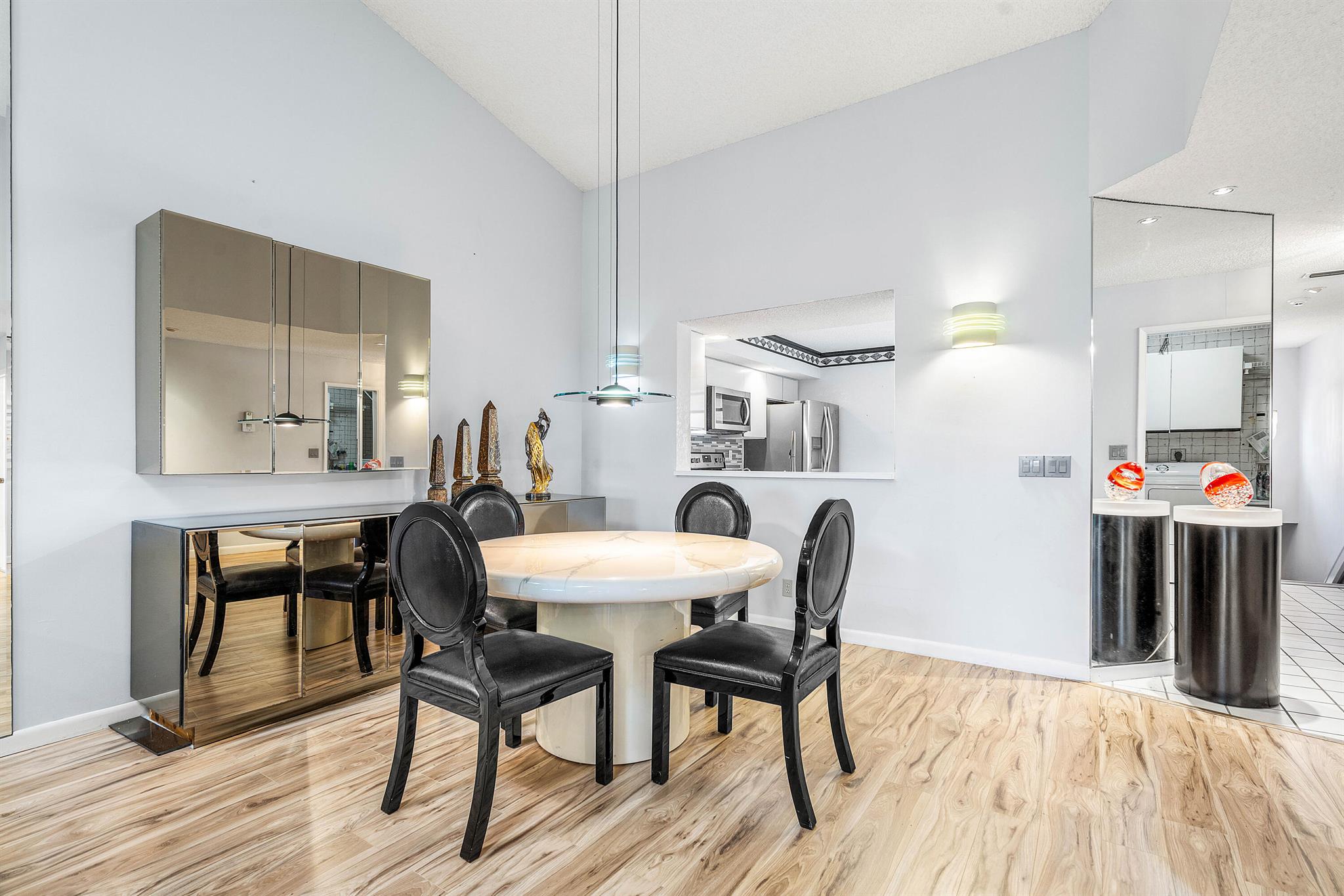 Welcome to 7977 La Mirada Drive in Boca Pointe. This spacious two-story home features an open living and dining area with high ceilings and abundant natural light. The kitchen includes white cabinetry, stainless appliances, and a breakfast nook with garden views. The third bedroom has been converted into an office/den currently used as an extra seating and entertainment space. Enjoy a large enclosed Florida room with serene lake and garden views. Located in a beautiful gated community with optional club memberships.