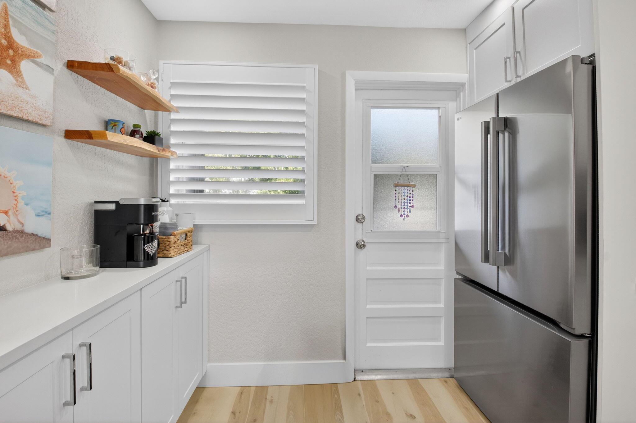 Elegant 2 Bedroom, 2 Bathroom Condo in Tropic Bay - East Delray Beach Marina Community. Experience refined coastal living in this meticulously upgraded residence, featuring a covered balcony within the sought-after Tropic Bay Condominium. Interior features an open-concept layout enhanced by ample natural light. Notable interior elements include plantation shutters, vinyl wood-look flooring throughout. In 2022, kitchen was upgraded with quartz countertops, white shaker cabinets, stainless steel appliances, and brand-new refrigerator (2025). Both bathrooms were renovated in 2022. Air Conditioning Unit installed in 2024, newer water heater replaced in 2023. Washer/Dryer hookups installed in the master closet. Other upgrades include Hurricane-Impact windows/accordion shutters.