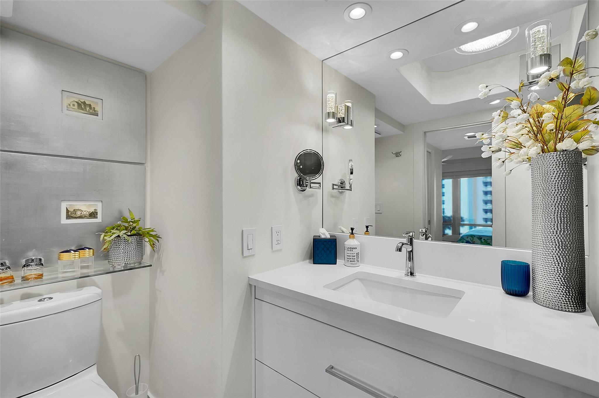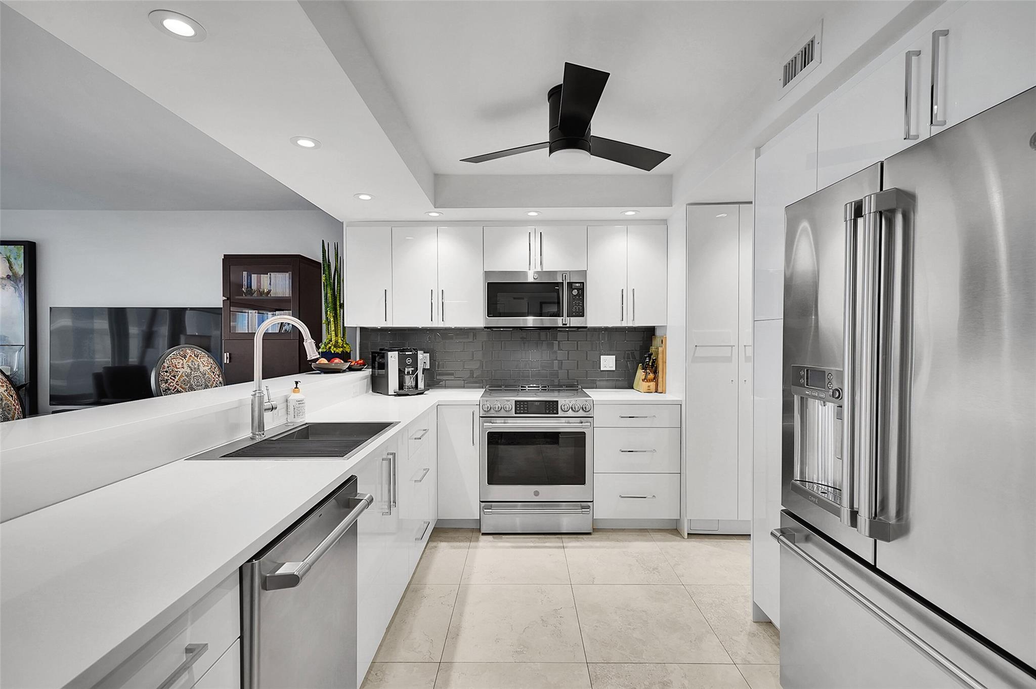 Most beautiful condo for sale in the building by far! This unit's orientation allows you to walk in and see a wide, expansive blue ocean not blocked by another building. Expertly renovated with kitchen opened to the living space & view. Brand new washer/dryer and ceiling led recessed lights are just a few new features. Kitchen has quartz countertops with induction cooking. All closets have built in systems as well as an additional wardrobe closet in bedroom. Impact windows & Door Too! The large balcony lets you enjoy ocean breezes without the direct hot sun beating down on you. Secure garage parking close to the elevator with 24hr doorman & security. Full amenties include gym, sauna, community room and private beach with chairs & Umbrellas. New Resort style pool and deck underway.