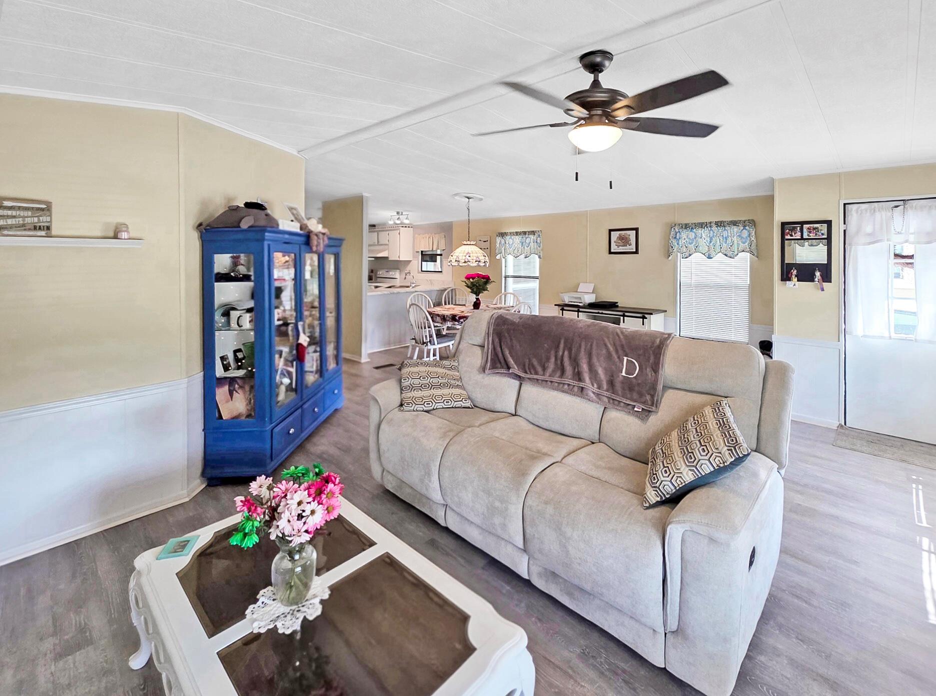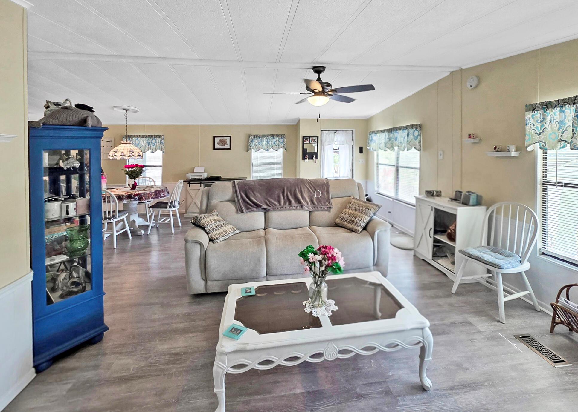 Welcome to Spanish Lakes, a popular 55+ community in Vero Beach. This furnished 2BR/2BA manufactured home features a bright, open layout with a spacious living room and plenty of natural light. The kitchen offers newer countertops, updated fixtures, and ample cabinetry. Updates include LVP flooring throughout, updated electrical and plumbing (2021), new faucets, washer & dryer (2021), and freshly painted interior and exterior. Major improvements include roof (2021), A/C (2020), updated tie-downs (2021), and skirting (2022). Located on leased land ($828/month). Spanish Lakes offers golf, fitness center, pool, pickleball, tennis, shuffleboard, library, and an active social lifestyle near shopping, dining, and beaches.