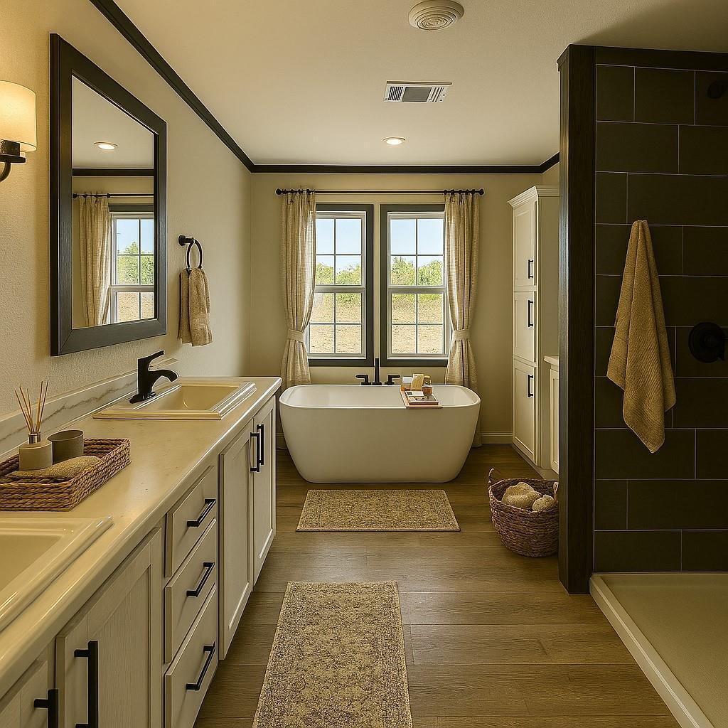 Brand New 3BR/2BA | 1.25 Acres | Prairie/Viking Community Move-in ready and beautifully upgraded with an oversized 20x8 deck, this 1,493 SqFt Champion Embrace home offers a modern split floor plan with warm wood tones, accent walls, and contemporary interior design throughout. The spacious kitchen features a coffee bar, built-in microwave, pantry cabinet, large island with pendant lighting, and contrasting countertops. A separate dining area flows into the inviting living room, while the interior laundry room includes built-in cabinets and a hanging rack for added convenience. The private primary suite is designed for comfort, offering a standalone soaking tub, oversized walk-in shower, double vanity, and tall linen cabinet.