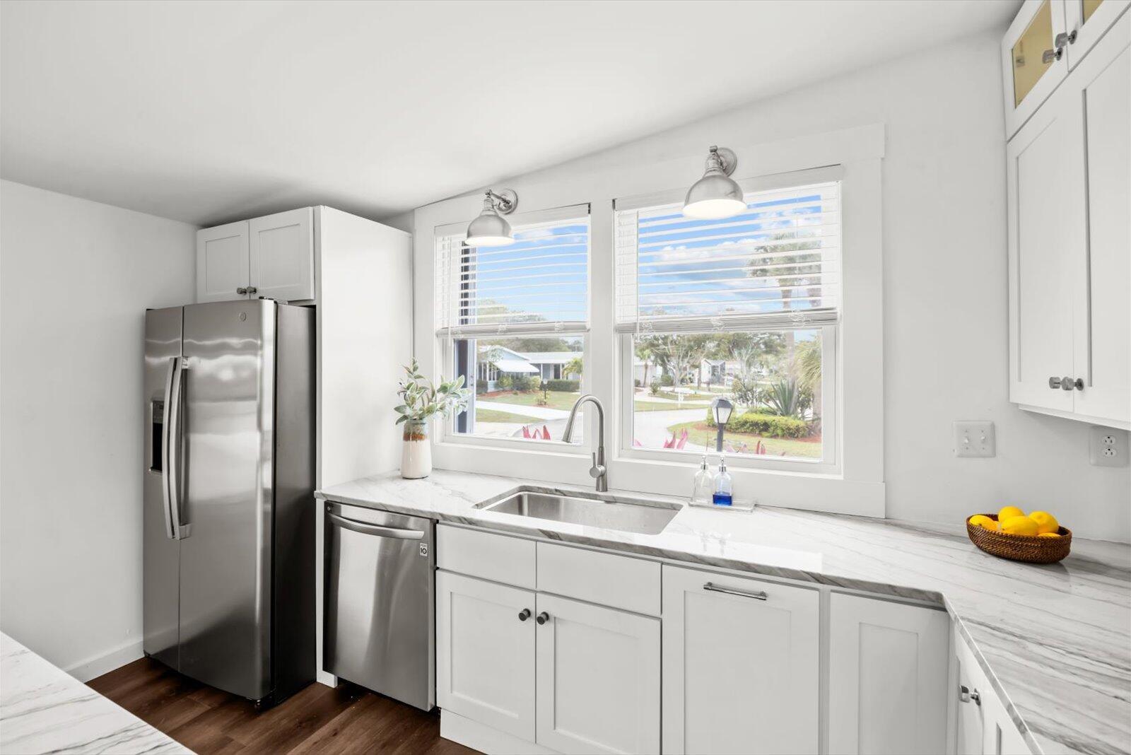 Land Owned and Lakefront! - Beautifully remodeled 2/2 ready for you to move right in! Home has extensive remodel including new kitchen w/ quartz, SS appliances, new floors thru/out, new bath vanities, tiled showers, glass enclosures, New A/C, HWH, new windows, impact sliders, accordion shutters and more! You must see this beauty in the Savanna Club 55+ community.