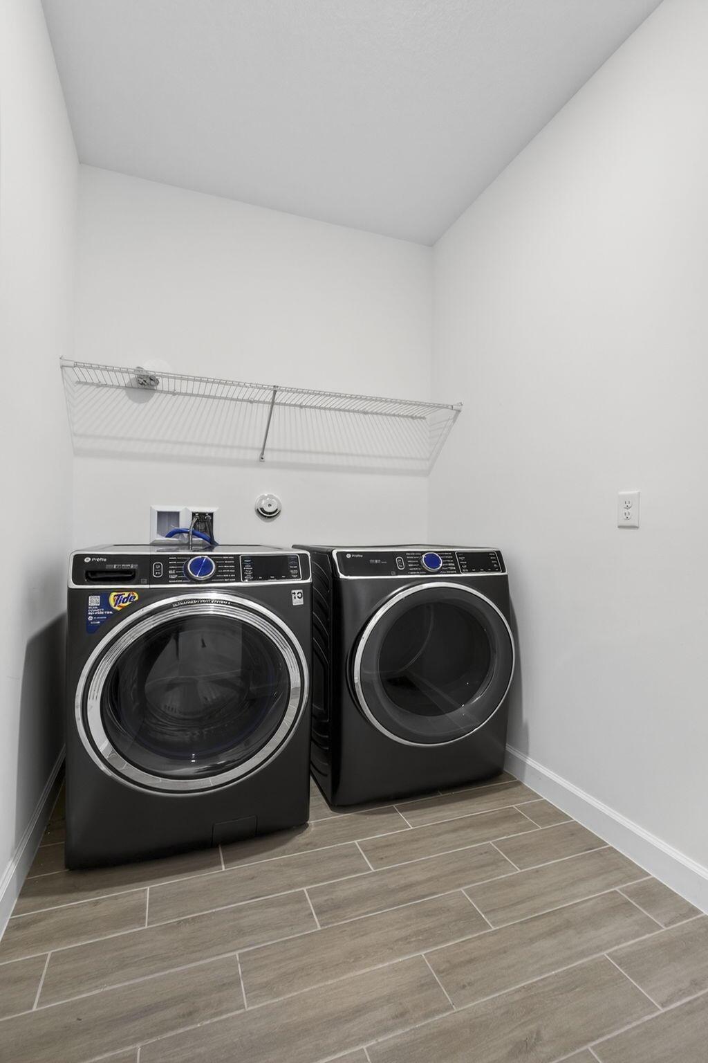Modern villa with upgraded wood-like tile flooring, premium upgraded appliance package, and premium lot backing to green space. Arden resort community has high-end amenities and low HOA fees. Built in 2023 this 3 bedroom duplex-style villa with 2-car garage has full impact windows, quartz countertops in the kitchen with tile backsplash, natural gas, and a covered patio with yard space. Seller added Ring cameras to the front and side of the home along with an ADT alarm system. Top-rated A+ school district. Enjoy access to Arden's unique farm-to-table lifestyle within a 1,200-acre master-planned neighborhood featuring 20 miles of trails and lakes, a fitness center, tennis and pickleball courts, soccer field, basketball and volleyball courts, boat launch, & resort-style pools with clubhouse.