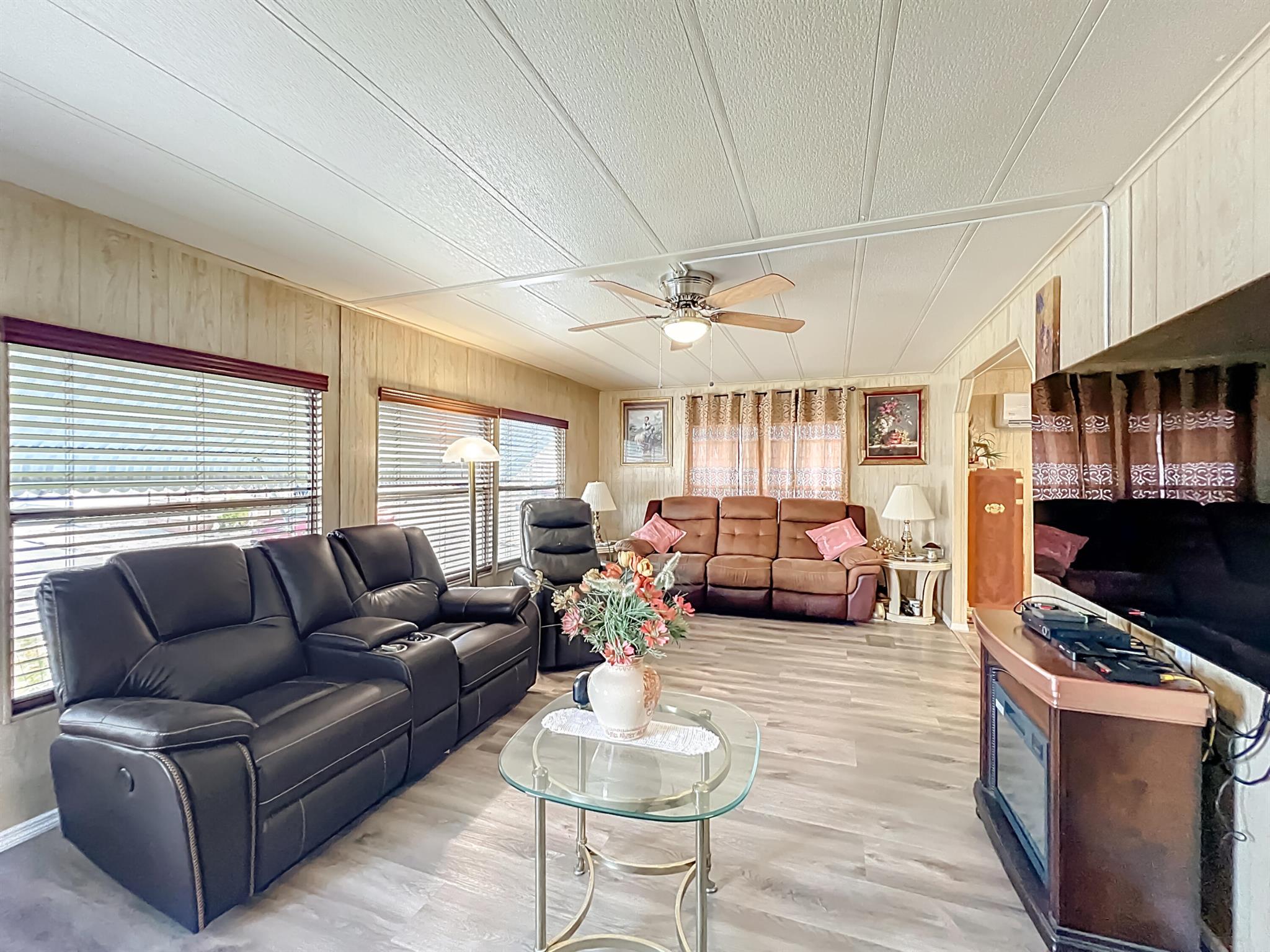 Discover comfortable living in this charming 2-bedroom, 2-bath manufactured home located in a welcoming 55+ community. Low HOA. Situated in a no-flood zone, this property is ideal for downsizing or first-time homebuyers seeking affordability and peace of mind. The open floor plan creates a warm, inviting atmosphere that's perfect for entertaining or relaxing with family. Both bedrooms are spacious, complemented by two full bathrooms for added convenience. To maximize comfort and efficiency, the home includes three brand-new A/C units strategically placed throughout--helping you save on electricity by reducing the need for central HVAC use. With low-maintenance living in a desirable location, this home is a wonderful opportunity you won't want to miss!