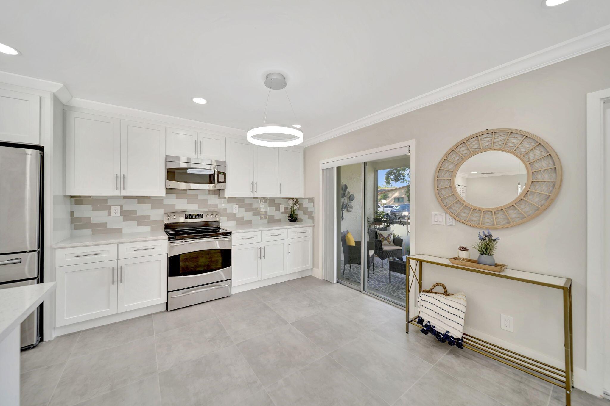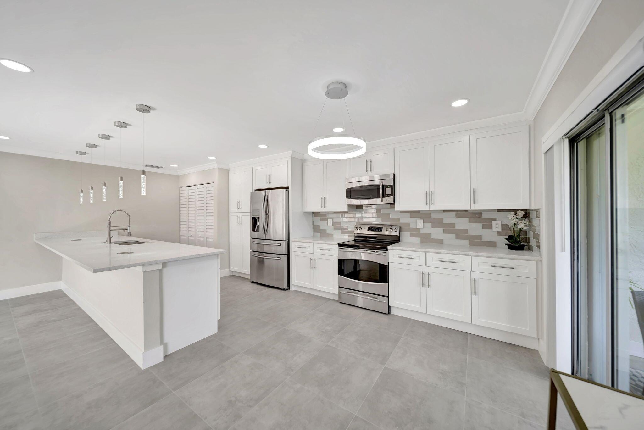 Crisp, captivating elegance. Entirely renovated open floor plan villa designed for easy living with low HOA monthly fees. This is the kind of home where everything is already done. No projects. Just unpack and enjoy. Stunning 24x24 porcelain tile inside, on the screened patio, and outdoor patio -durable, elegant, and far superior to ceramic. 51/2'' baseboards, crown molding, new interior doors, and updated hardware throughout. A show-stopping 12.5-foot quartz island with a 12'' overhang for bar stools and two electrical outlets. Stainless steel appliances. 26 recessed LED high-hat lights with dimmers + under-cabinet lighting. Eat-in kitchen, oversized pantry, and more cabinetry than you'll ever need.