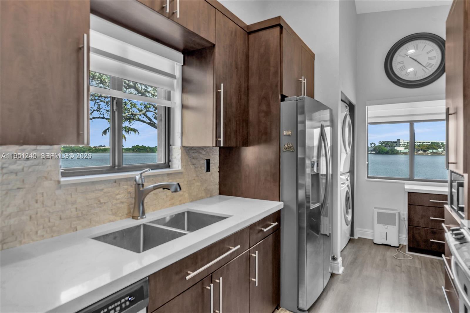 Beautiful 2-bedroom, 2-bath residence offering crystal blue water views of Celebration Point Lake from every room. This unit has been thoughtfully redesigned with an open kitchen featuring quartz countertops, luxury vinyl flooring, stainless steel appliances, and a full-size front-loading washer and dryer. High ceilings with attic access enhance the spacious feel. Custom features include built-in closets, sleek pocket doors, a designer headboard in the primary suite, and a stunning accent wall with an electric fireplace. Additional highlights: zebra blinds, accordion shutters, Titan tankless water heater, and energy-efficient custom dimmer LED lighting throughout. The property is situated just steps from Main Street’s premier shops, dining, and entertainment. Move-in ready and all of the furniture and art you see can stay. This is a perfect place to call home with a Low HOA, Pool, Jacuzzi, walking path and more. Schedule your showing Today!