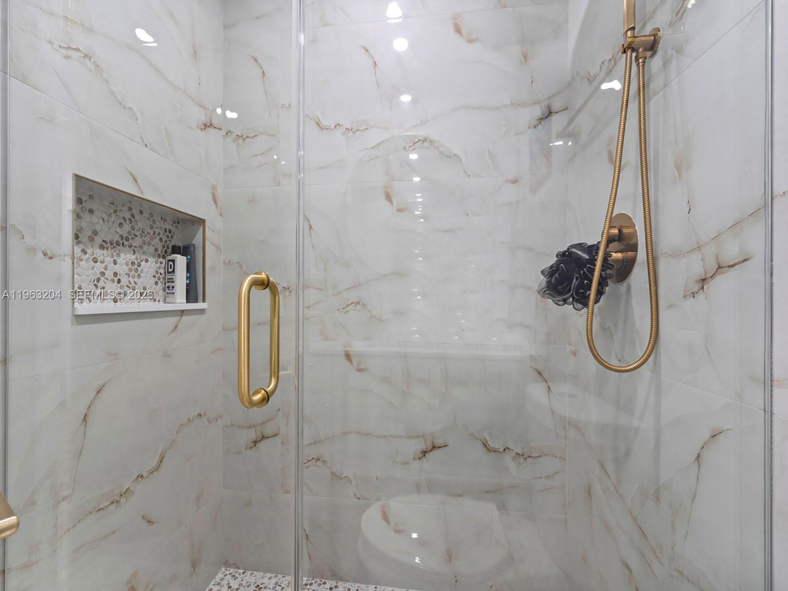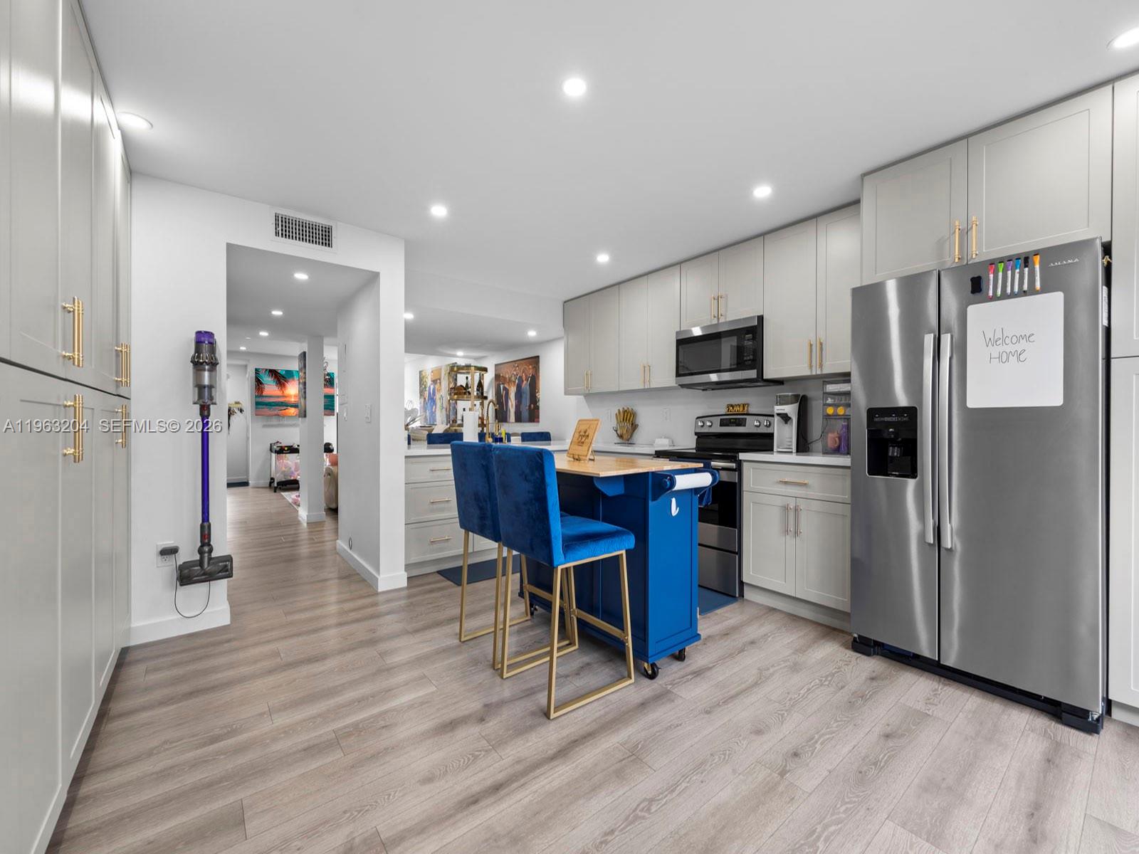 Welcome to this rare, design-forward, completely turnkey home that stands out from anything else currently available in the community, this is not your average home. Fully remodeled inside & out, featuring new floors, ceilings, walls, recessed lighting throughout & impact windows & doors. The open-concept downstairs offers a bright, modern layout ideal for entertaining and everyday living. Major systems have been upgraded, including a tankless water heater,3-ton A/C (2023), all-PVC plumbing, and a Google Nest thermostat. The home also includes an LG Touch stacked washer and dryer. Both bedrooms feature private en-suite bathrooms, with an additional half bath downstairs. Each bedroom closet is custom built-in furniture, complemented by custom carpentry throughout the home. The primary suite offers a spa-like experience with a double rainfall shower and blackout blinds. Enjoy a private backyard with a spa/hot tub, perfect for relaxing or entertaining. The front entry has been upgraded with modern exterior tile flooring creating strong curb appeal and welcoming feel. The property offers a private outdoor space & multiple homes within the community have expanded or reconfigured their layouts, making this home especially attractive for buyers seeking long-term flexibility. Additional features include, zebra blinds throughout, new PVC closet doors, direct parking & ample guest parking throughout the community along with a pool & security.A true gem,hurry it will not last
