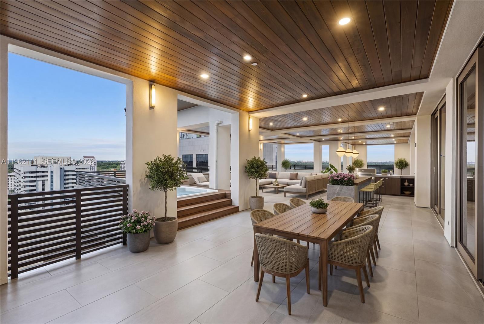 A rare opportunity at Villa Valencia: this full-floor, builder-ready 4-bed, 5.5-bath penthouse residence offers nearly 11,000 SF total, including approximately 4,000 SF of open terrace space designed for elevated outdoor living. Enter via direct elevator to a private foyer, opening to a dramatic living area framed by 10-ft floor-to-ceiling glass doors and windows, showcasing breathtaking vistas of the City Beautiful and the Granada Golf Course. Delivered as a blank canvas, the home is primed for a buyer to bring their vision to life. The expansive wraparound terraces are envisioned with summer kitchen, wet bar, and pool-in-the-sky potential, creating seamless indoor-outdoor flow. The sweeping floorplan includes a lavish primary suite with immense his-and-hers closets and a sumptuous spa bath. The residence is wired for modern home entertainment technology. Villa Valencia, a boutique building of just 39 residences, is distinguished by world-class amenities including a resort-style pool deck, spa, state-of-the-art fitness center, four lounges, library, game room with golf and F1 simulators, and resident kitchens and dining rooms. Available separately: private poolside cabana with jacuzzi, full bath, living room, and kitchenette; two-car garage. A unique opportunity to create a custom masterpiece at this exclusive Gables address.