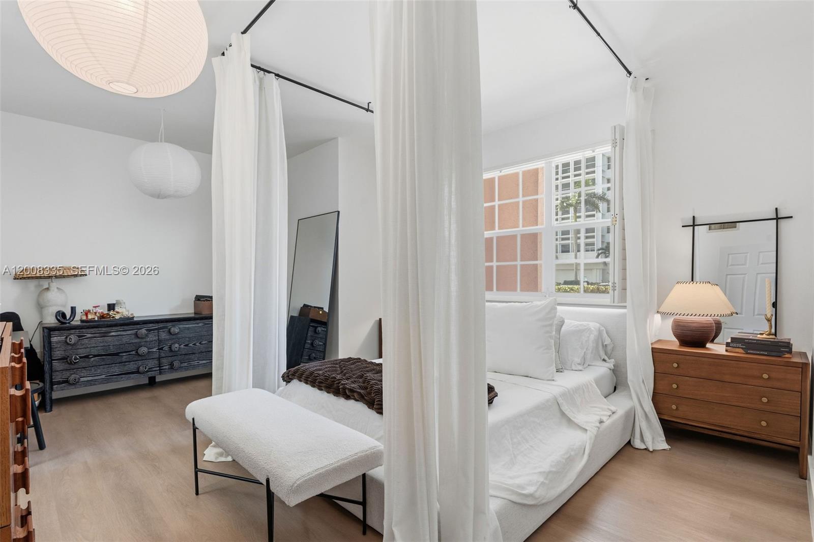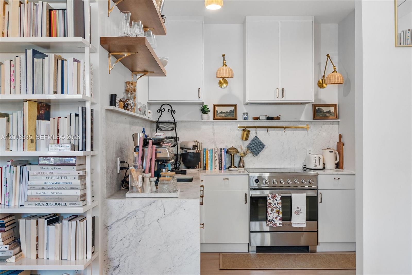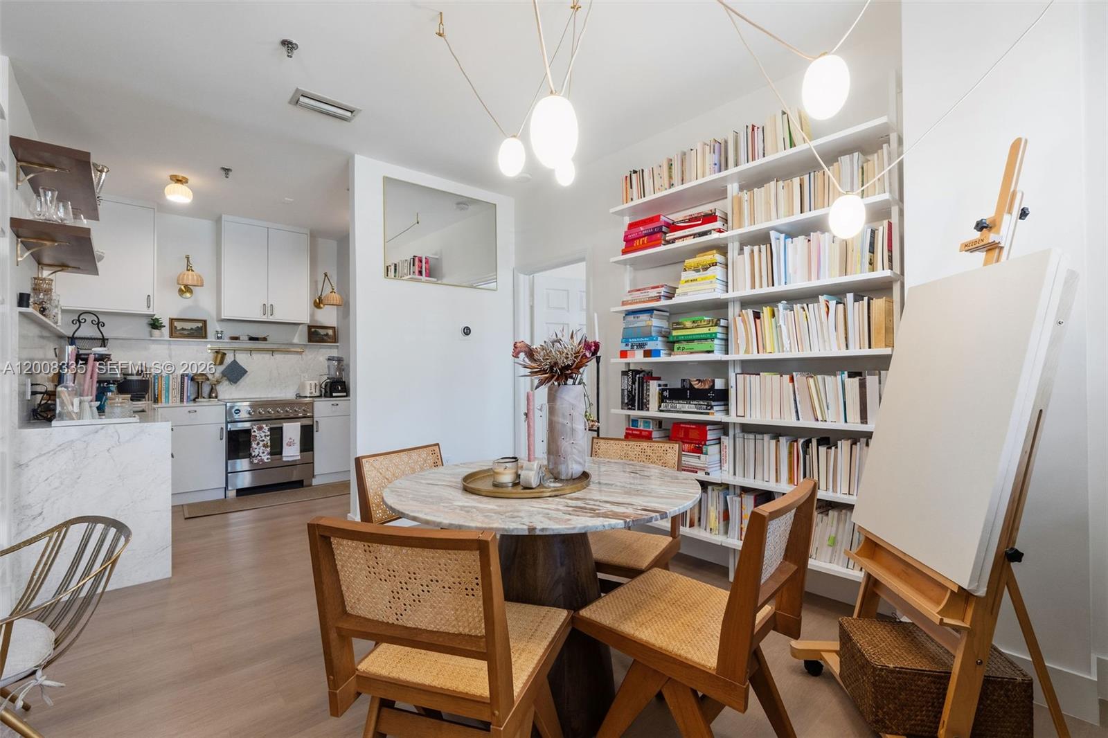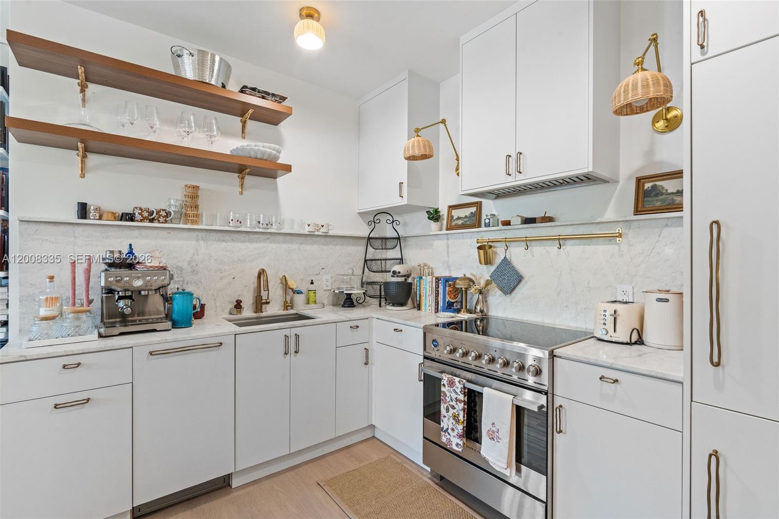 Beautifully renovated 1 bedroom, 1 full bath plus 1/2 bath residence in an elegant Coral Gables building steps away from Miracle Mile. This light filled home features high ceilings and a thoughtfully designed open layout with a custom kitchen showcasing Calacatta Michelangelo dolomite countertops and backsplash, open shelving, designer hardware, and a premium Fisher & Paykel appliance package. Additional highlights include a wet bar with wine refrigerator, Delta faucets throughout, Nest thermostat, and a Cloud water filtration system with dedicated tap. The spacious living and dining areas flow seamlessly for entertaining. The serene bedroom offers a custom walk in closet and a chic en suite bath. Impact windows with shutters, refined finishes, and warm wood flooring throughout. Enjoy resort style amenities including pool, sauna, and BBQ area. Prime location close to shops, dining, parks, and cultural attractions. A truly special turnkey opportunity.
