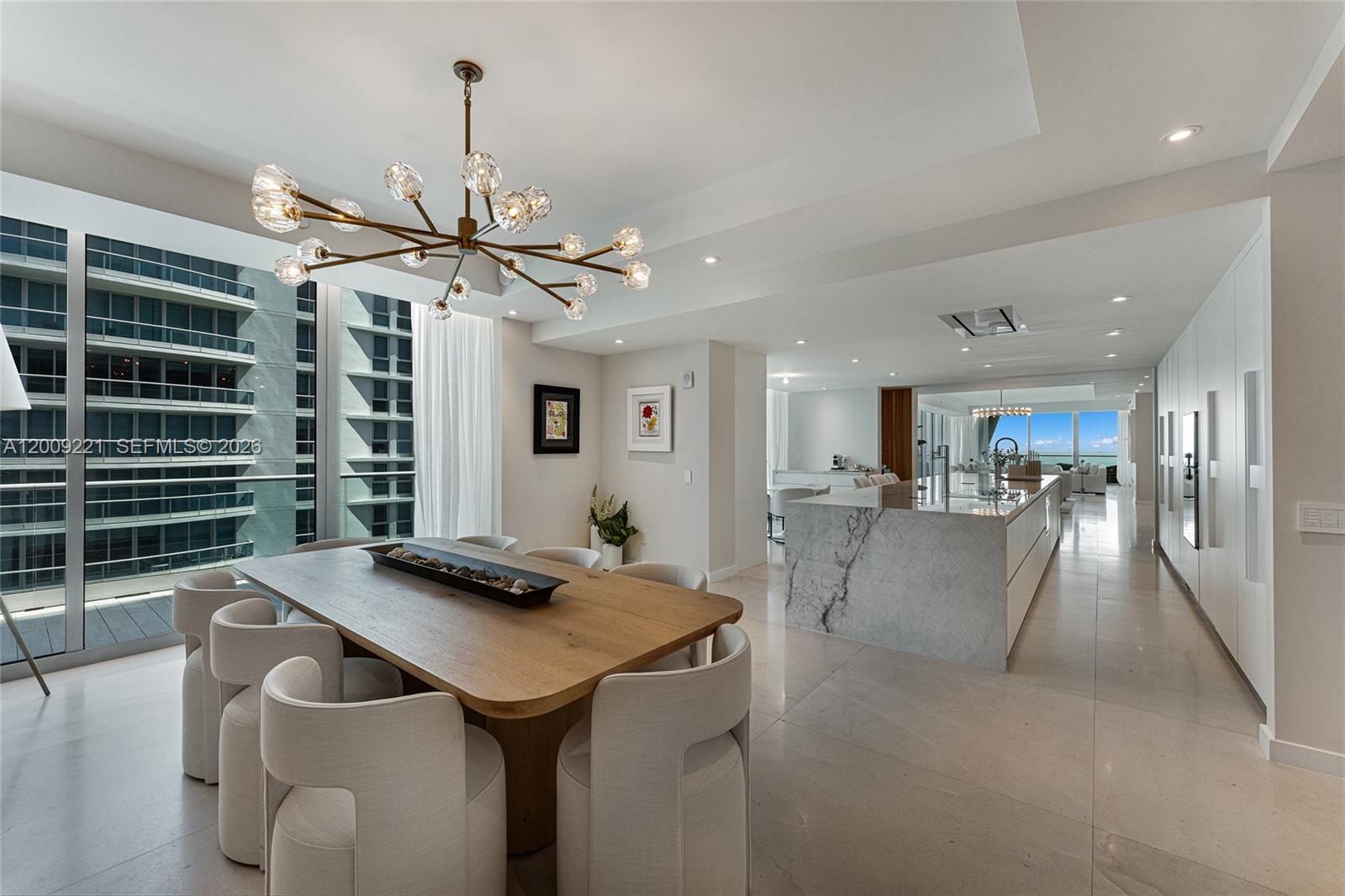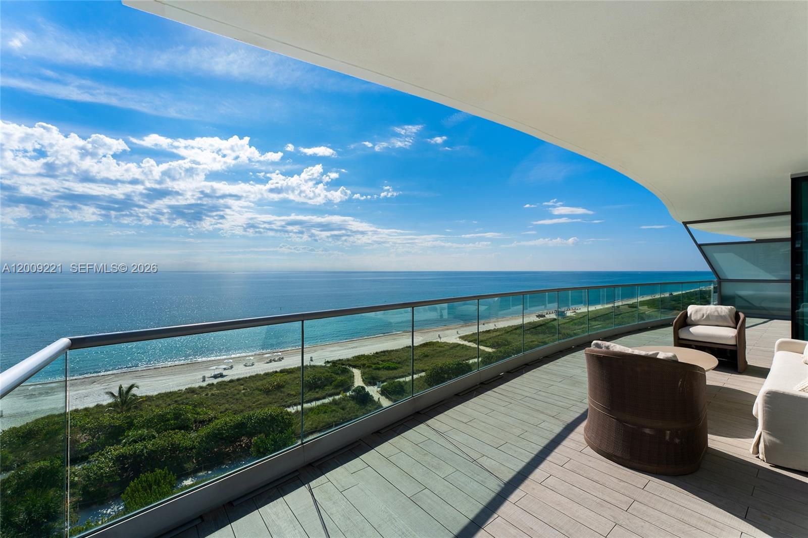 Hear the ocean waves from this direct oceanfront corner unit at Fendi Château Residences. This exceptional 3BR + media room (easily convertible to a 4th BR) offers 5 full bathrooms plus a powder room, spanning 4,487 SF with exquisite large-slab stone floors throughout. Private elevator entry opens to an elegant foyer and expansive living area surrounded by walls of glass, filling the space with natural light and leading to a 1,599 SF wraparound terrace with unobstructed ocean and city views. Designed for true indoor-outdoor living, the terrace features a hidden summer kitchen, multiple lounge areas, and breathtaking sunrise-to-sunset views from the Atlantic Ocean to the city skyline. The sleek Mia Cucina–designed chef’s kitchen features a large granite eat-in island, top-tier Gaggenau appliances, Sub-Zero refrigeration, and dual wine chillers, plus a separate breakfast area. An open dining area with a custom chandelier sits adjacent. The spacious family/media room is accessed behind a custom millwork wall with a discreet hidden door and can be easily converted into a 4th bedroom. The sumptuous principal suite boasts a custom designer walk-in closet, direct ocean terrace access, and dual spa-inspired bathrooms. Two additional west-facing bedrooms feature en-suite baths and terrace access with city views. Additional highlights include a Sonos system, blackout shades in all bedrooms, and a laundry room with a full bathroom. 5-star Fendi amenities complete this amazing offering.