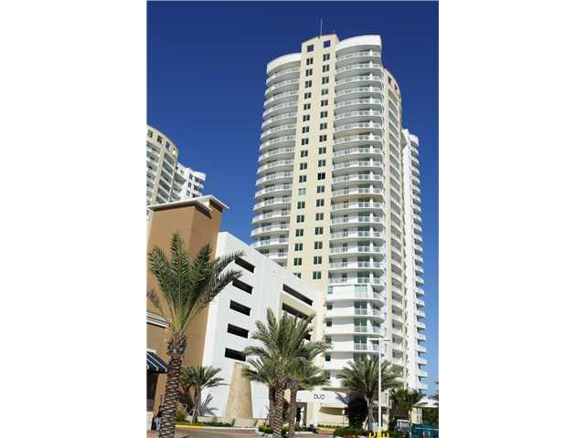 Spacious condo with beautiful golf course, city and sunset views. Designer accents give this unit a modern look and feel. Italian style open kitchen w/stainless steel appliances, wood cabinetry & granite counters. It has carpet throughout and tile in t he kitchen and baths. Duo is within walking distance to the beach and next to restaurants, food markets and shopping. It offers 24 hour security, valet, cyber café, business center, theatre room, pool, gym, billiard room and more.