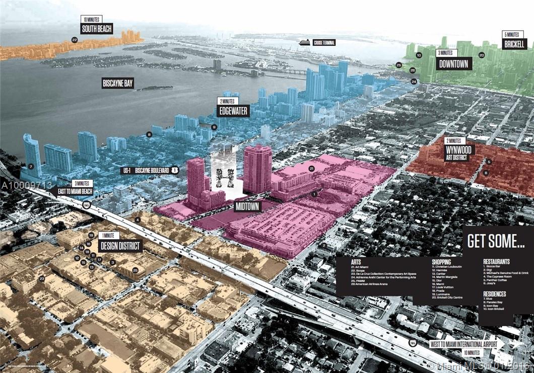 Spacious corner unit, split floor plan with large wrap around terrace. Italian kitchen, ss appliances, stone countertop with island ideal for entertaining. Floor to ceiling windows off master that access terrace, walk in closets, tall unfinished concrete ceilings. Full service building with concierge, gym, pool, steam and sauna. One assigned space, additional with valet. Pet friendly. Steps to everything in Midtown, Wynwood and Design District.